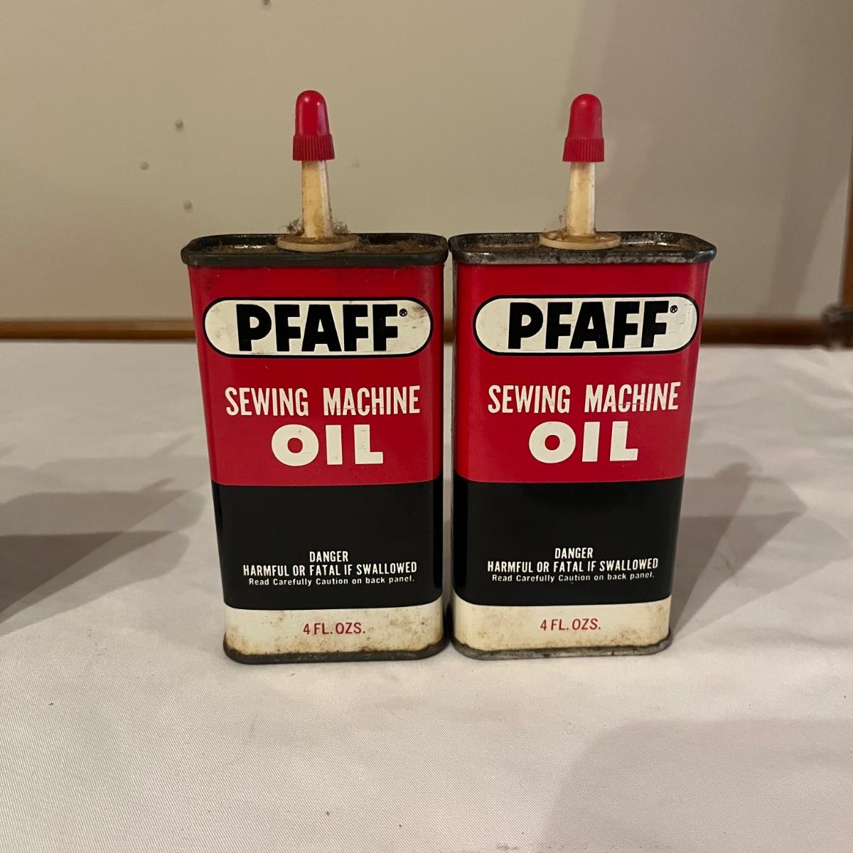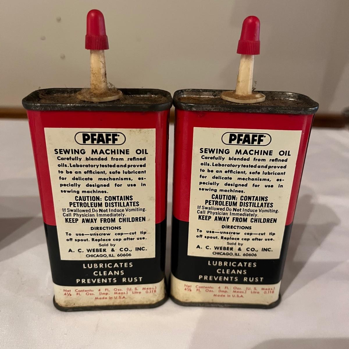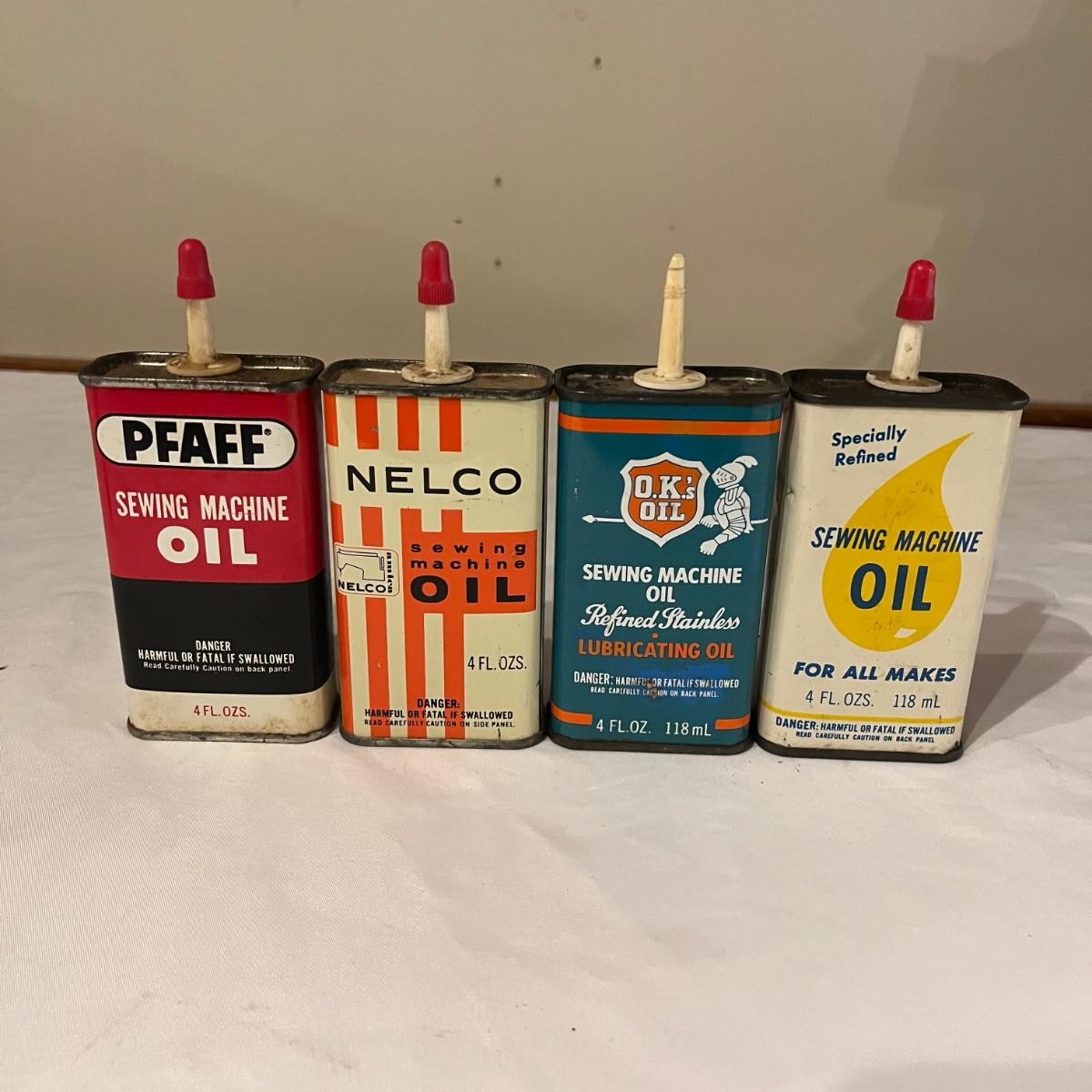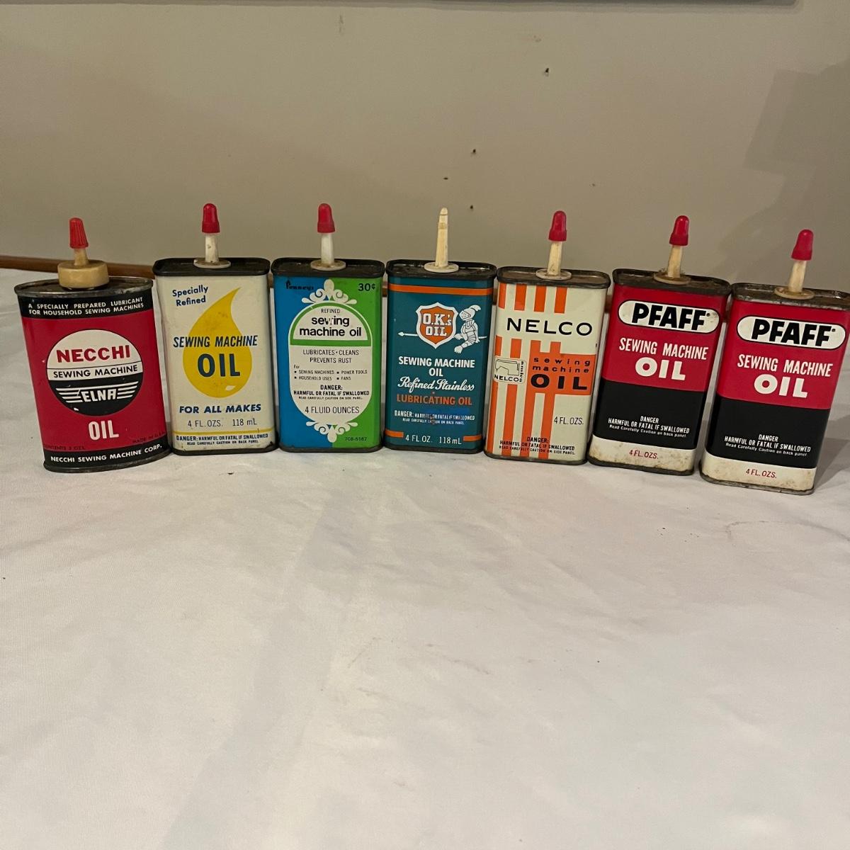 Lot includes seven sewing machine oil cans. Brands include OK, two Pfaff, Nelco, Necchi, Penney’s and one oil can not branded. Cans in last picture have oil in them.