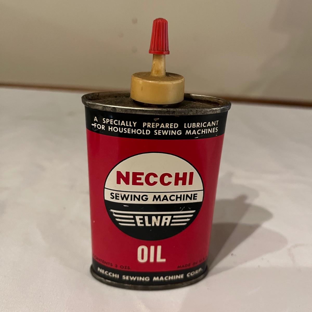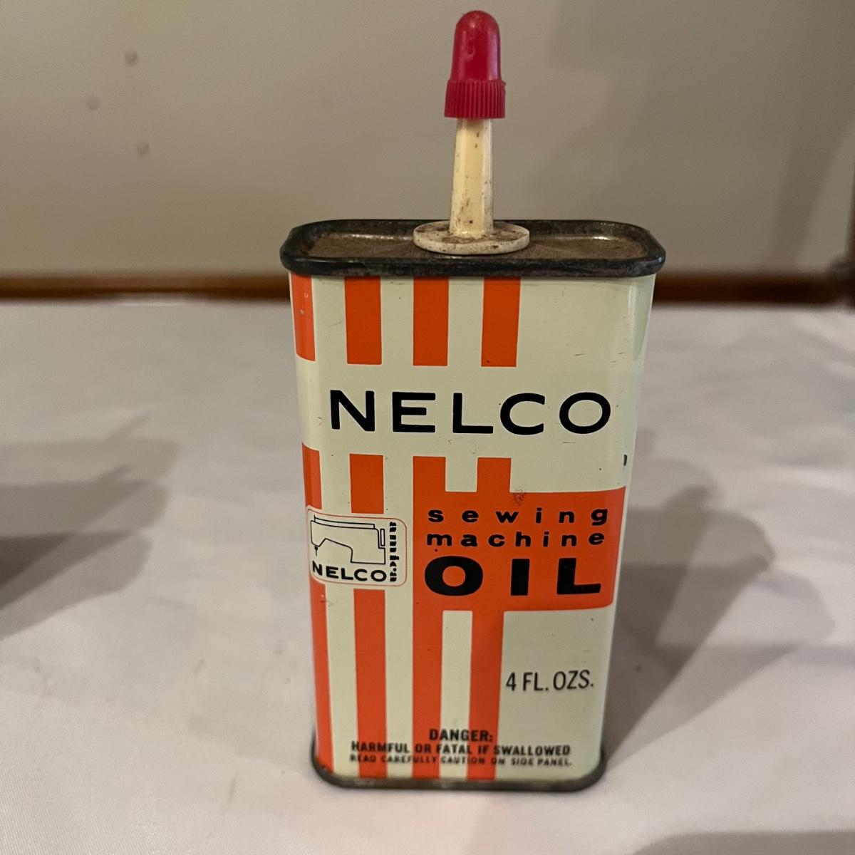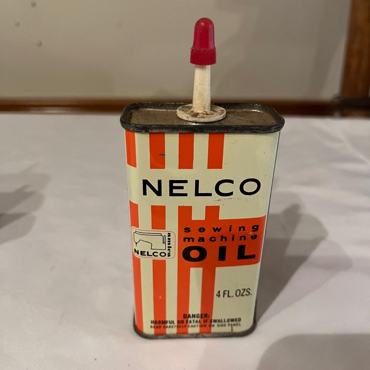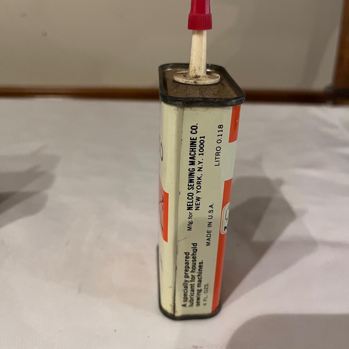 Lot includes seven sewing machine oil cans. Brands include OK, two Pfaff, Nelco, Necchi, Penney’s and one oil can not branded. Cans in last picture have oil in them.