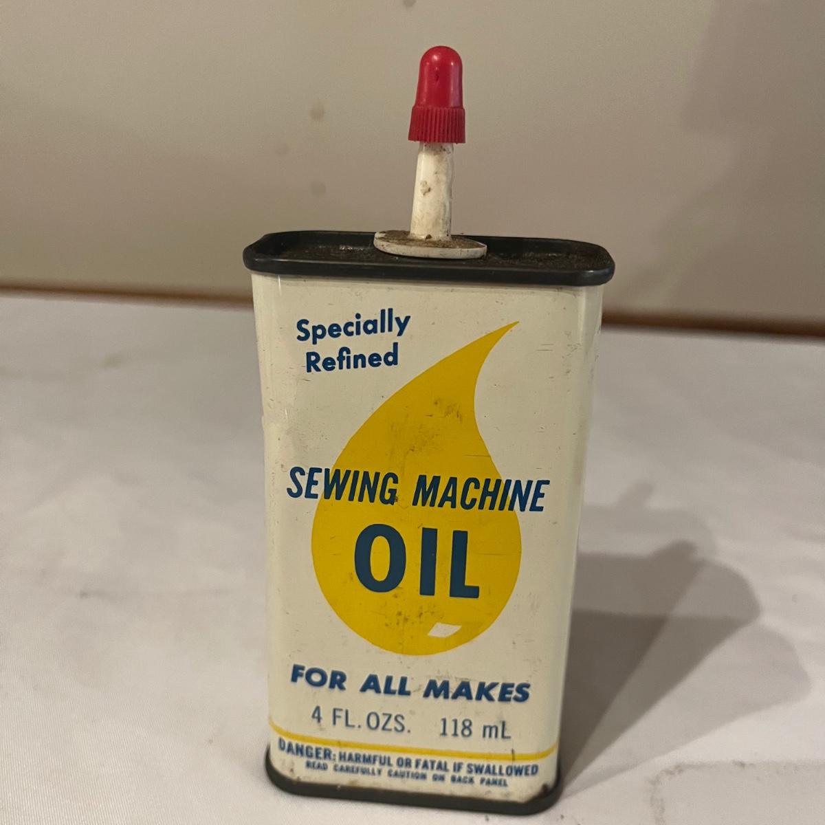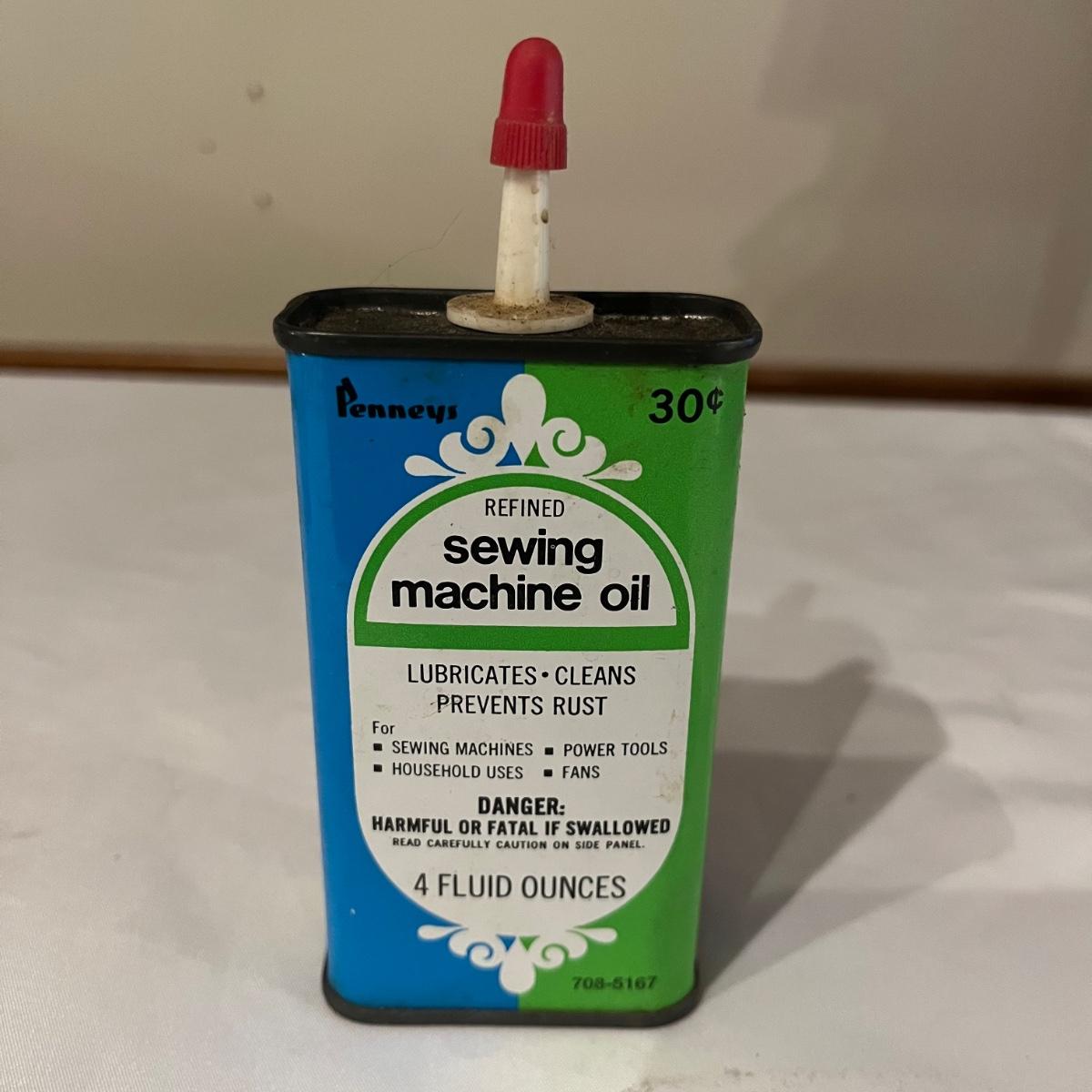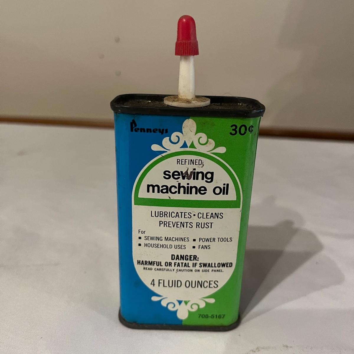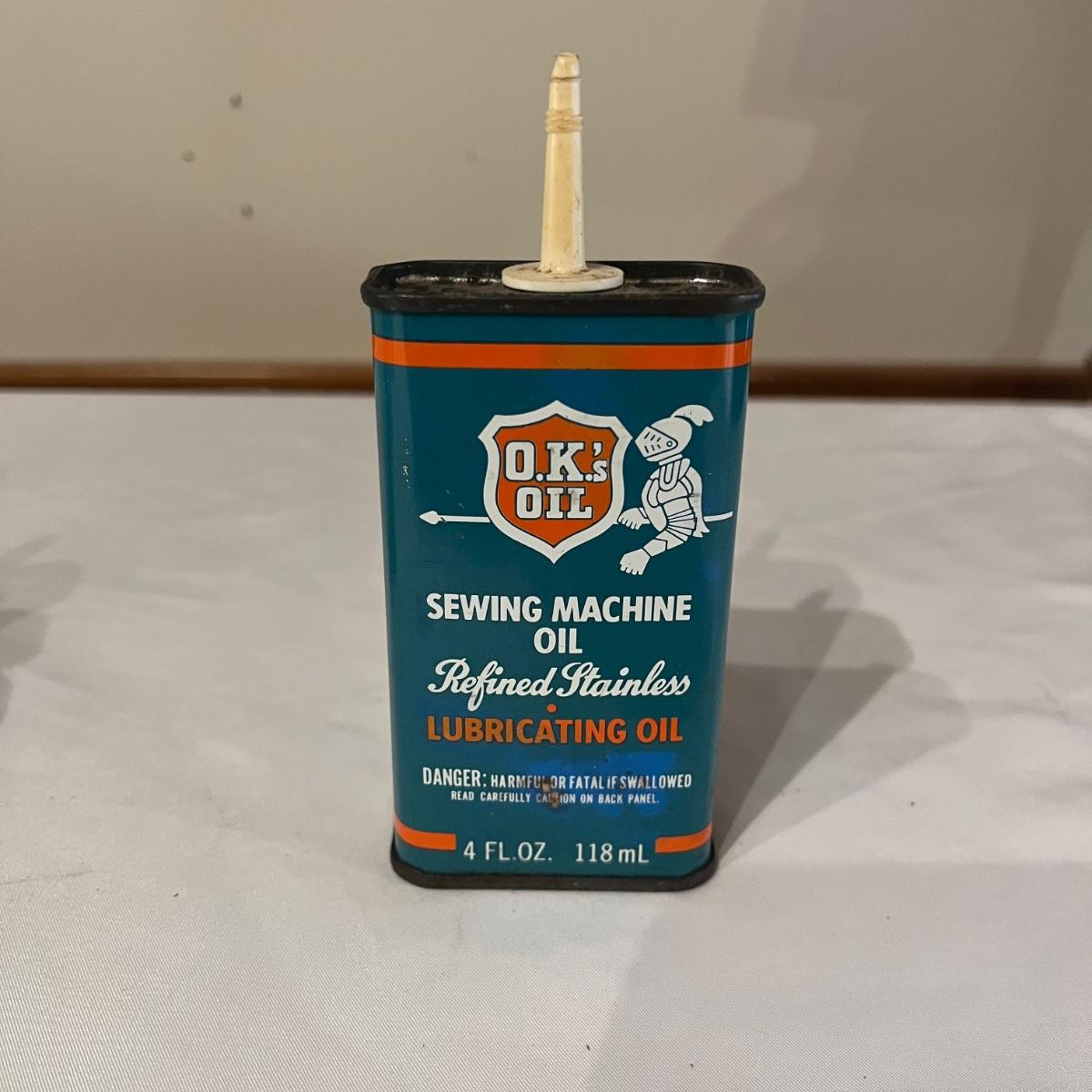 Lot includes seven sewing machine oil cans. Brands include OK, two Pfaff, Nelco, Necchi, Penney’s and one oil can not branded. Cans in last picture have oil in them.
