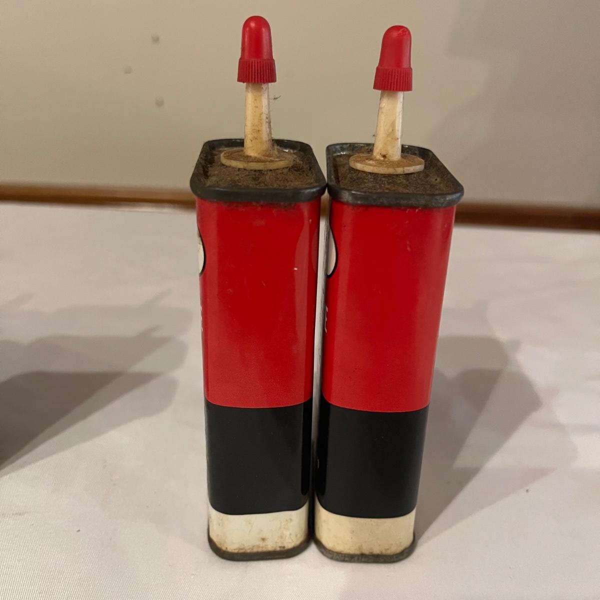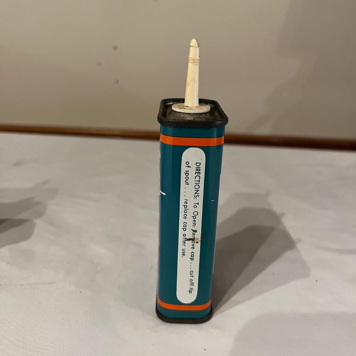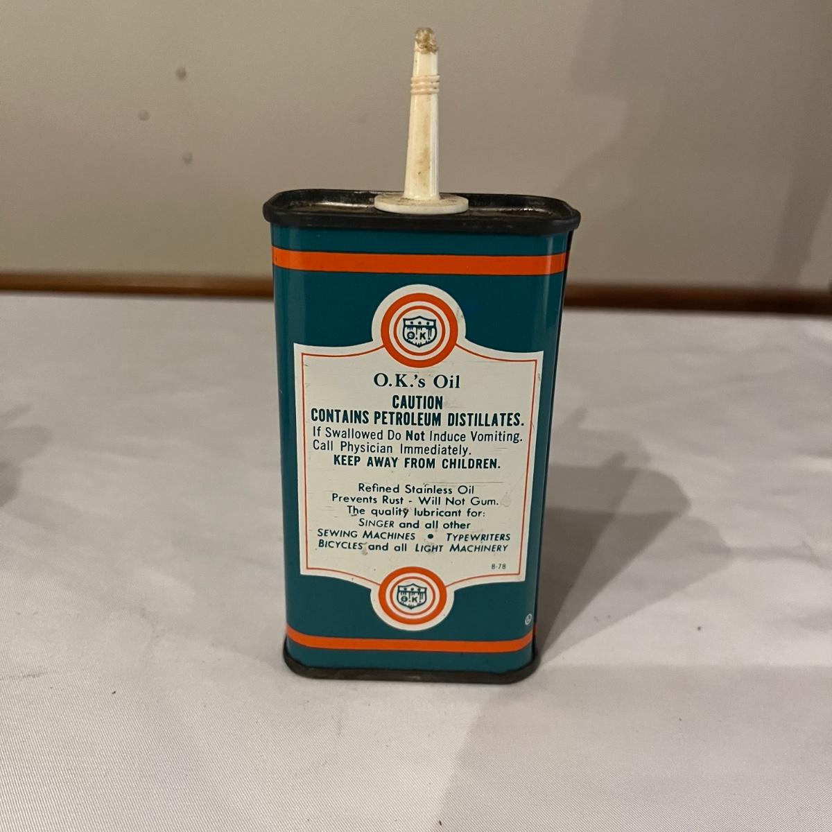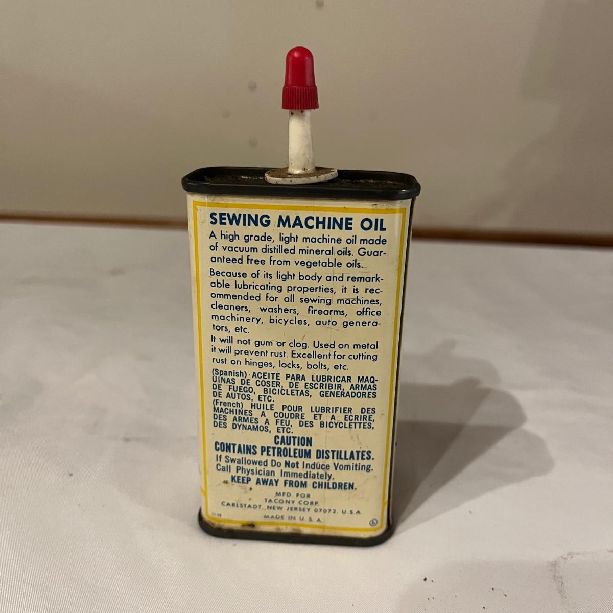 Lot includes seven sewing machine oil cans. Brands include OK, two Pfaff, Nelco, Necchi, Penney’s and one oil can not branded. Cans in last picture have oil in them.