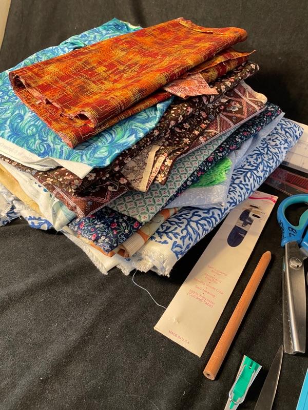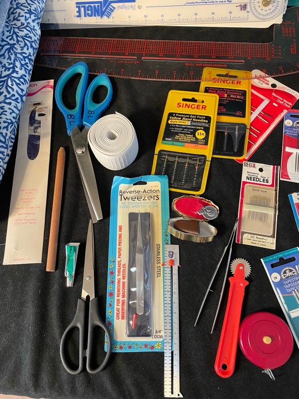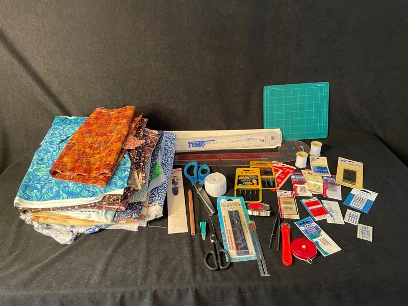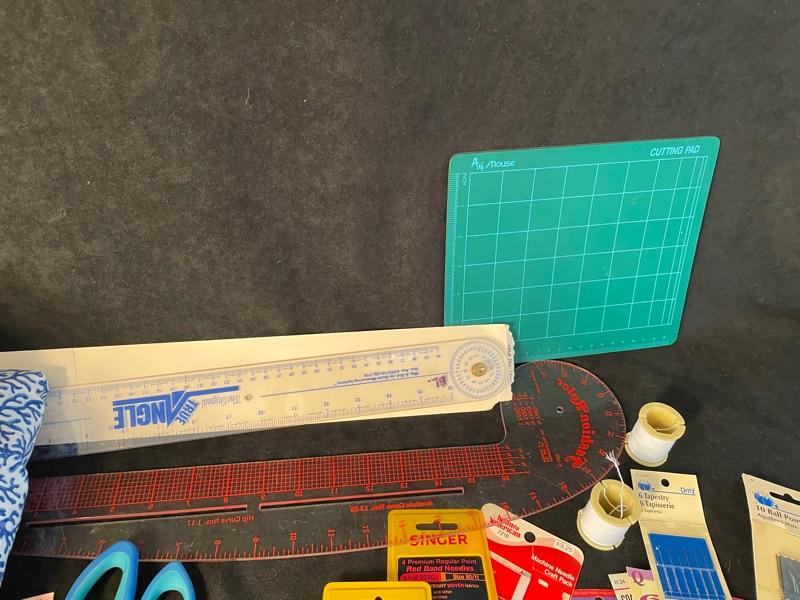 Assortment includes fabric, french curve, angle ruler, hand sewing needles, machine needs, scissors, cutting mat, misc notions
