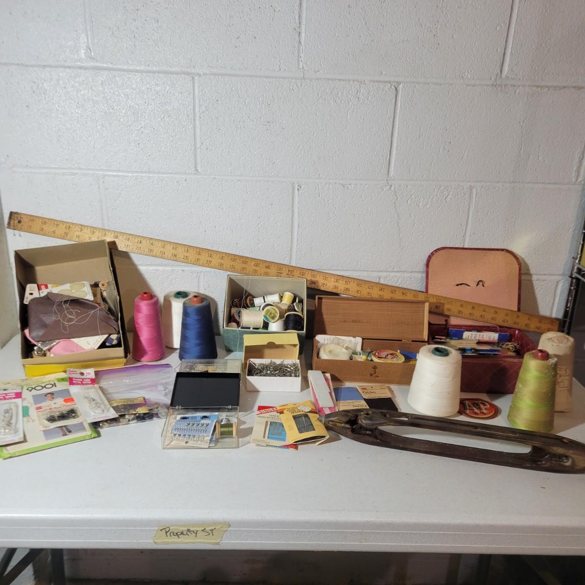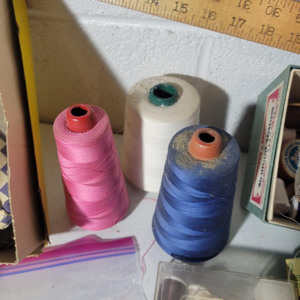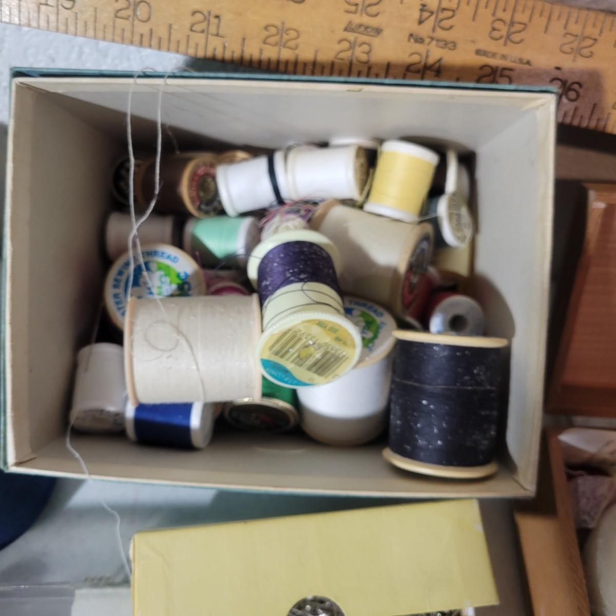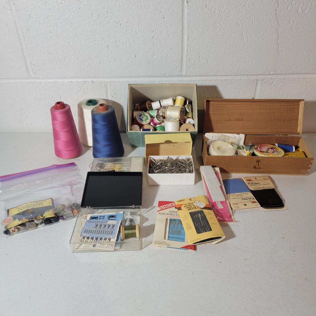 An assortment of sewing supplies, thread, needles, pins and more. This lot includes multiple spools of industrial sized thread, boxes of thread, buttons, hooks, patches and more. Also included is a wooden loom piece that measures approximately 18.5" x 2" Shipping available