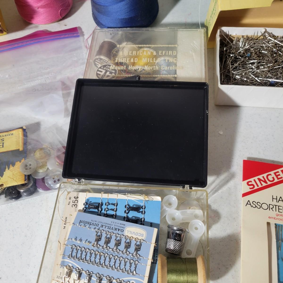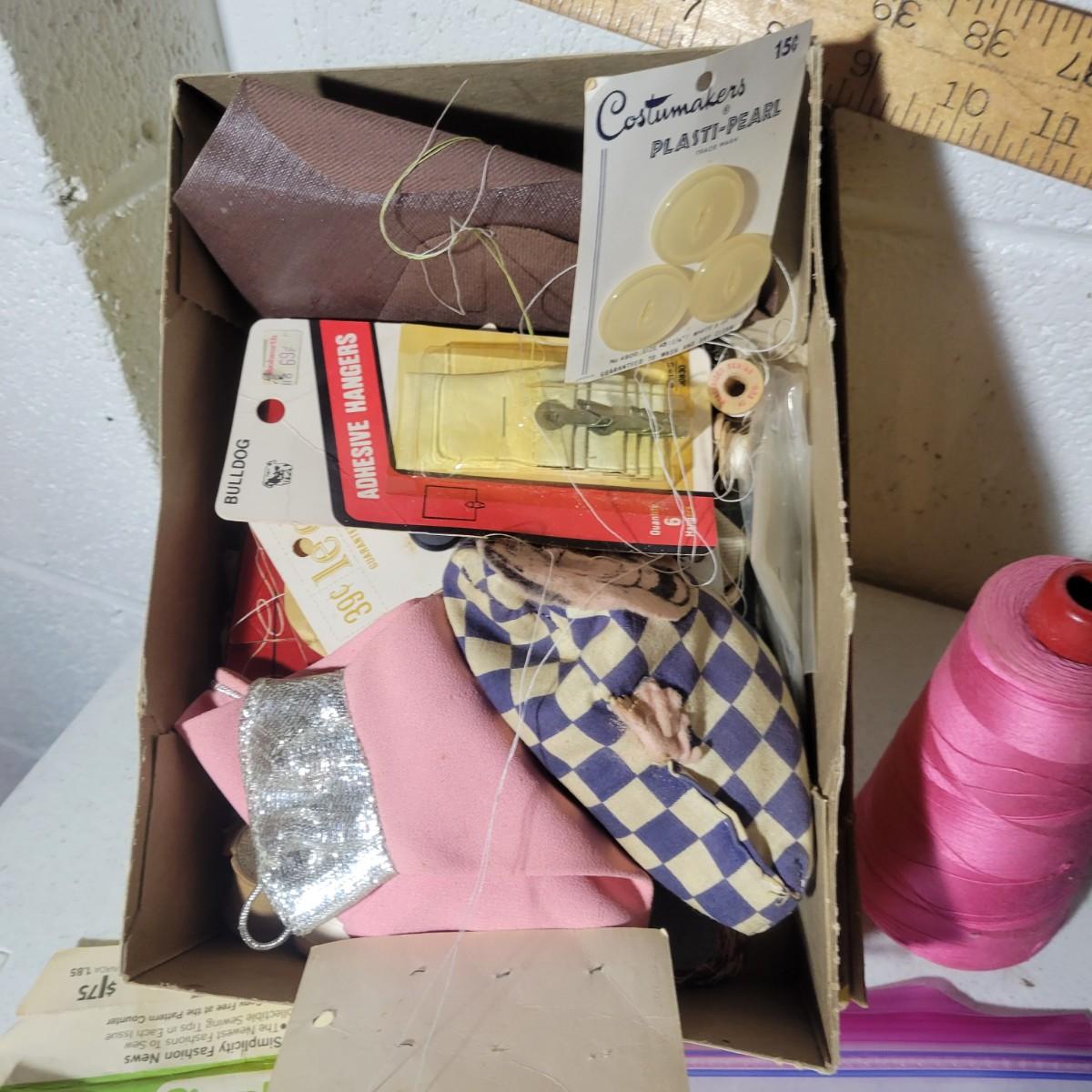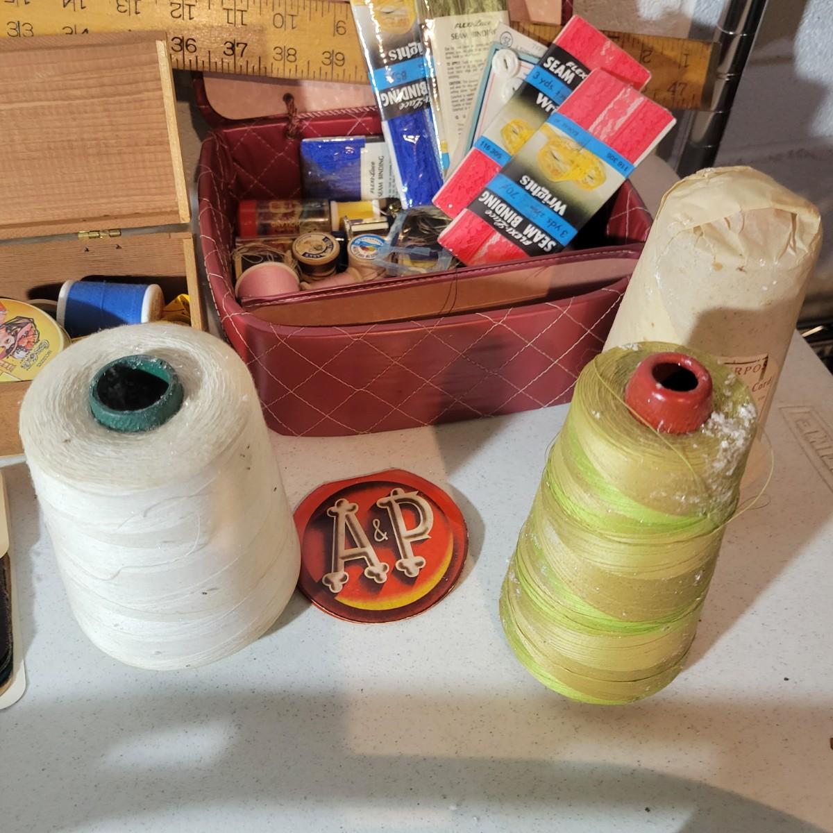 An assortment of sewing supplies, thread, needles, pins and more. This lot includes multiple spools of industrial sized thread, boxes of thread, buttons, hooks, patches and more. Also included is a wooden loom piece that measures approximately 18.5" x 2" Shipping available