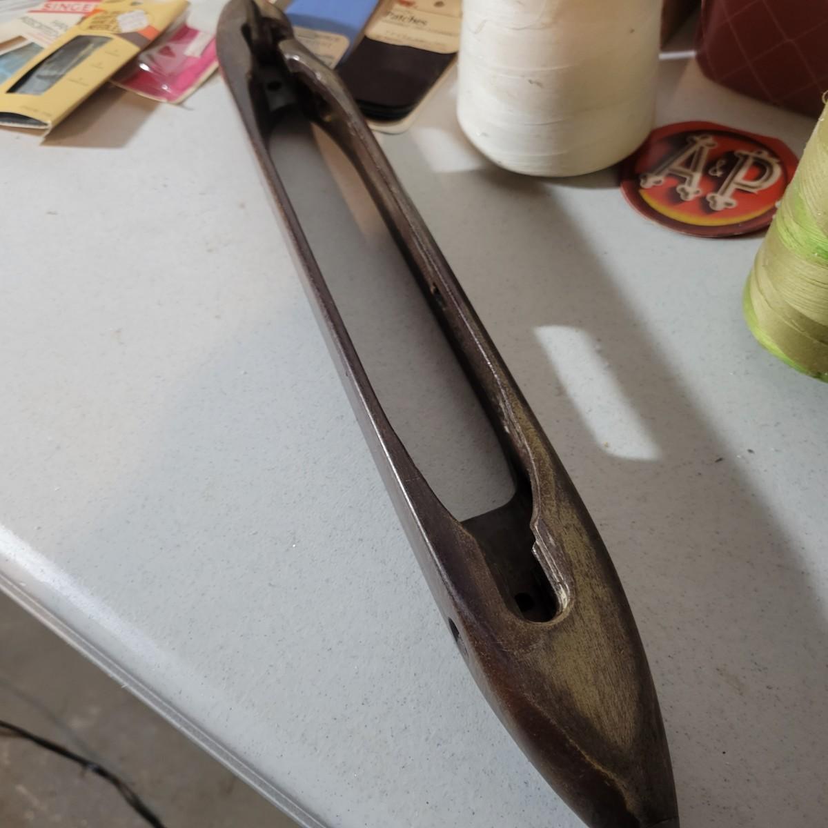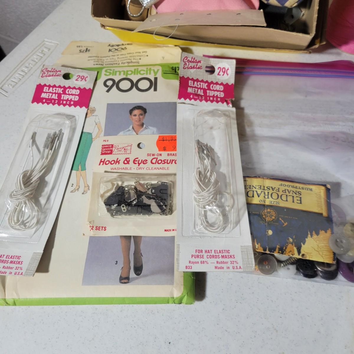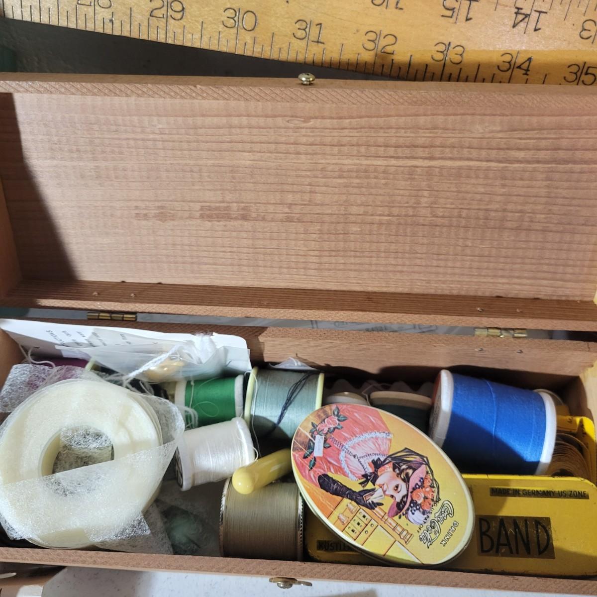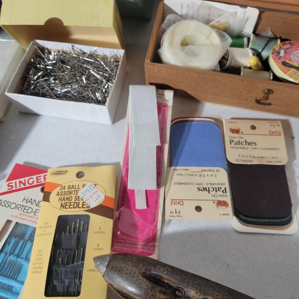 An assortment of sewing supplies, thread, needles, pins and more. This lot includes multiple spools of industrial sized thread, boxes of thread, buttons, hooks, patches and more. Also included is a wooden loom piece that measures approximately 18.5" x 2" Shipping available