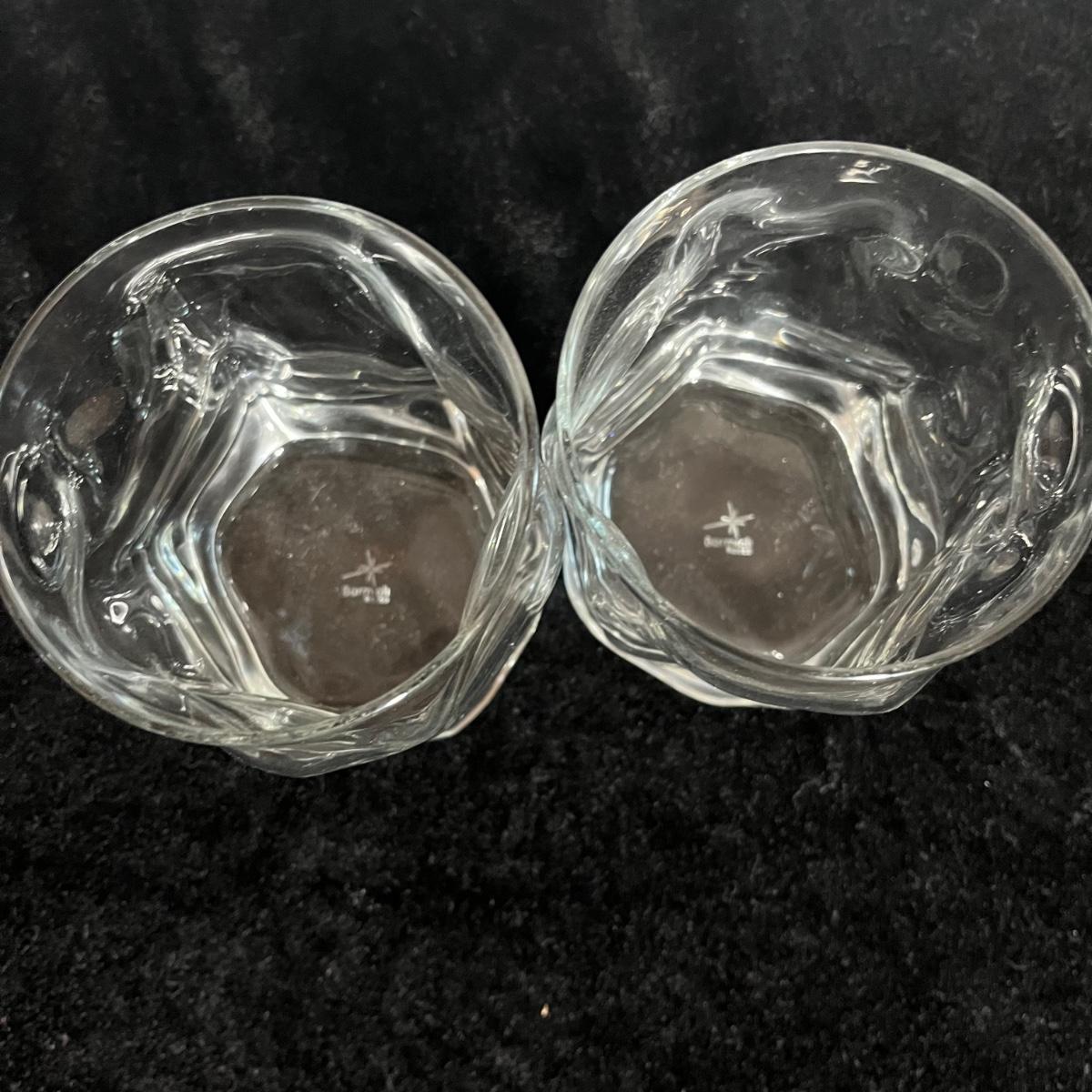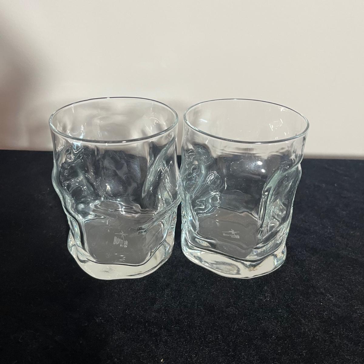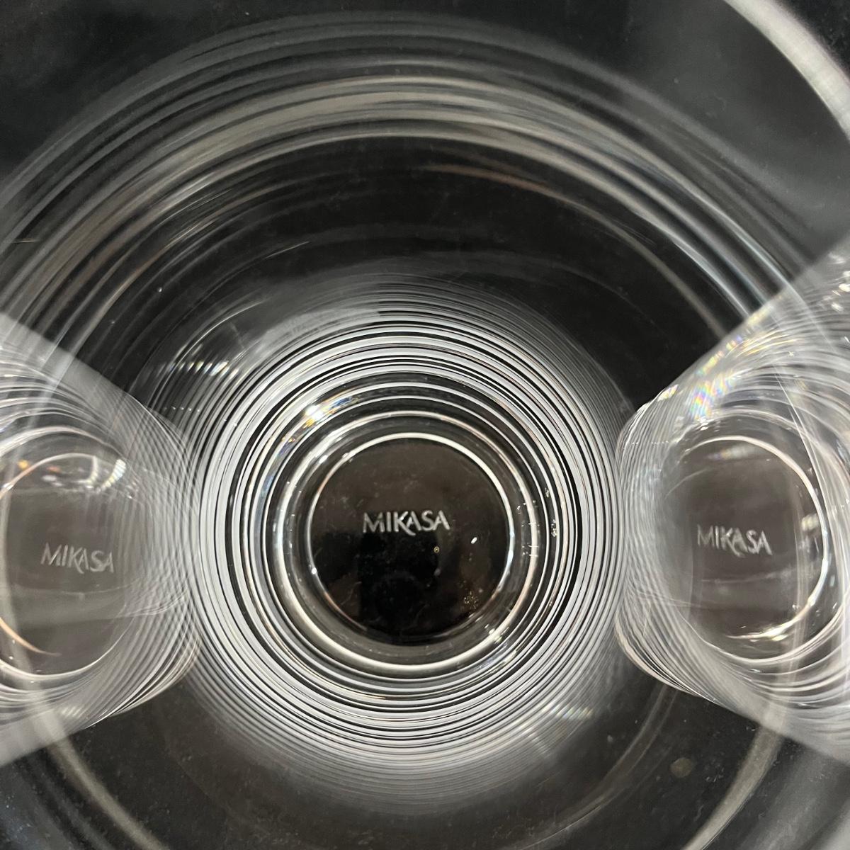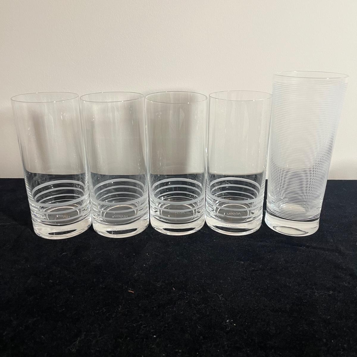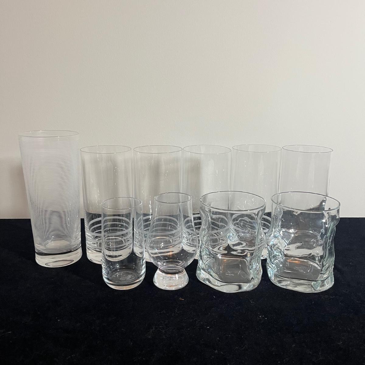 Lot includes two Bormioli high ball glasses, one Luigi Bormioli tumbler, set of four Mikasa tumblers, a different single Mikasa tumbler, Virgin Atlantic glass and a Glencairn whiskey glass. Tallest Mikasa tumbler measures 3”D x 7.5” tall.