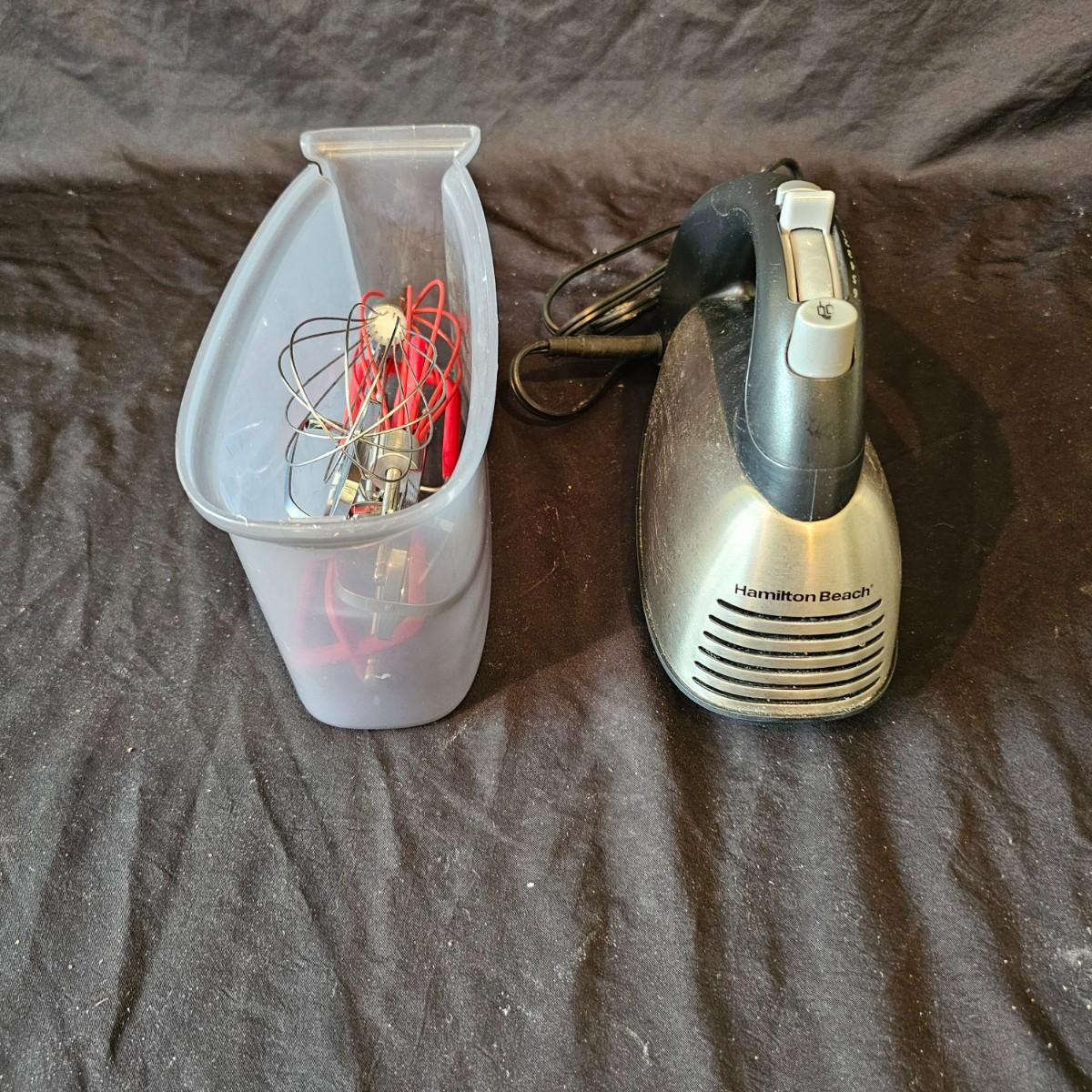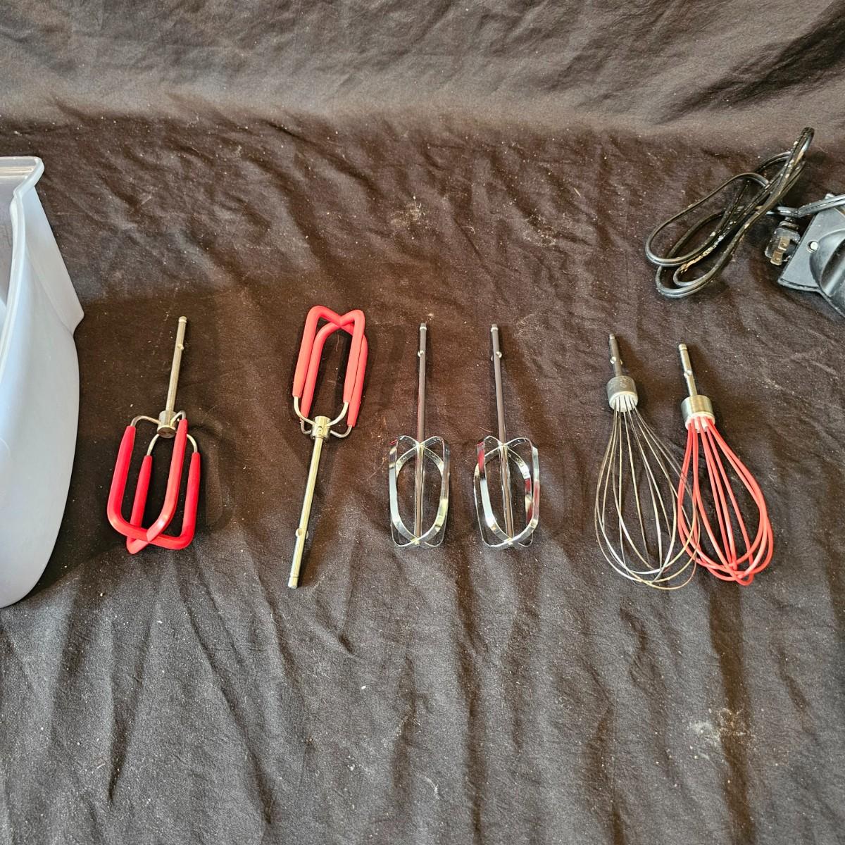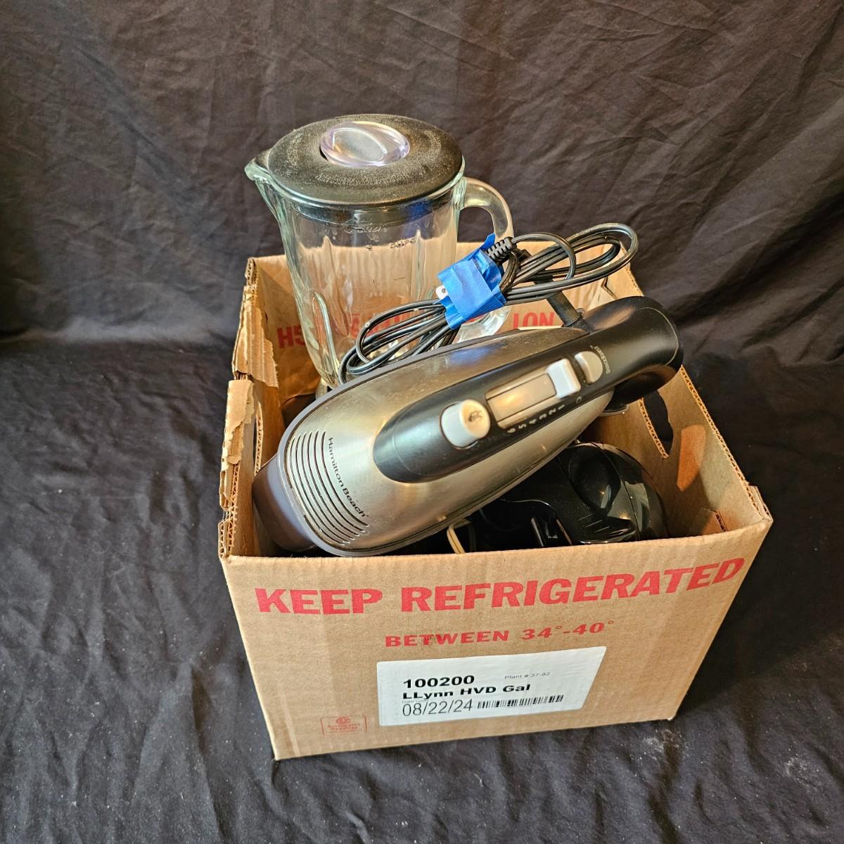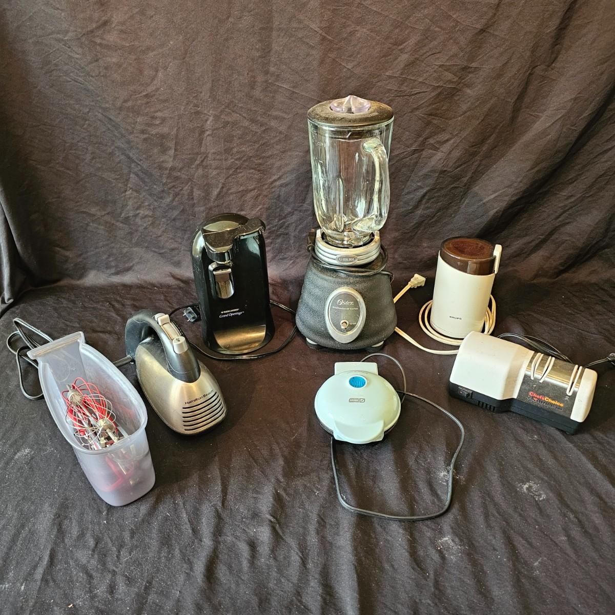 Several handy small appliances for kitchen use. A blender, coffee mill, knife sharpener, hand mixer and more. Oster blender is 7.5"D x 15.5"H, knife sharpener is 7.25" x 3" x 3.5"H. Black & Decker can opener/knife sharpener is 5" x 6" x 9"H. All items powered on when plugged in. See photos for details. Shipping available.