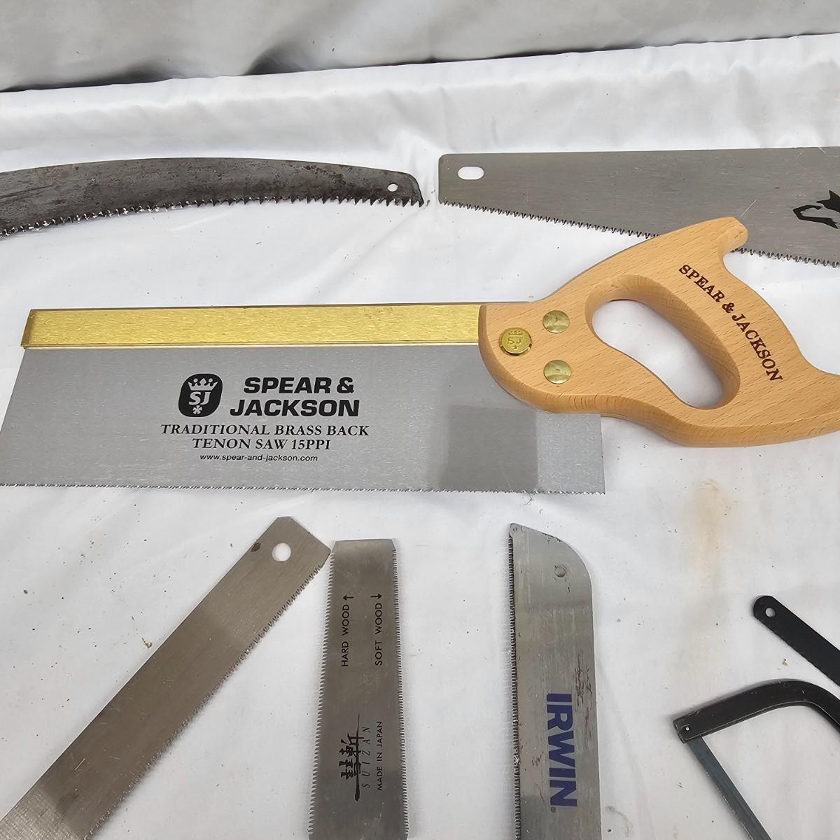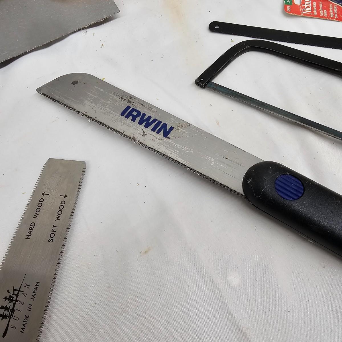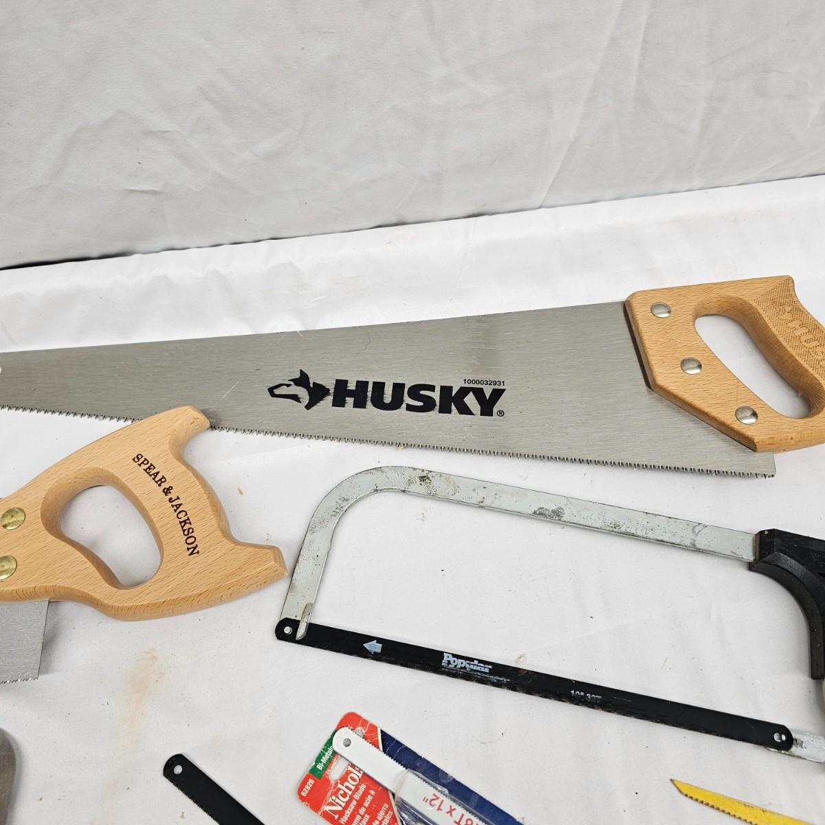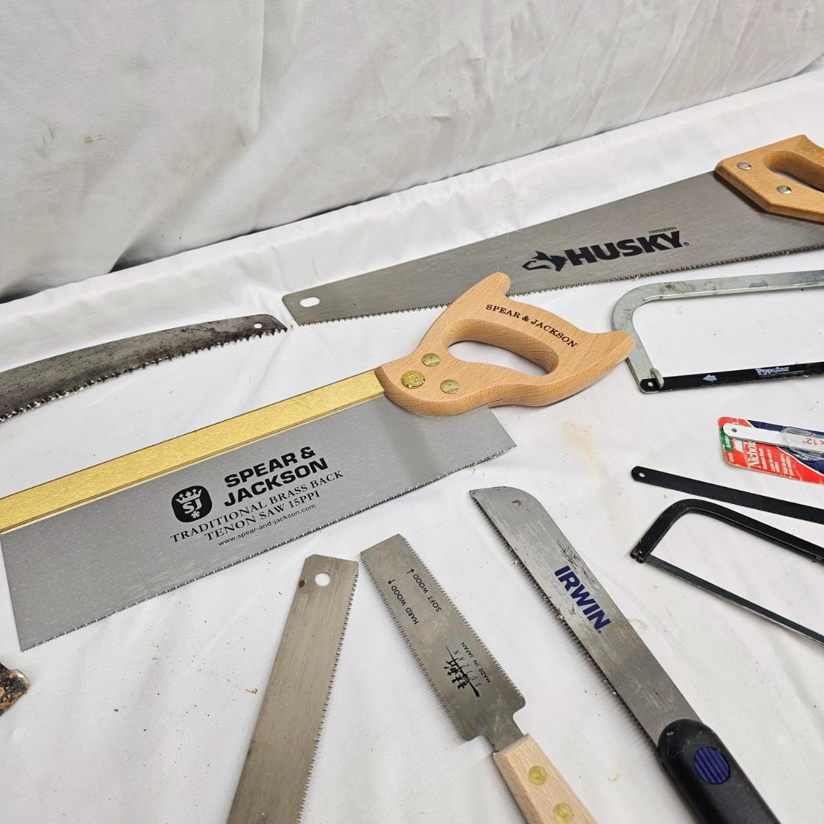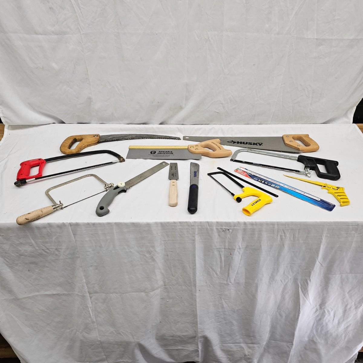 Hack saws, coping saw, back saw and more. One curved tree trim saw. A Husky multi tooth saw, 22" long. Small yellow keyhole saw, 9" long. Three Japanese style hand saws. See photos for details. Local pickup only.