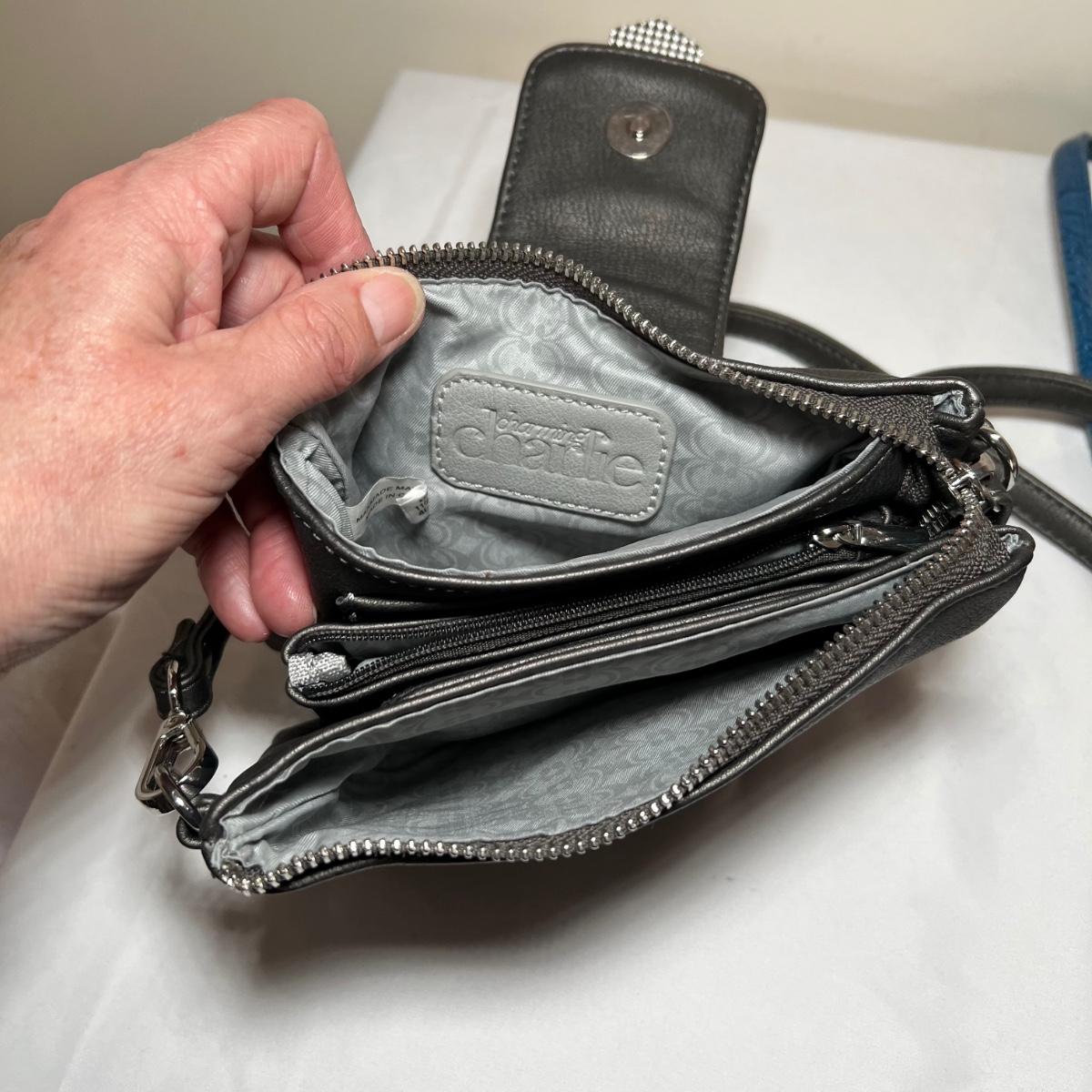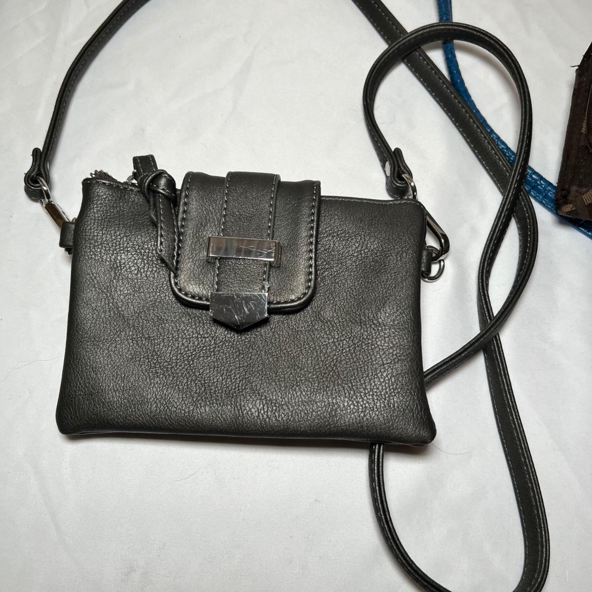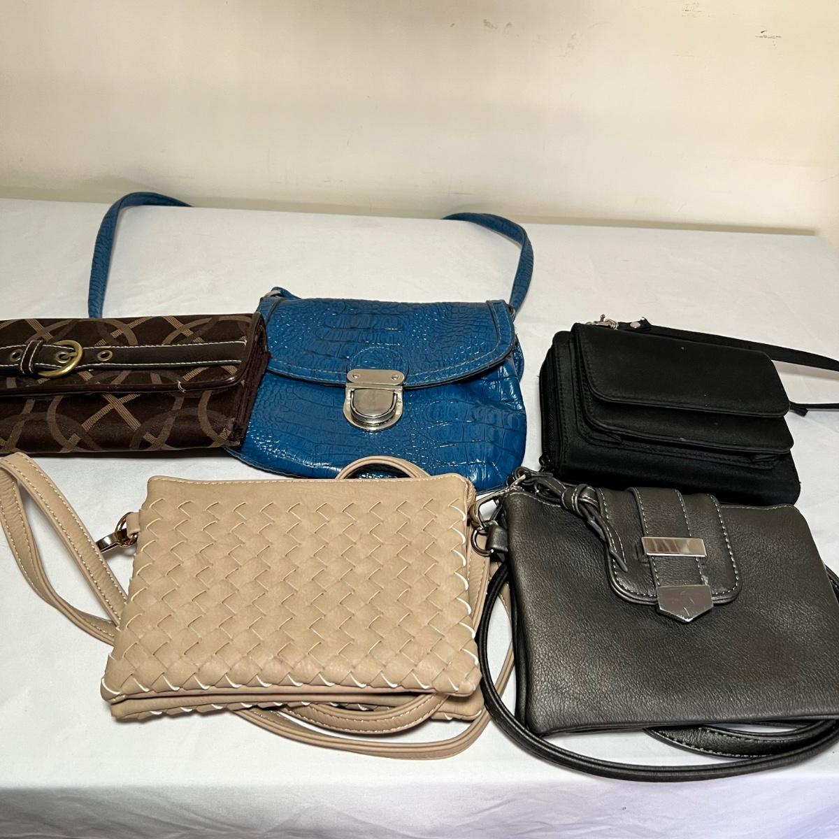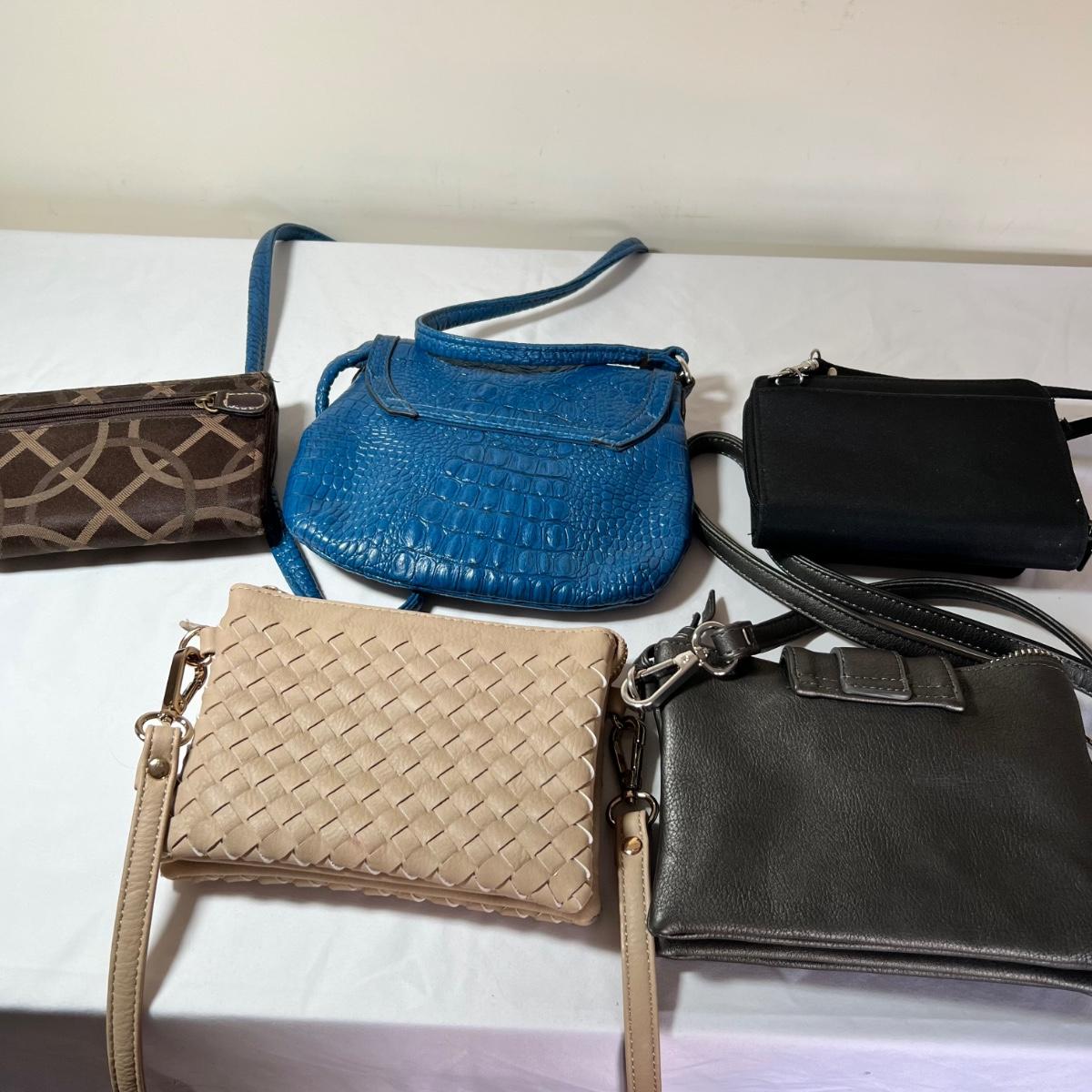 These 4 small shoulder purses are ideal to carry your essentials in, most of which have wallets built into them for easy organization. The tan and grey purses are Charming Charlie, black one is Buxton, blue is unmarked and the brown wallet is from Target.