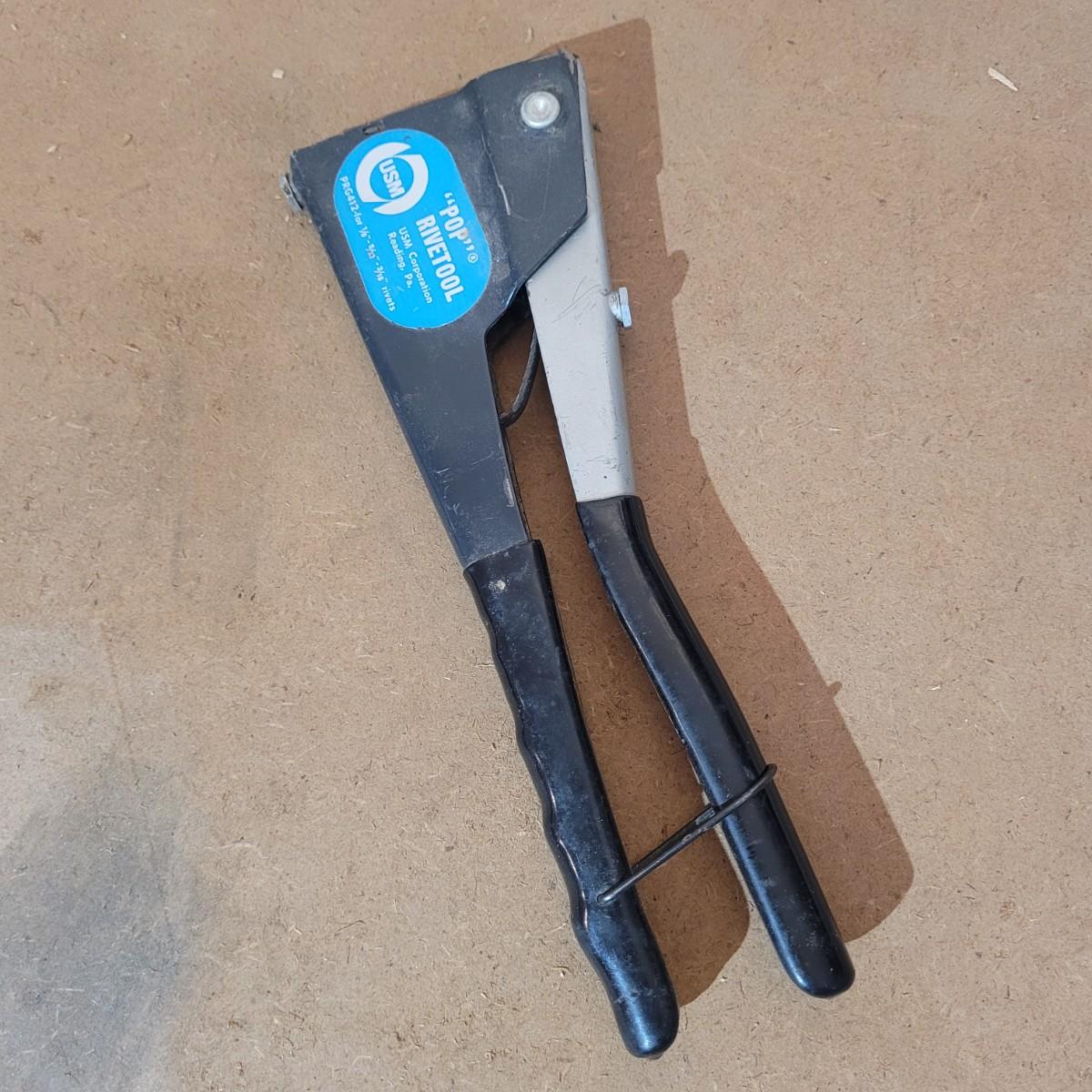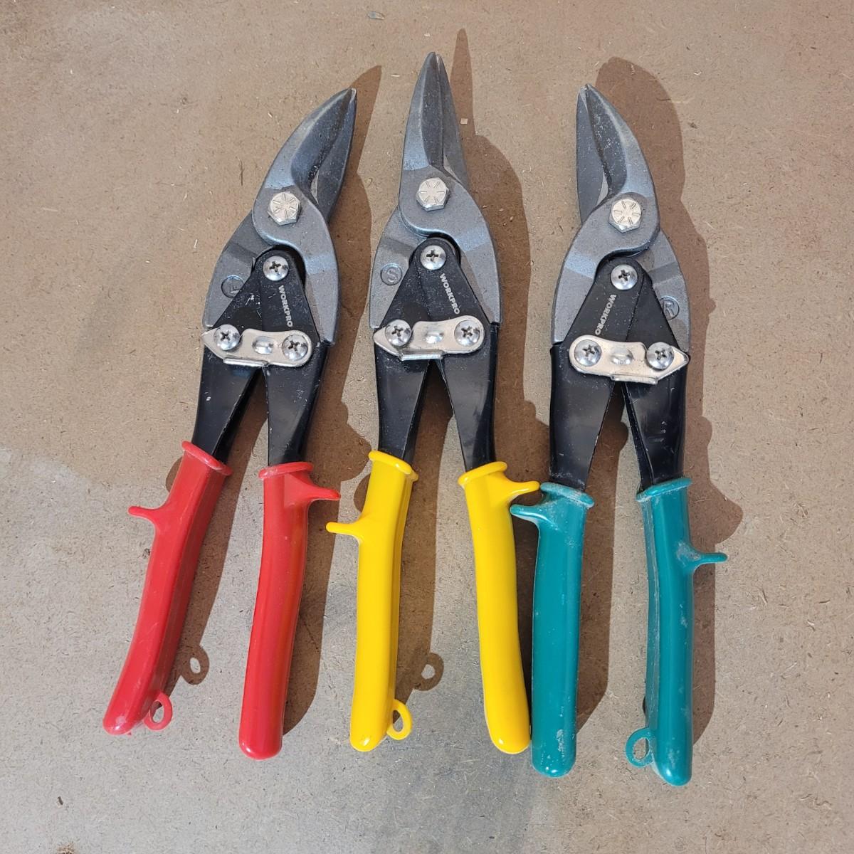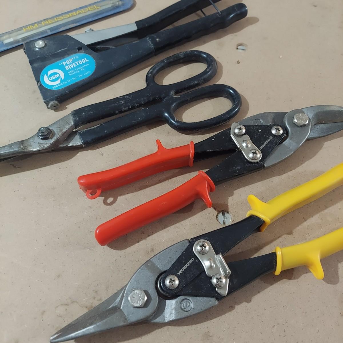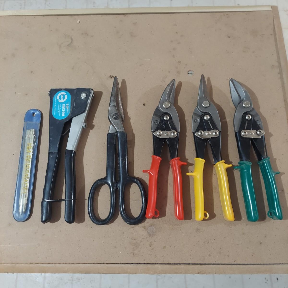 Assortment of 4 different tin snips, a "pop" rivet tool and two metal scribes. Brands include Workpro and USM. Snips range in size from 9" to 10". Scribes are approximately 6" long.