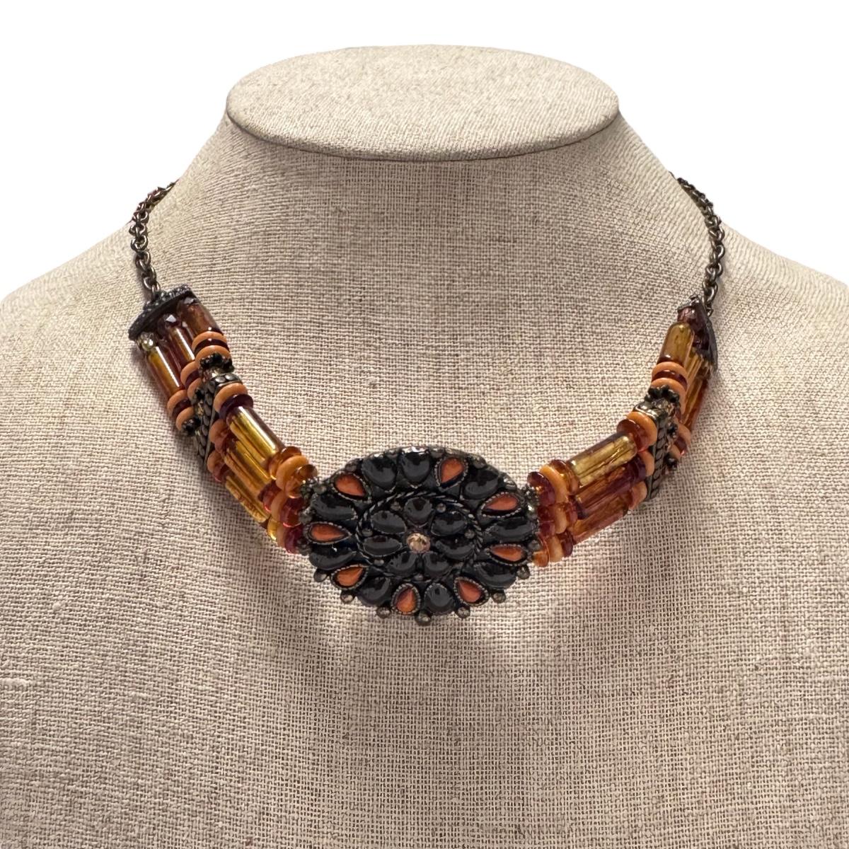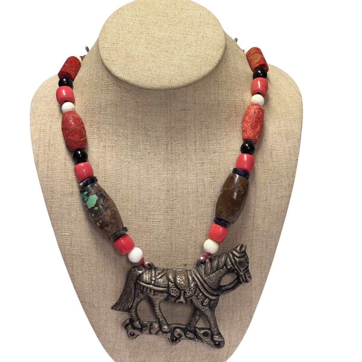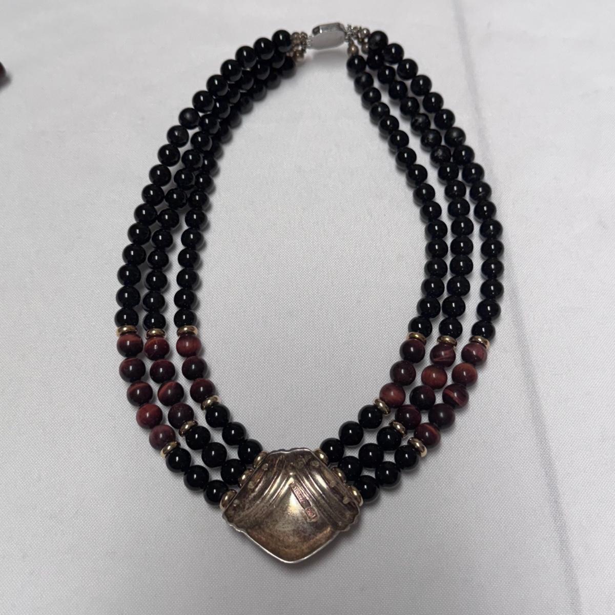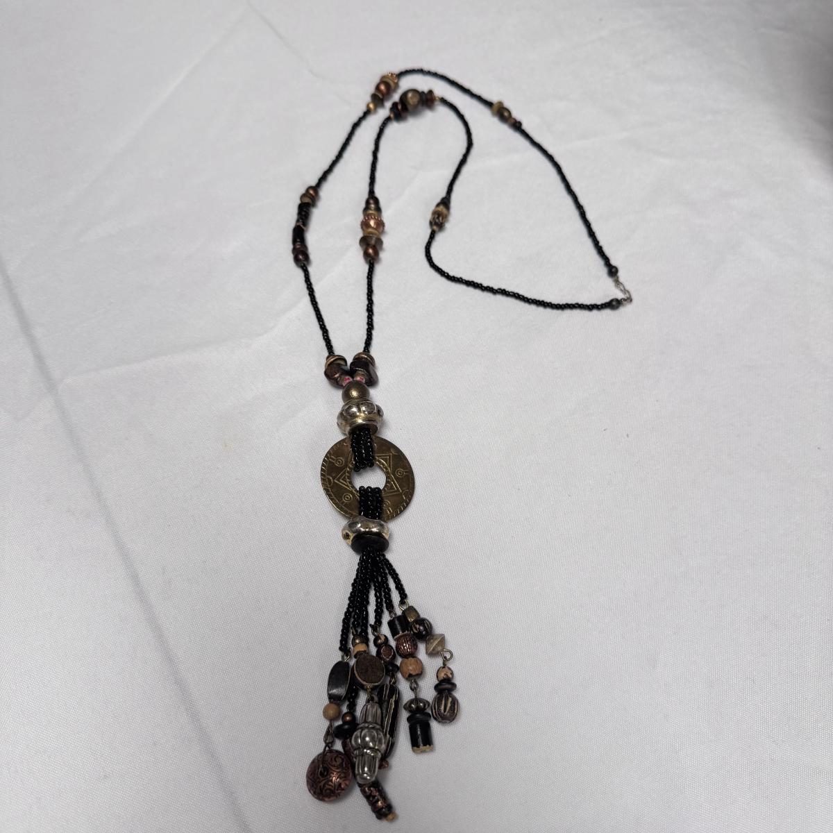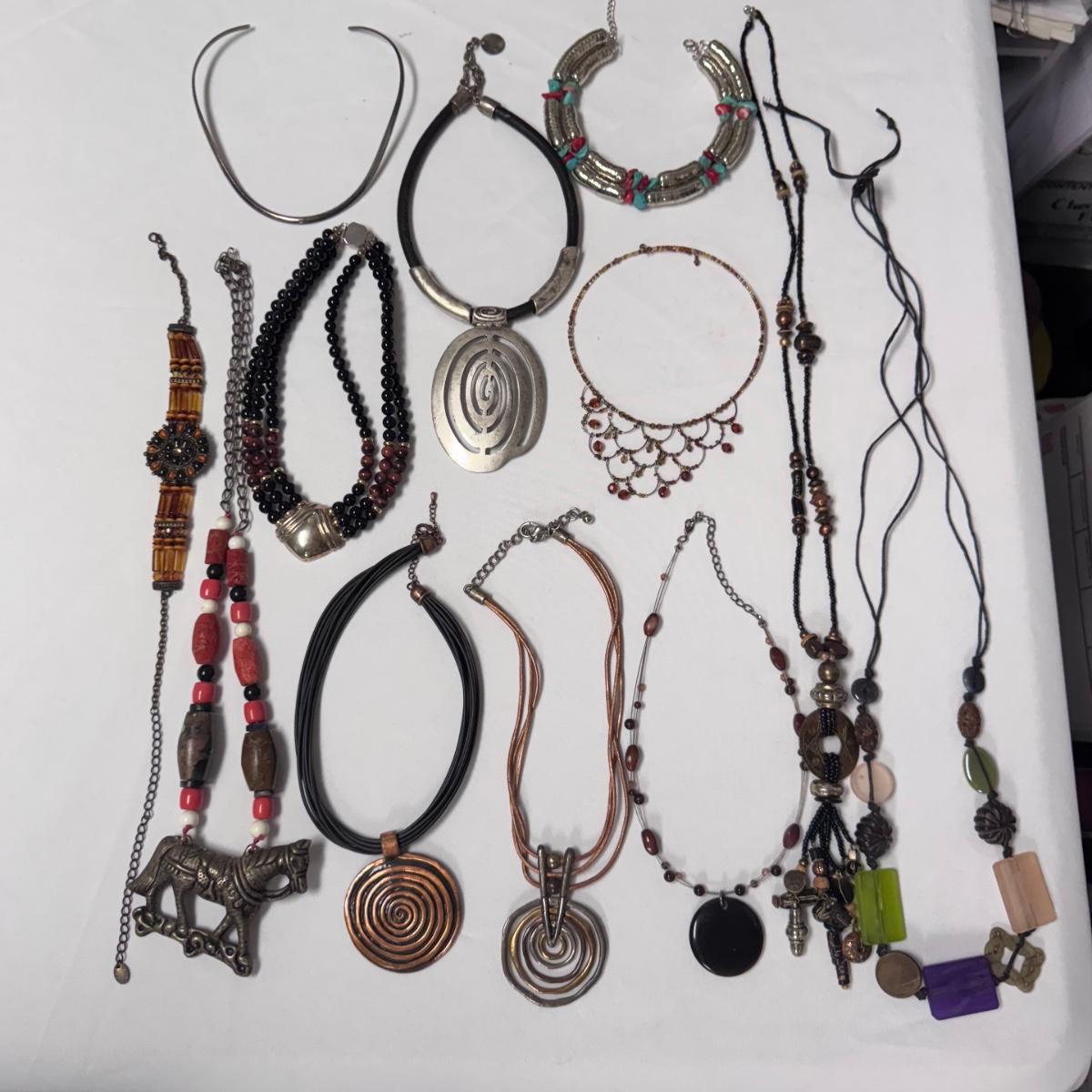 Lot includes eleven statement necklaces in various sizes and styles. You’ll find handcrafted necklaces with funky beads, stones, glass, and more. The longest necklace is the last one pictured that measures 38” long. The necklace with three layers of beads has a sterling center - see picture of stamp included. All sales are final. No returns or refunds. Please bid accordingly. Shipping available.