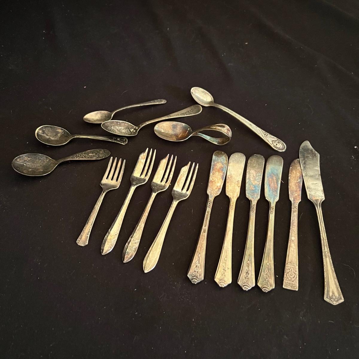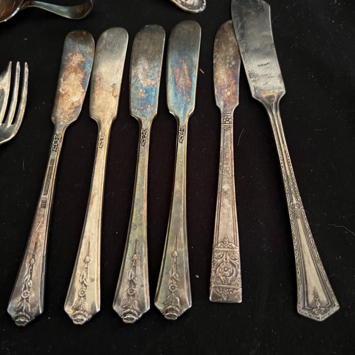 Lot includes 6 spoons (one is Sterling), 4 forks and 6 knives. See images for brands and markings.