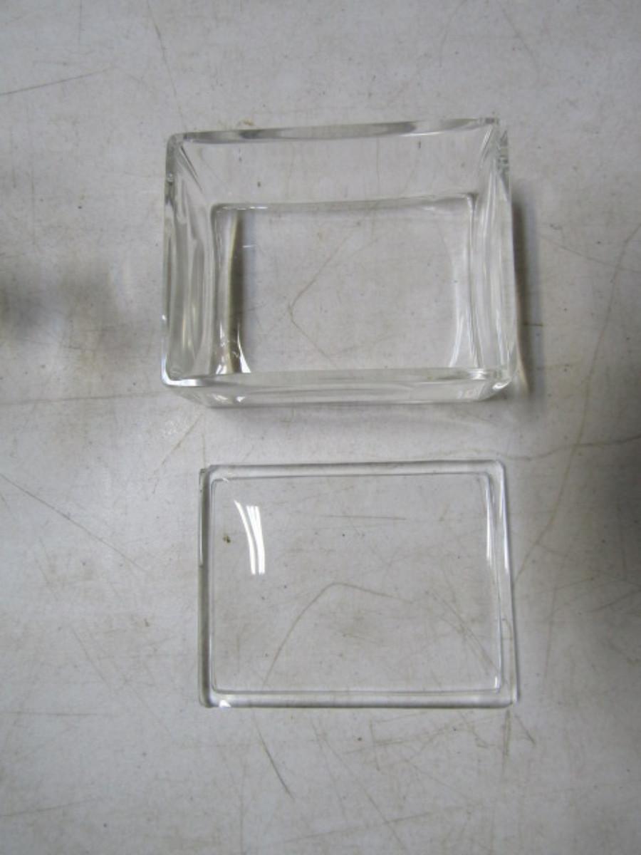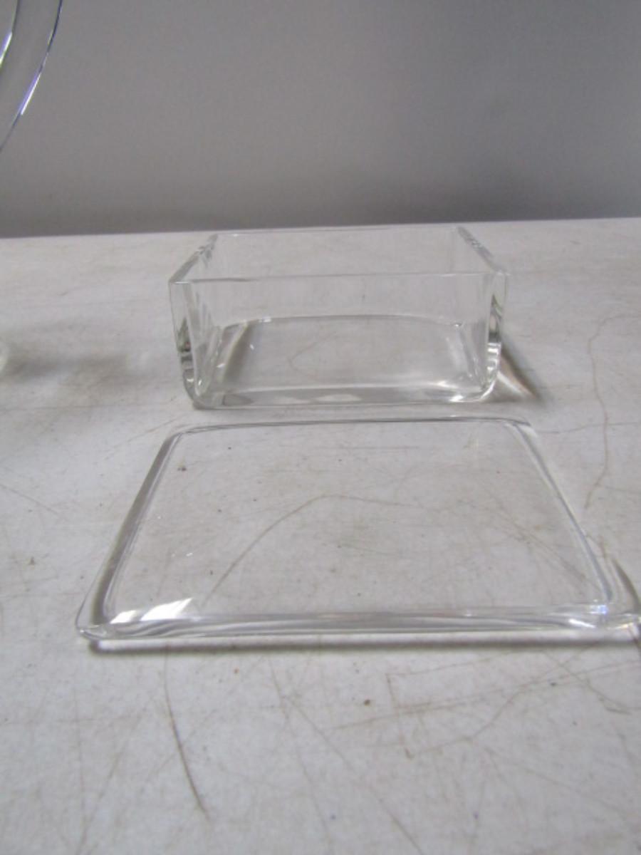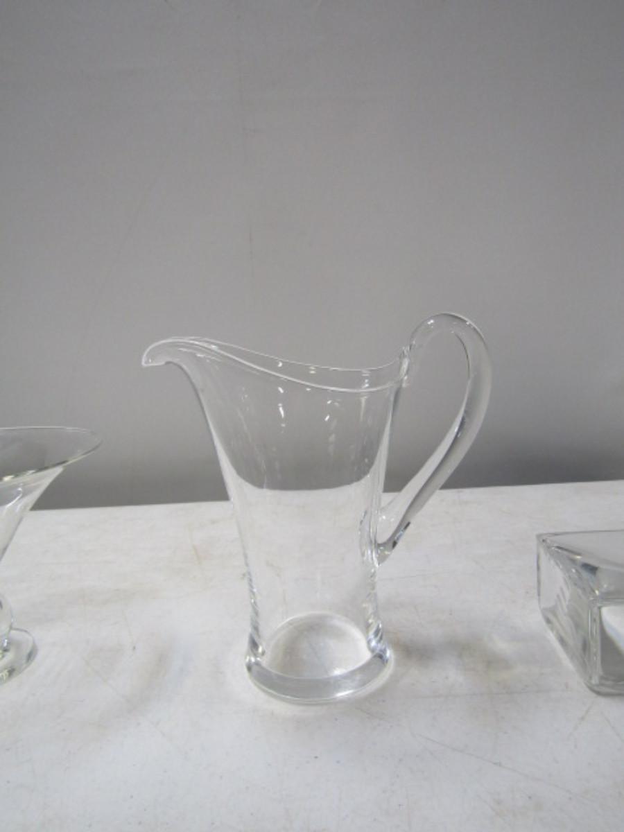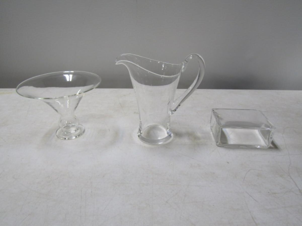 Assortment of Steuben Glass Pieces- Pitcher, Vase, and Cigarette Box with Lid. The lid of the box has a chipped corner- please see all pictures.