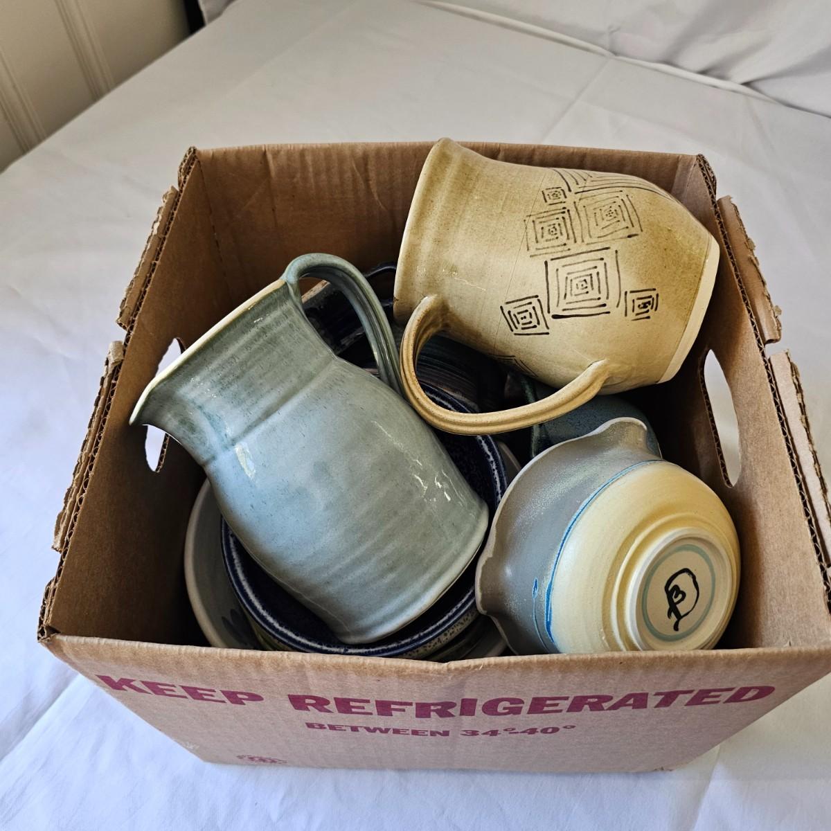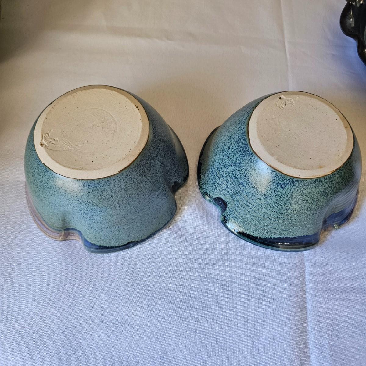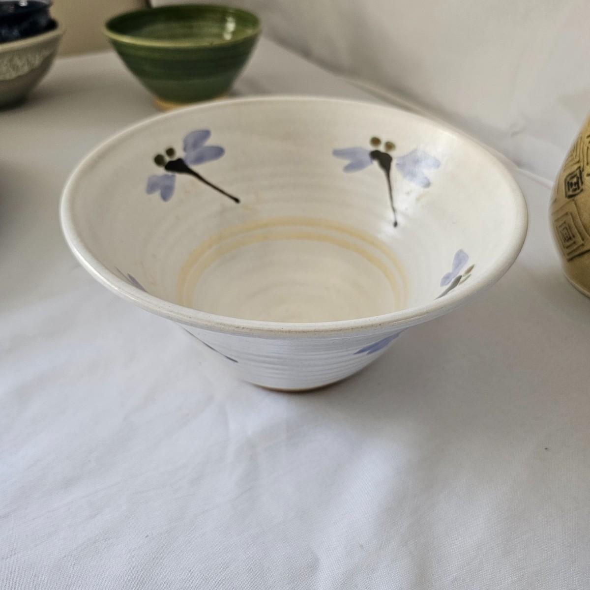 Round, oblong, deep and shallow, this group of stoneware items will find a place in your home. Most items have some type of signature on bottom. Tan pitcher is 4.5" x 7" x 6"H. Dragonfly bowl is 8.5"D x 4"H. Matching bowls in front are 6" x 6" x 3"H. See photos for details. Local pickup only.