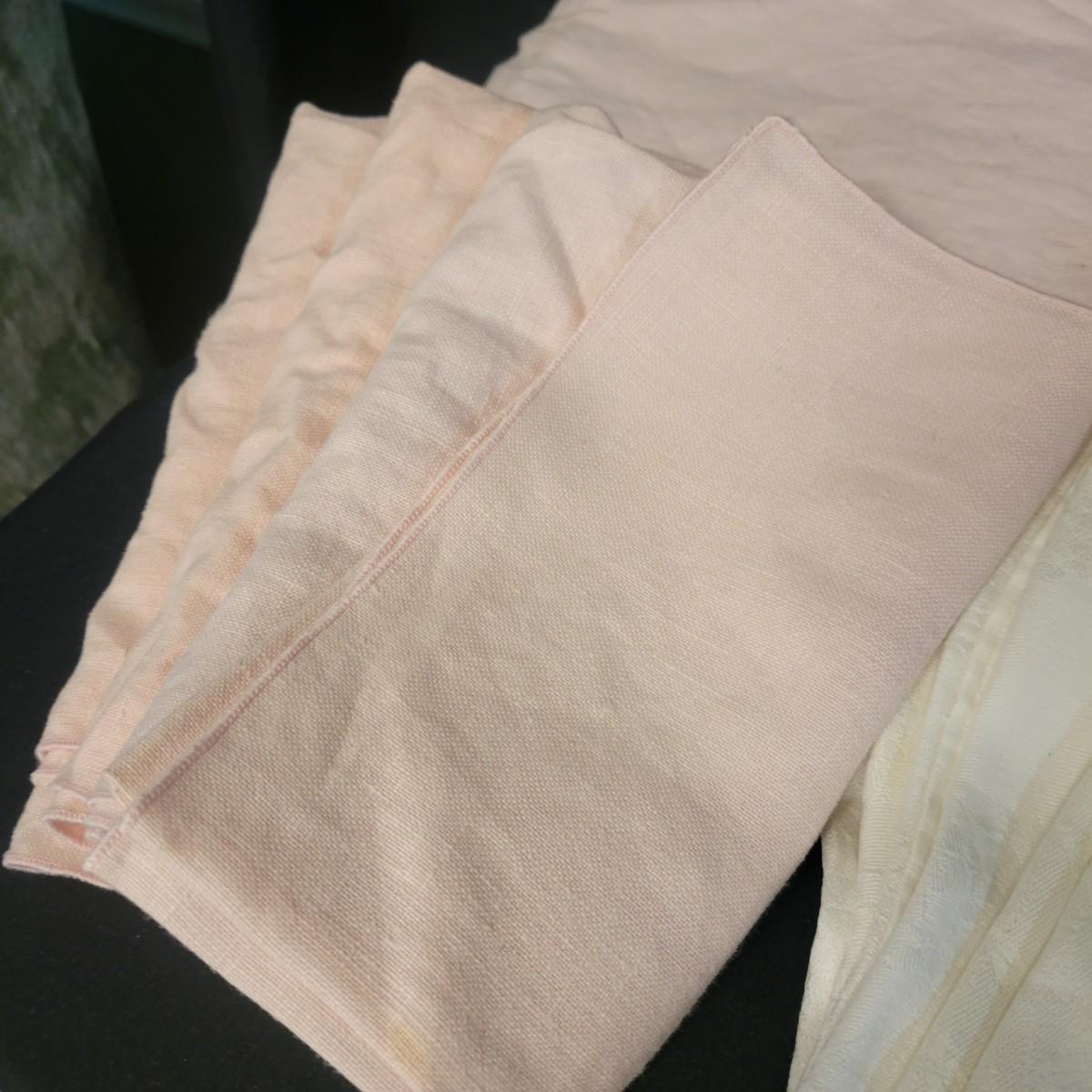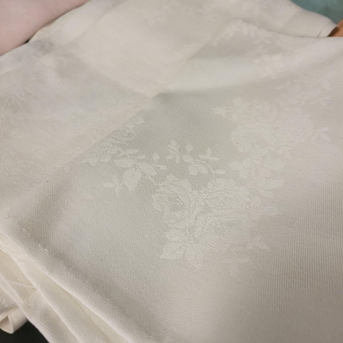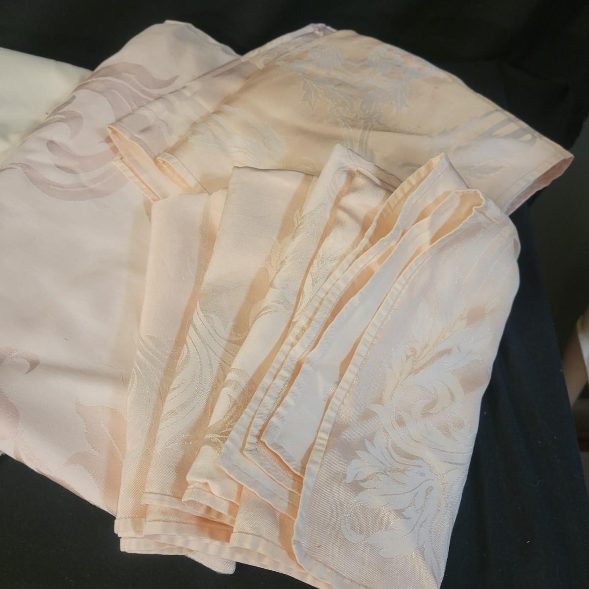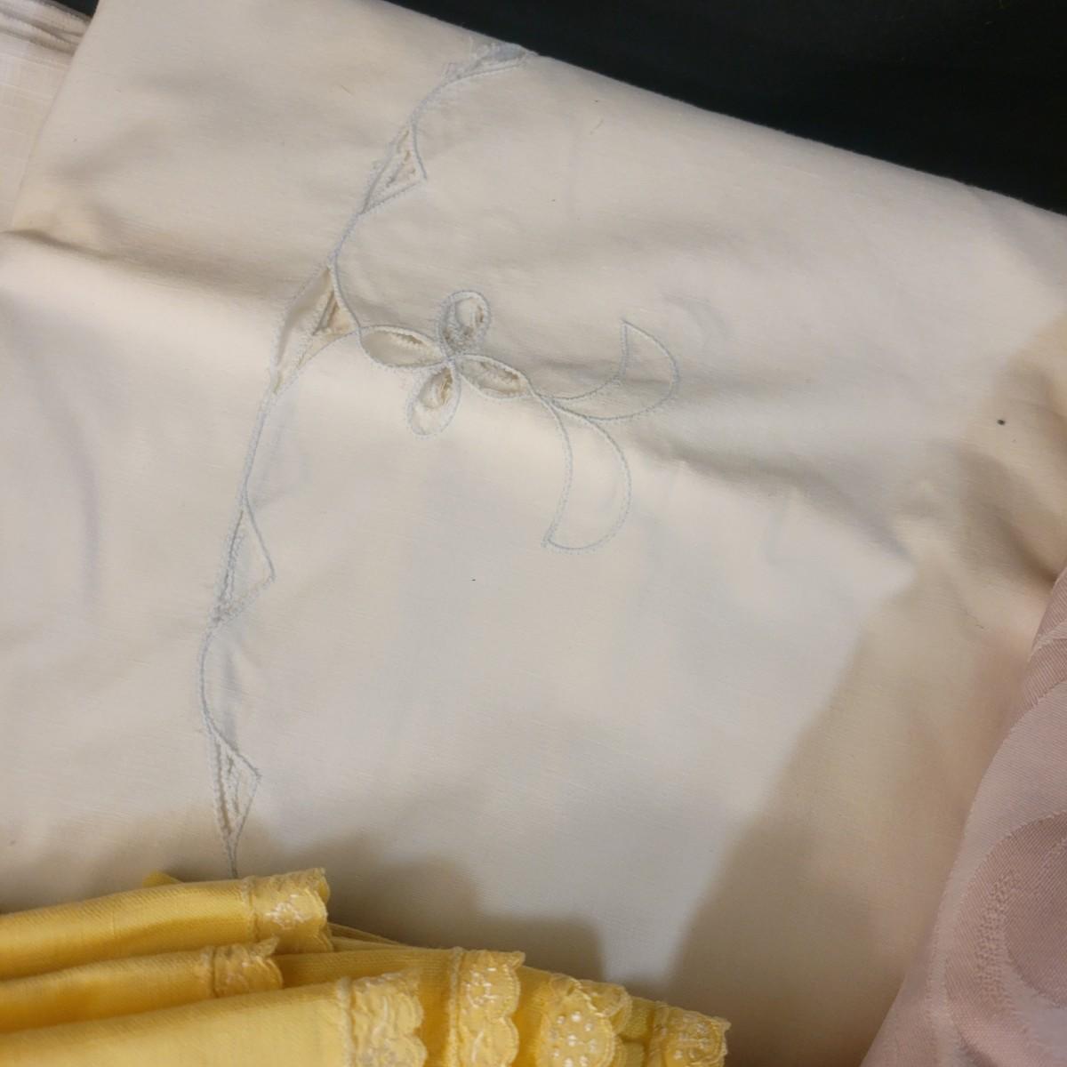 An assortment of tablecloths and napkins in good condition with no notable damage. A range of colors and fabrics from cotton to linen and a variety of sizes. Lot includes six tablecloths and over 20 napkins, some match tablecloths, others are accent pieces. The pink embossed tablecloth measures approximately 96" x 60" and the white tablecloth with cutouts measures approximately 78" x 60" Shipping available