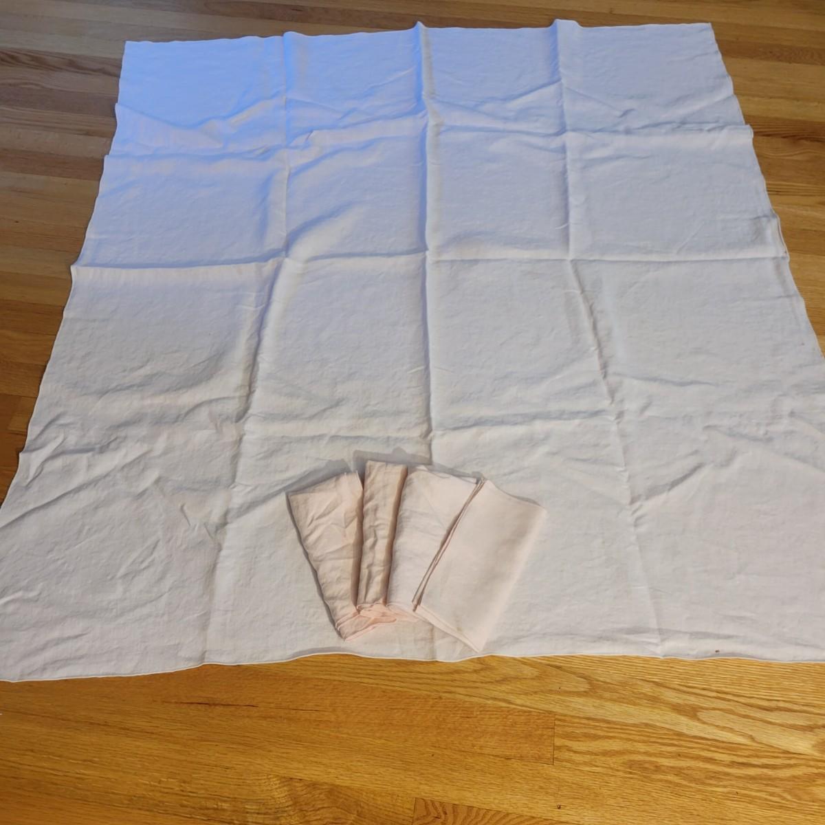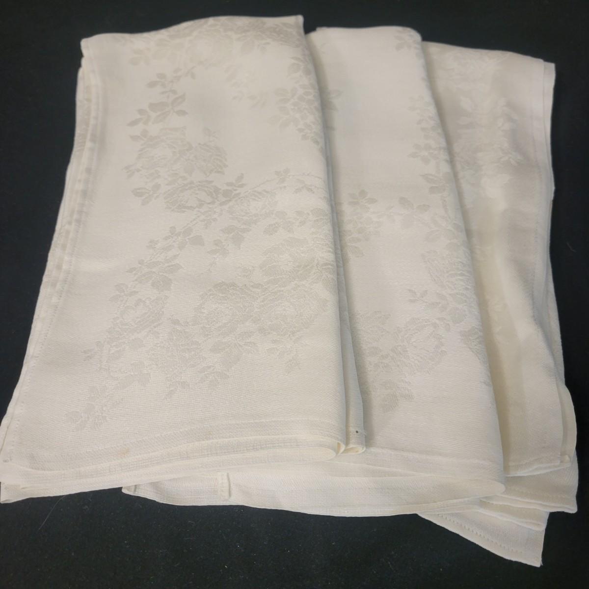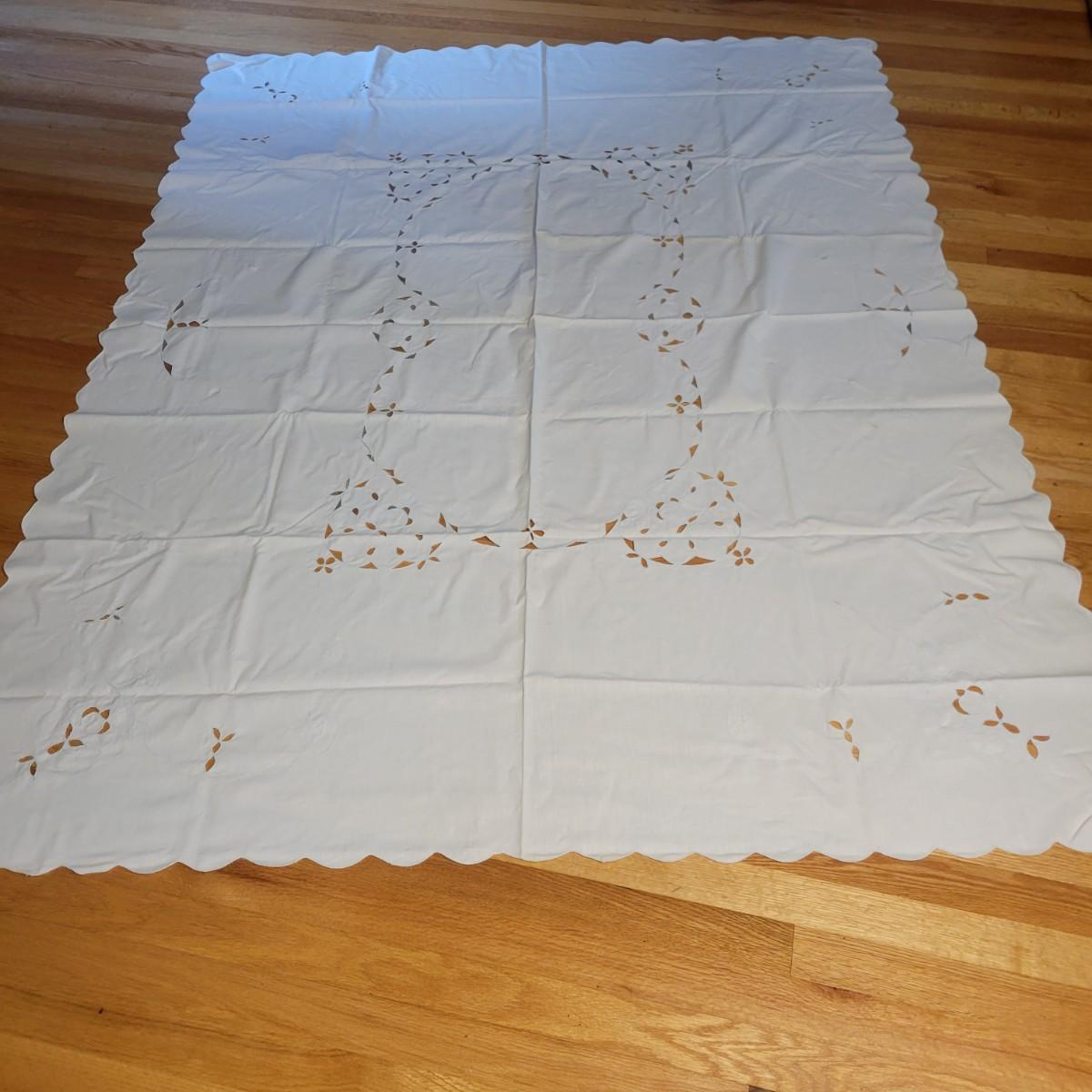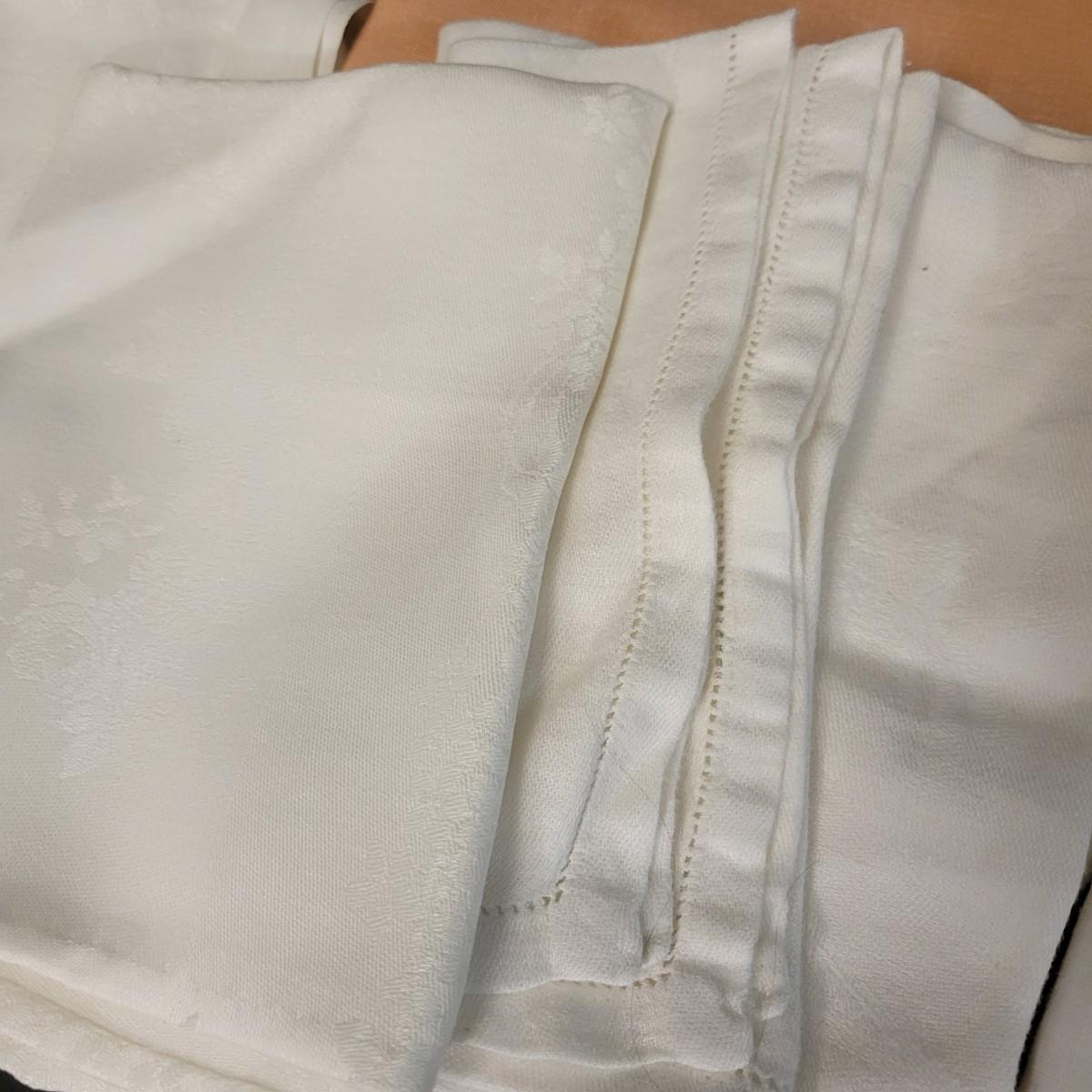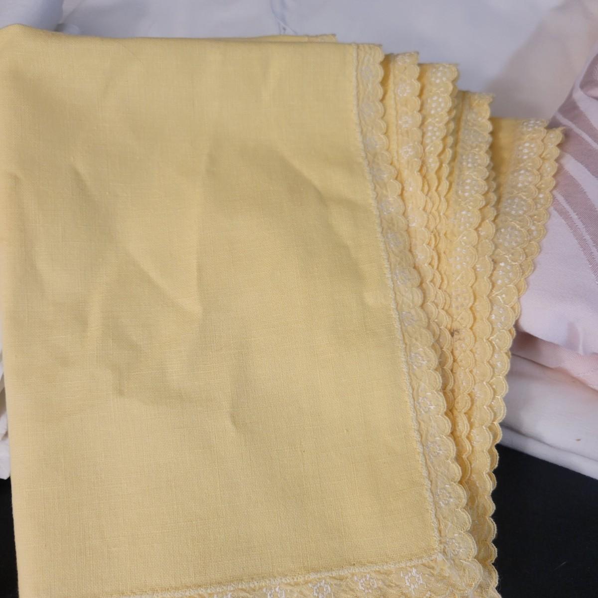 An assortment of tablecloths and napkins in good condition with no notable damage. A range of colors and fabrics from cotton to linen and a variety of sizes. Lot includes six tablecloths and over 20 napkins, some match tablecloths, others are accent pieces. The pink embossed tablecloth measures approximately 96" x 60" and the white tablecloth with cutouts measures approximately 78" x 60" Shipping available