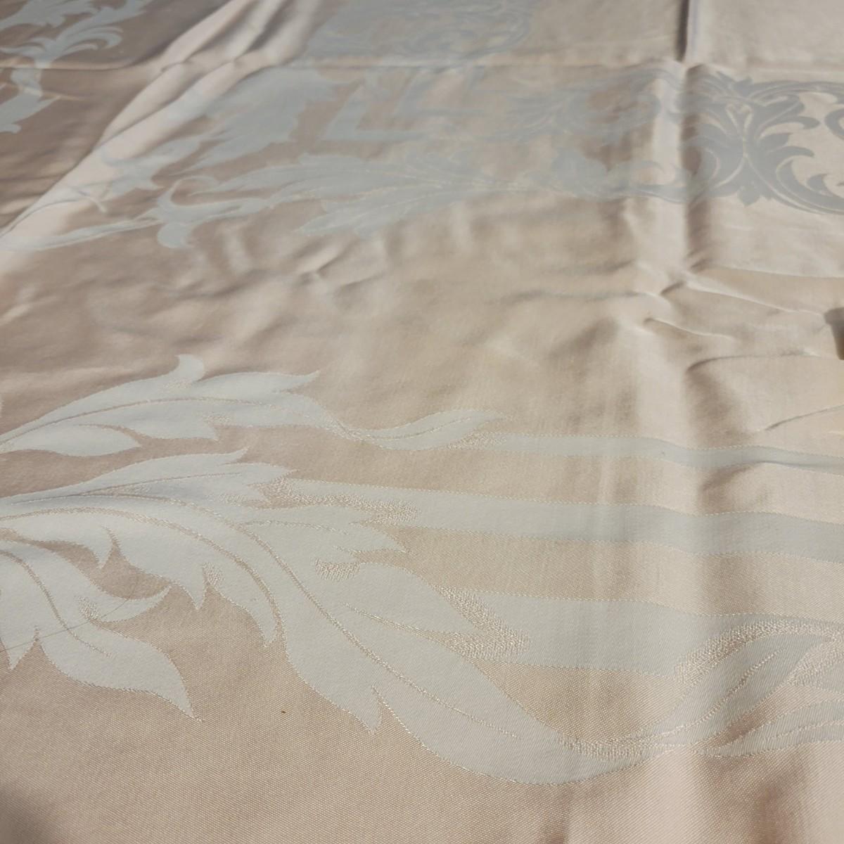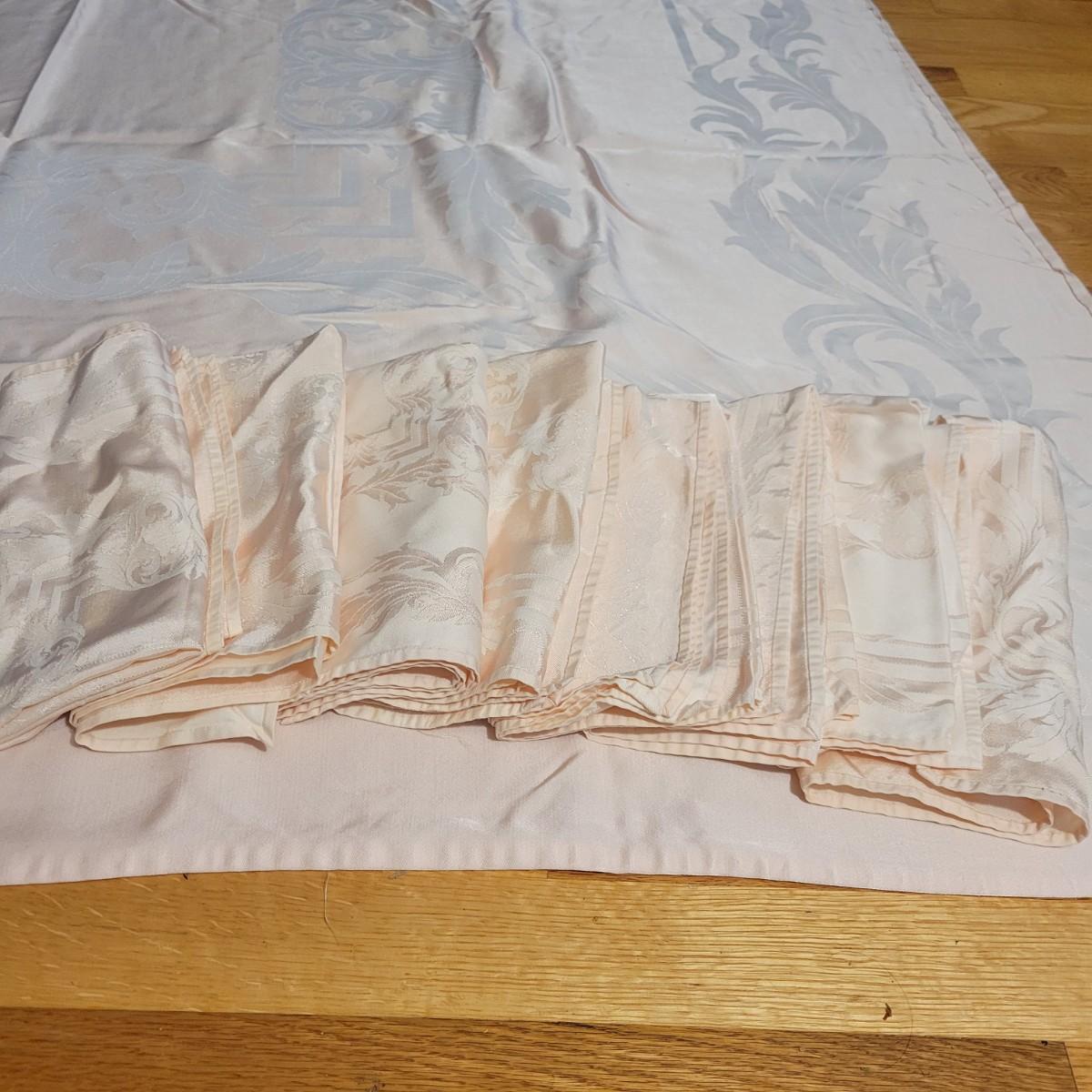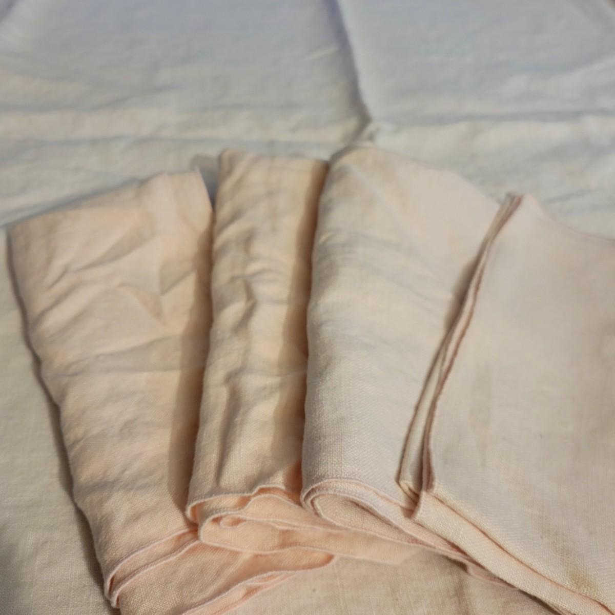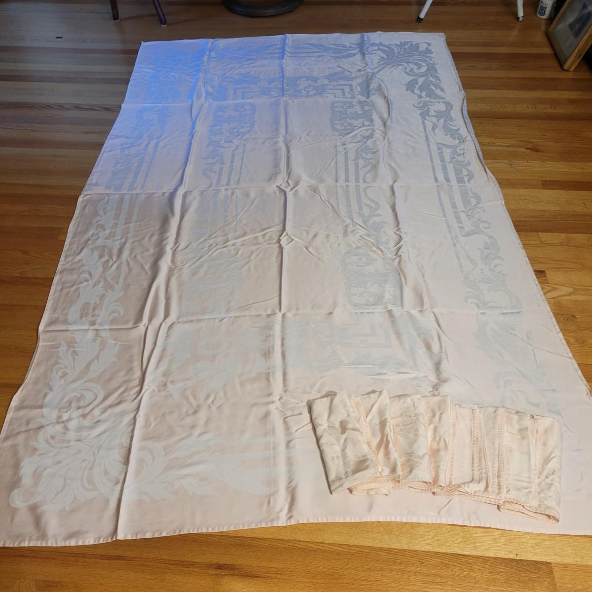 An assortment of tablecloths and napkins in good condition with no notable damage. A range of colors and fabrics from cotton to linen and a variety of sizes. Lot includes six tablecloths and over 20 napkins, some match tablecloths, others are accent pieces. The pink embossed tablecloth measures approximately 96" x 60" and the white tablecloth with cutouts measures approximately 78" x 60" Shipping available