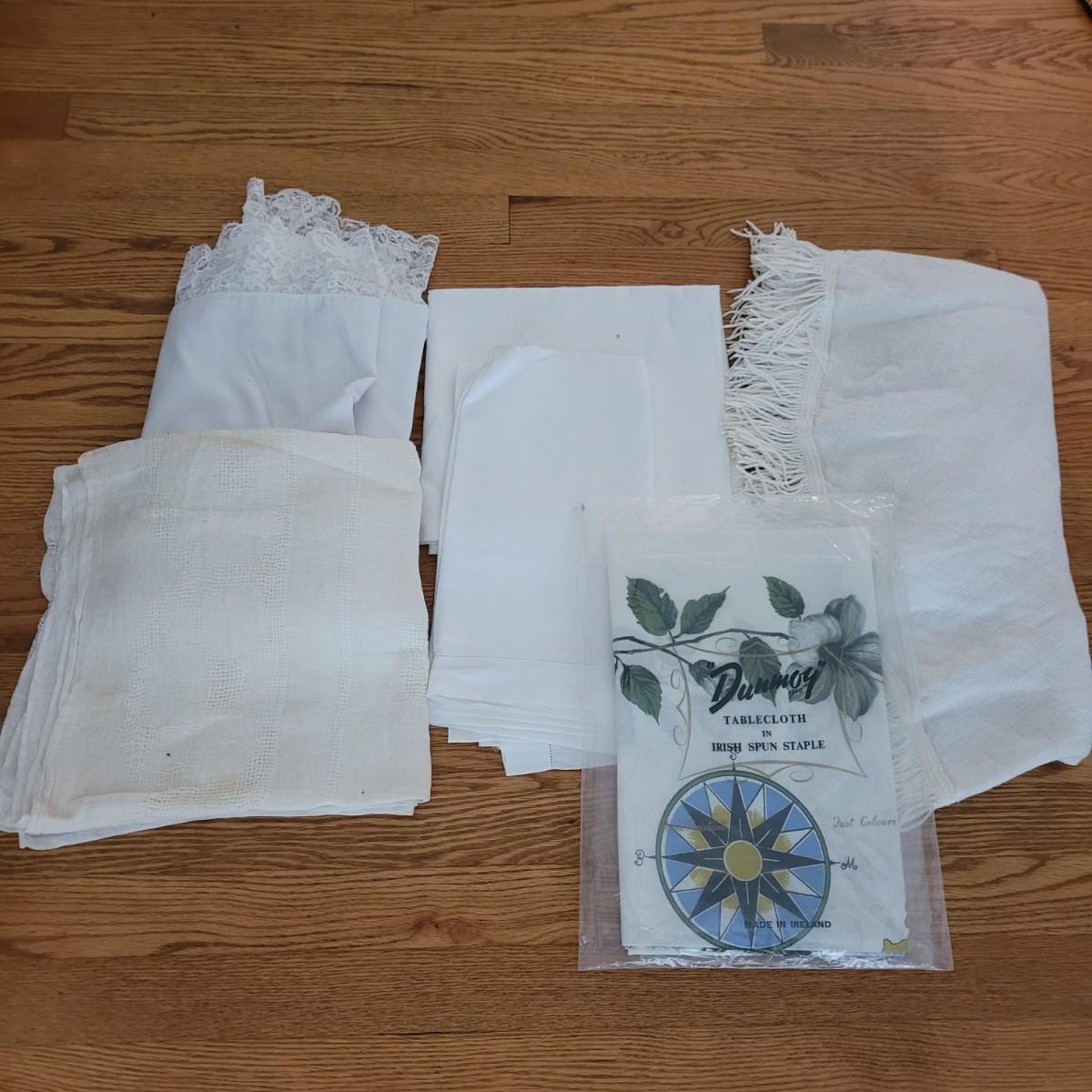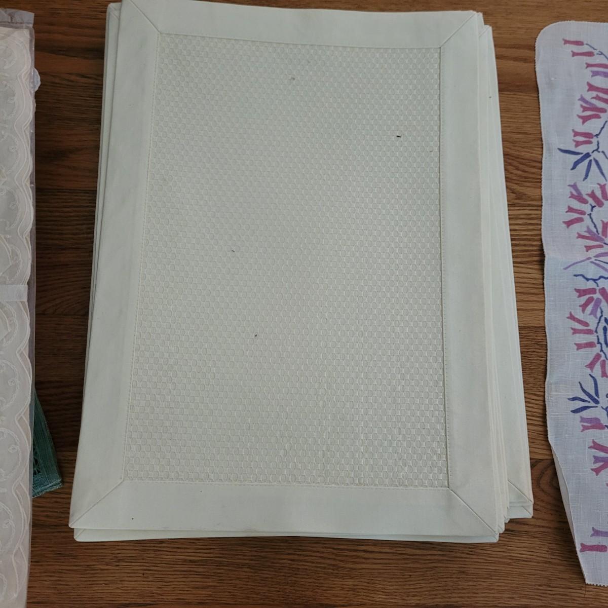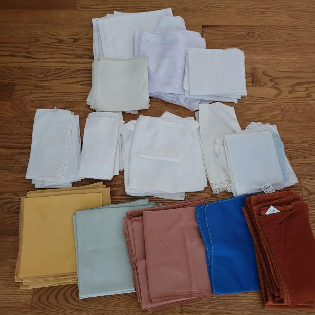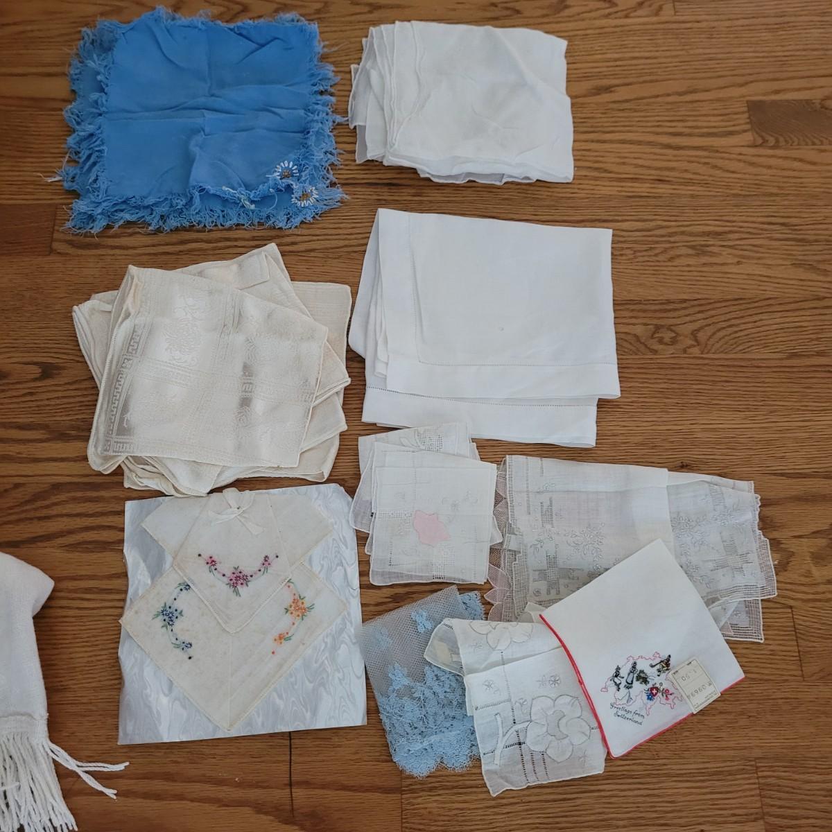Large assortment of tablecloths, placemats and napkins. Some doilies and kerchiefs are included as well. Some items appear unused, but most are very used, with stains on some items. Materials vary, including linen, muslin, cotton, silk and polyester. Shipping available.