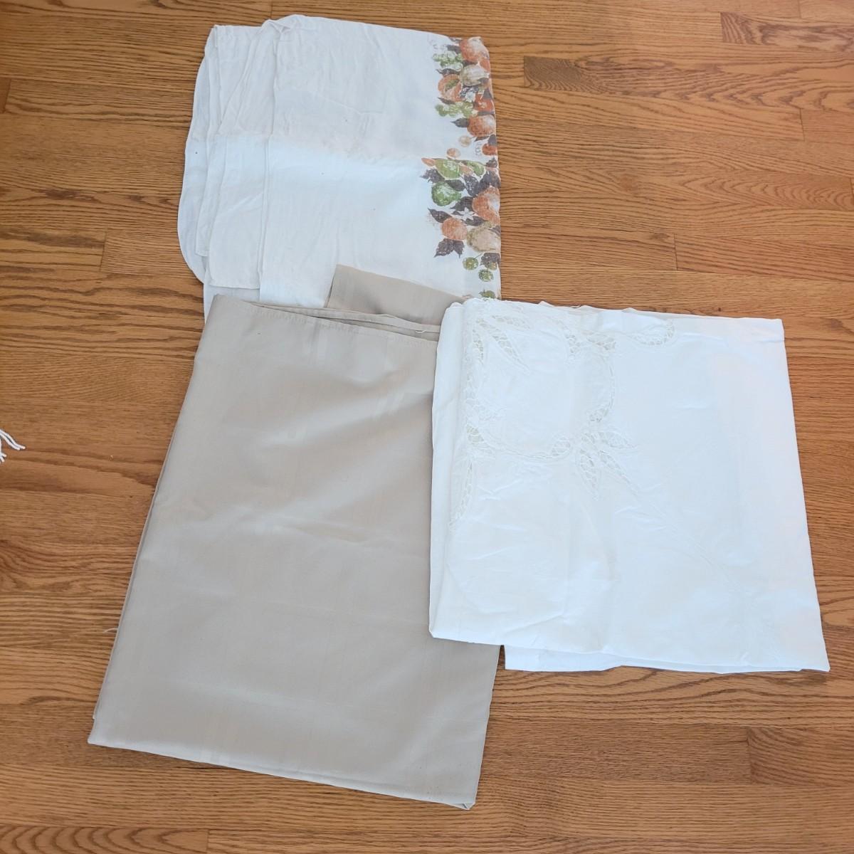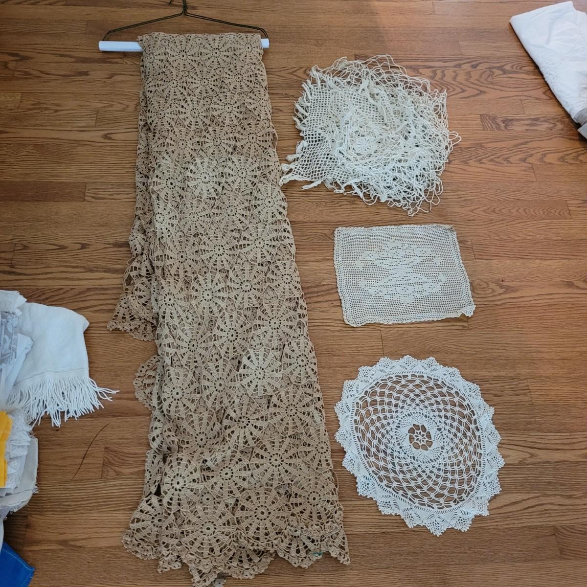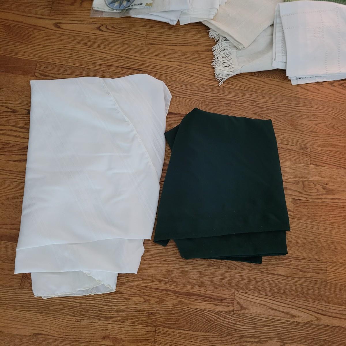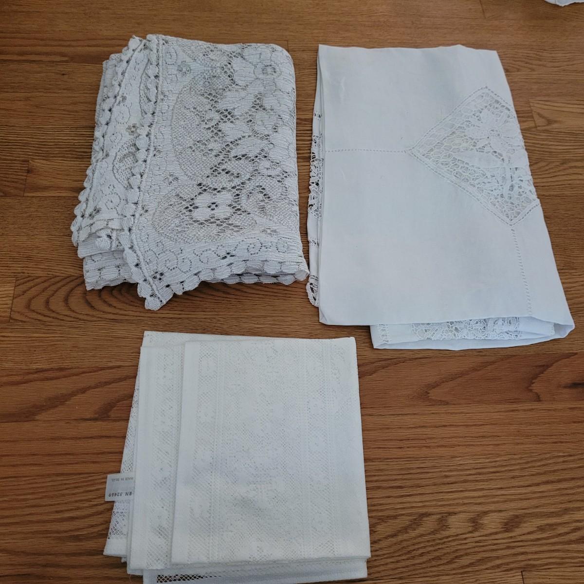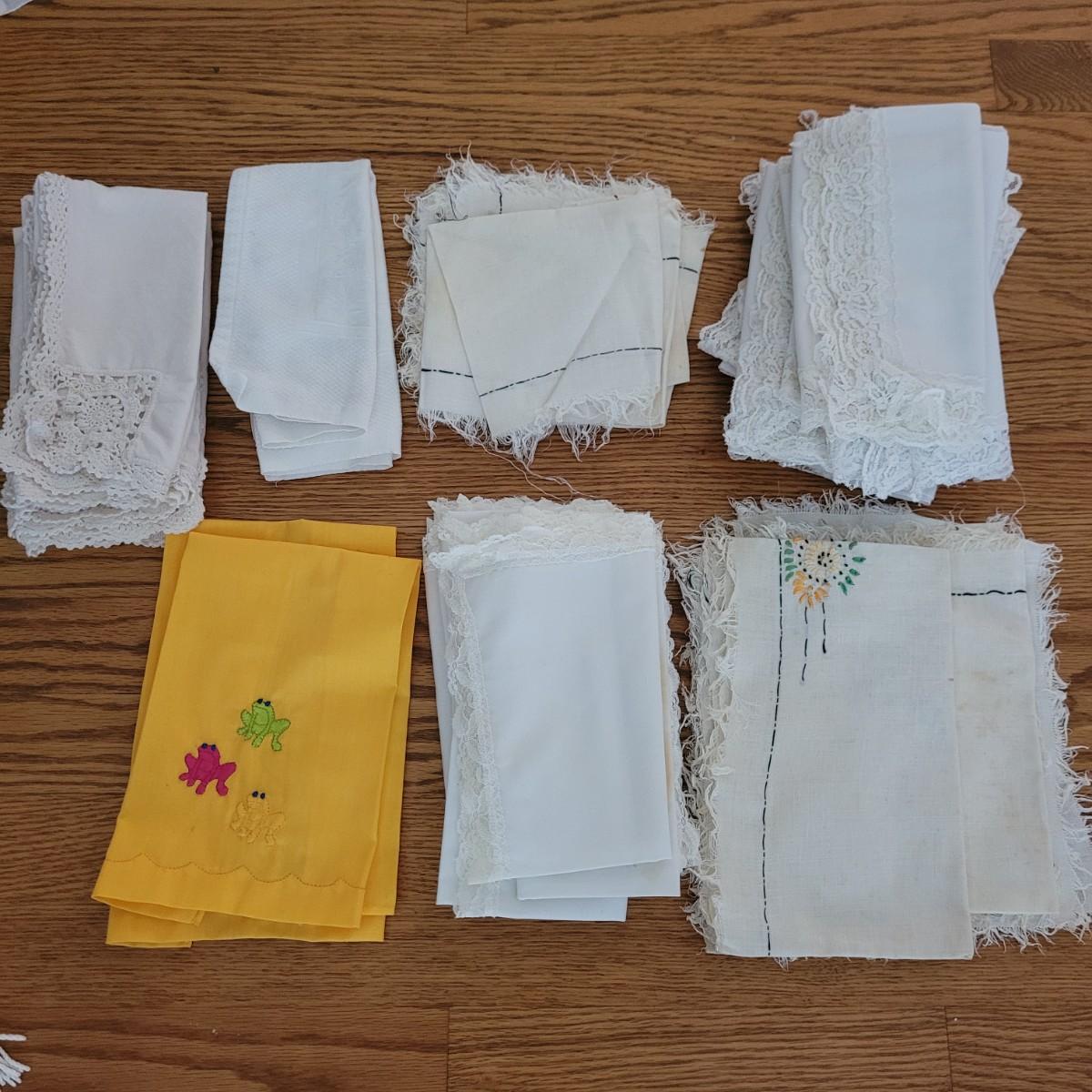 Large assortment of tablecloths, placemats and napkins. Some doilies and kerchiefs are included as well. Some items appear unused, but most are very used, with stains on some items. Materials vary, including linen, muslin, cotton, silk and polyester. Shipping available.