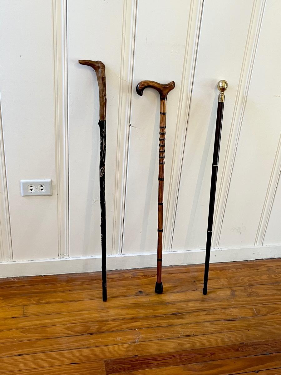 (1) Gold handle 35” H ~ (1) Carved from Jamaica 37” H ~ (1) Harvey 35” H