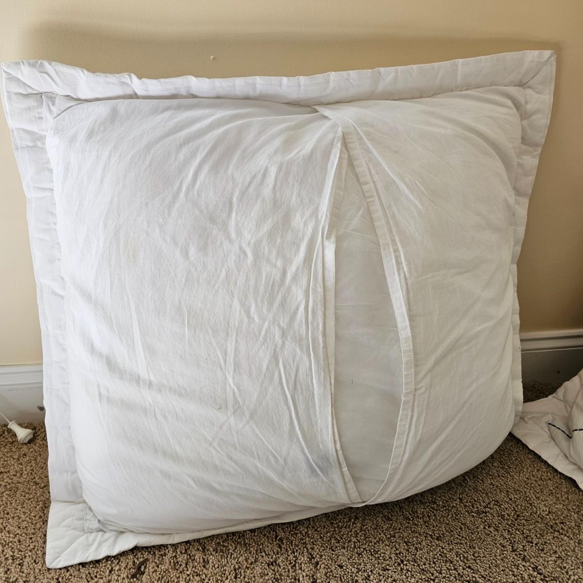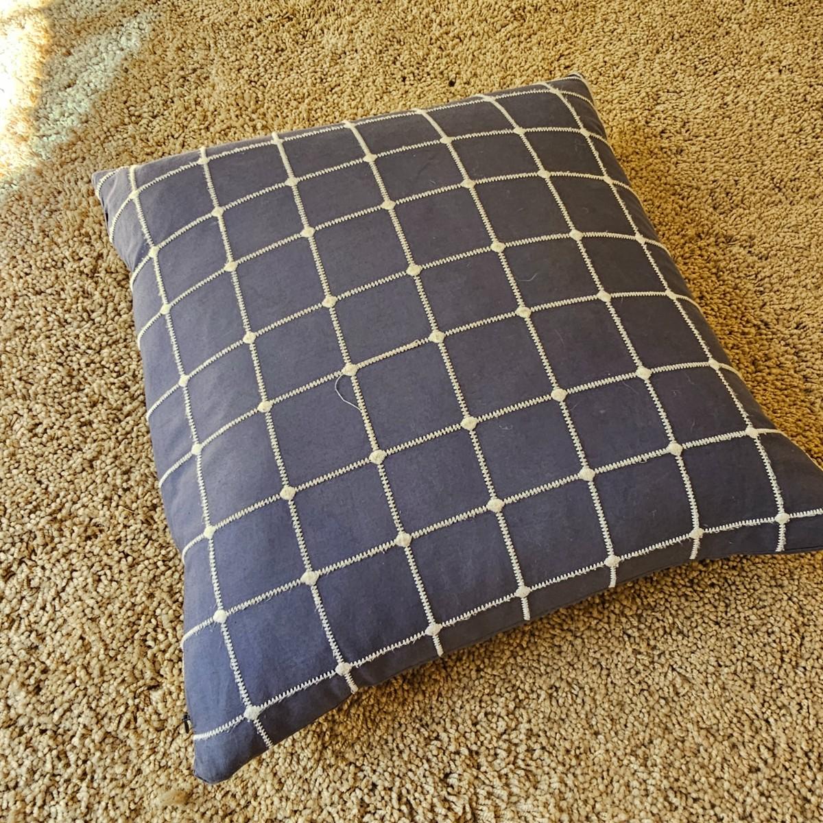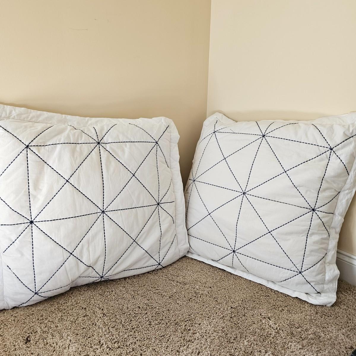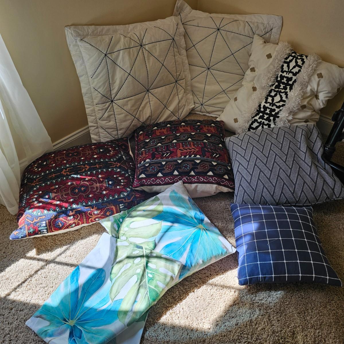 Seven large plump pillows to relax with and use for decor. Many of these are sham tops over pillows inside. Smallest blue with squares measures 14"x 14", largest pair of white and cross hatch are 28" x 28". There are some minor spots on the covers. See photos for details. Local pickup only.