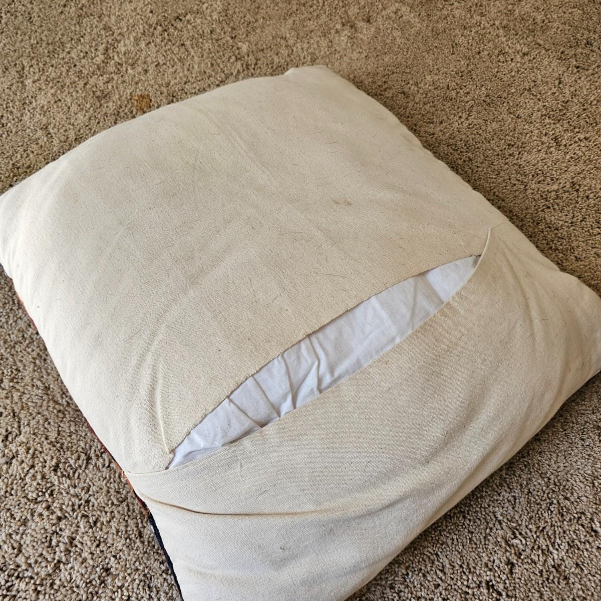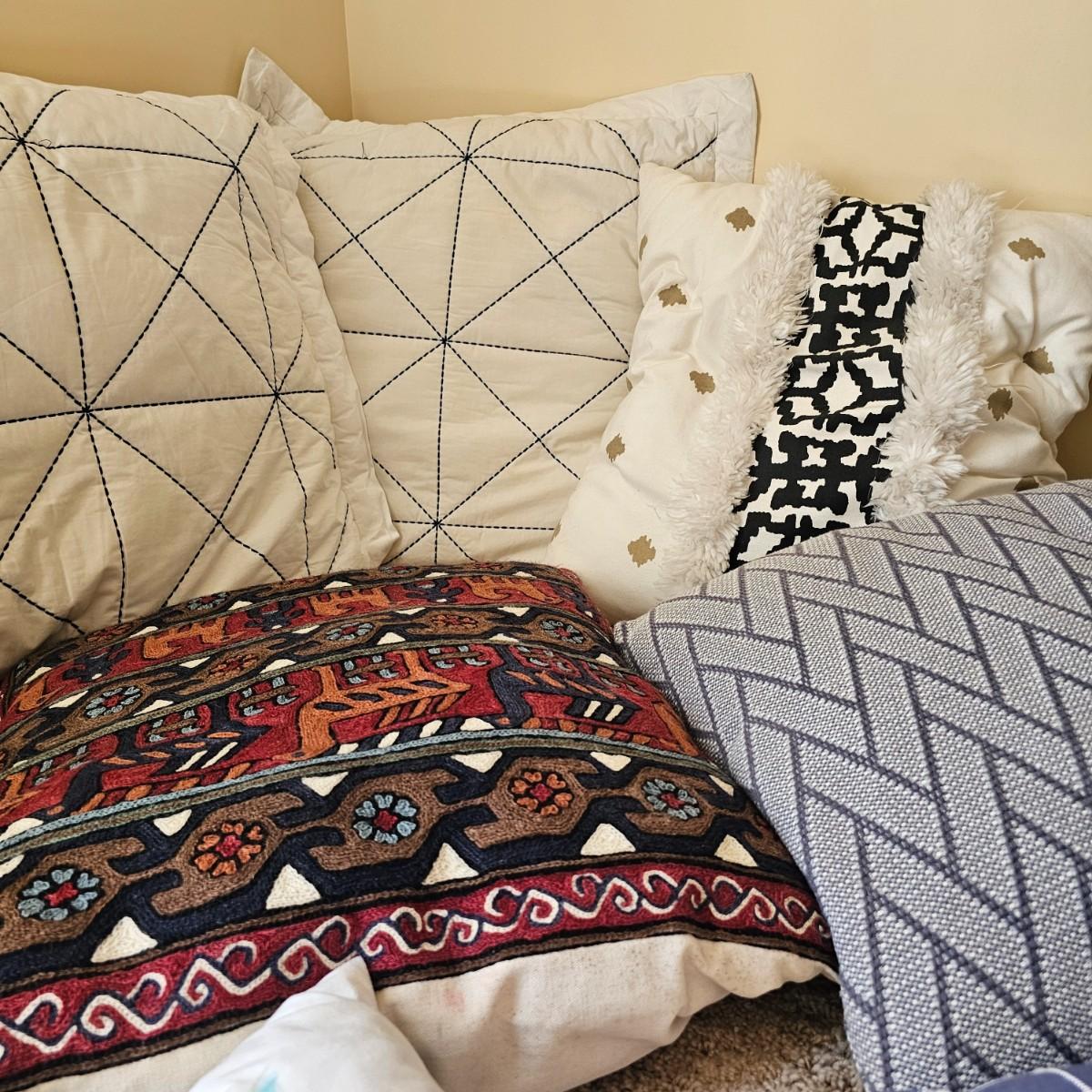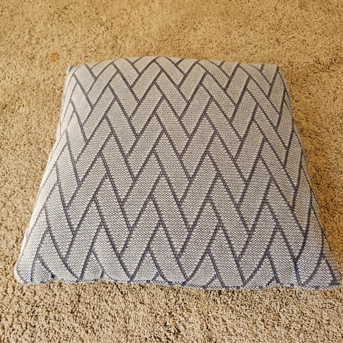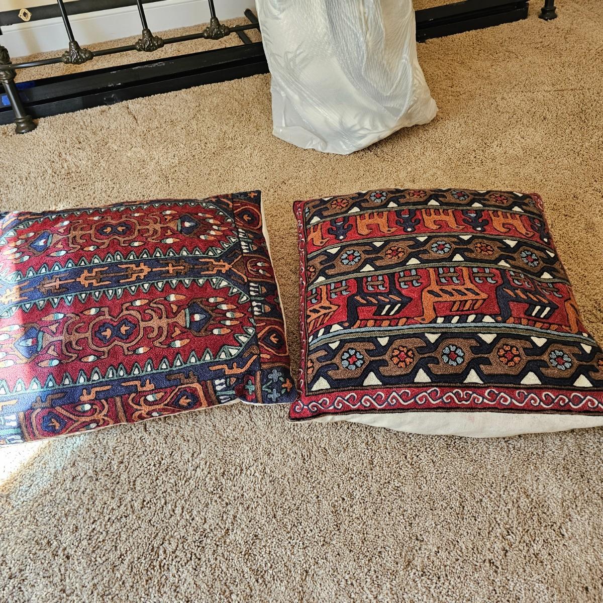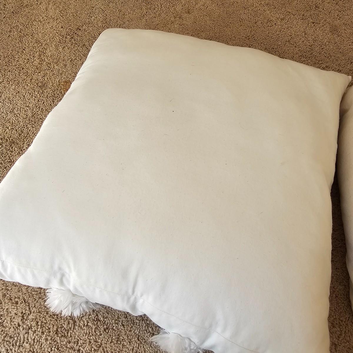 Seven large plump pillows to relax with and use for decor. Many of these are sham tops over pillows inside. Smallest blue with squares measures 14"x 14", largest pair of white and cross hatch are 28" x 28". There are some minor spots on the covers. See photos for details. Local pickup only.