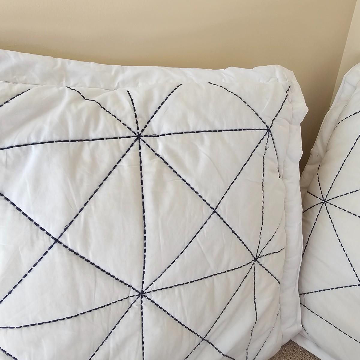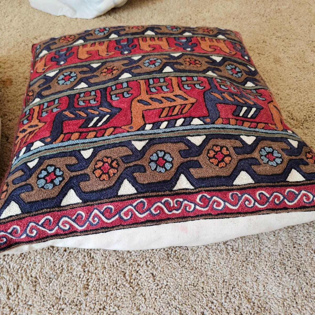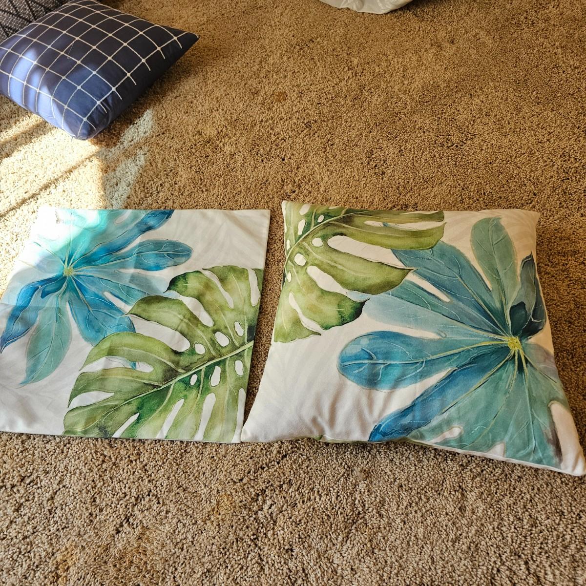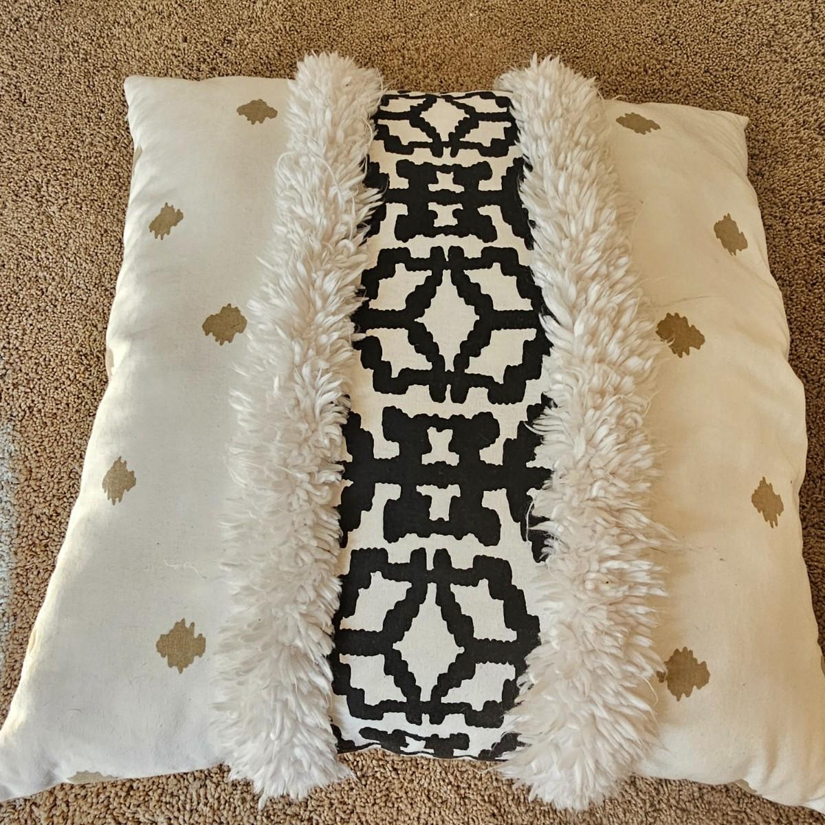 Seven large plump pillows to relax with and use for decor. Many of these are sham tops over pillows inside. Smallest blue with squares measures 14"x 14", largest pair of white and cross hatch are 28" x 28". There are some minor spots on the covers. See photos for details. Local pickup only.