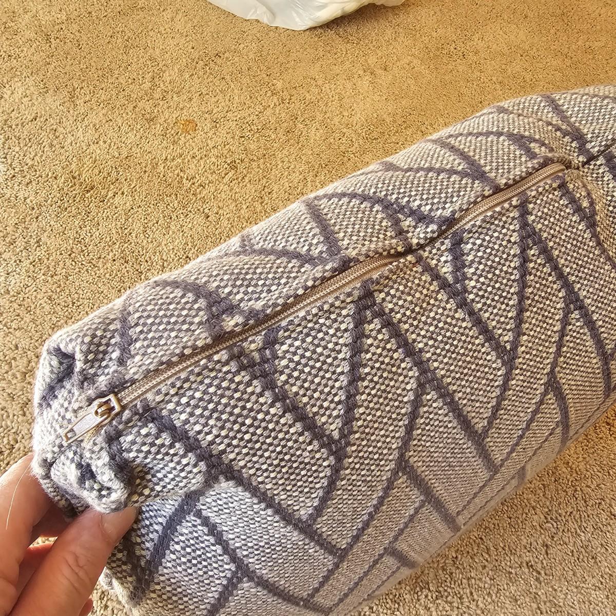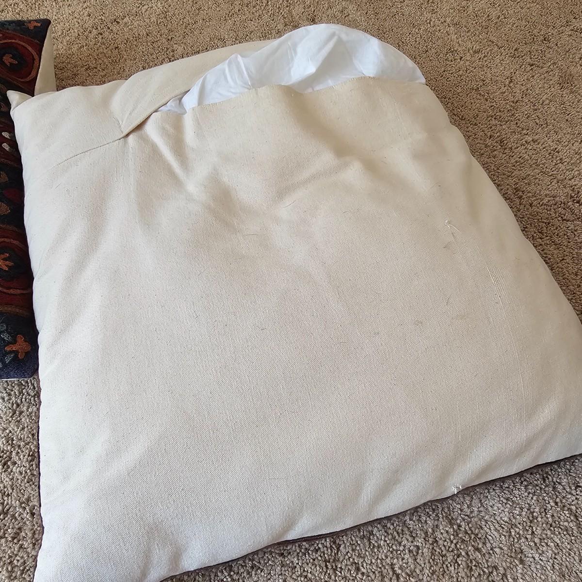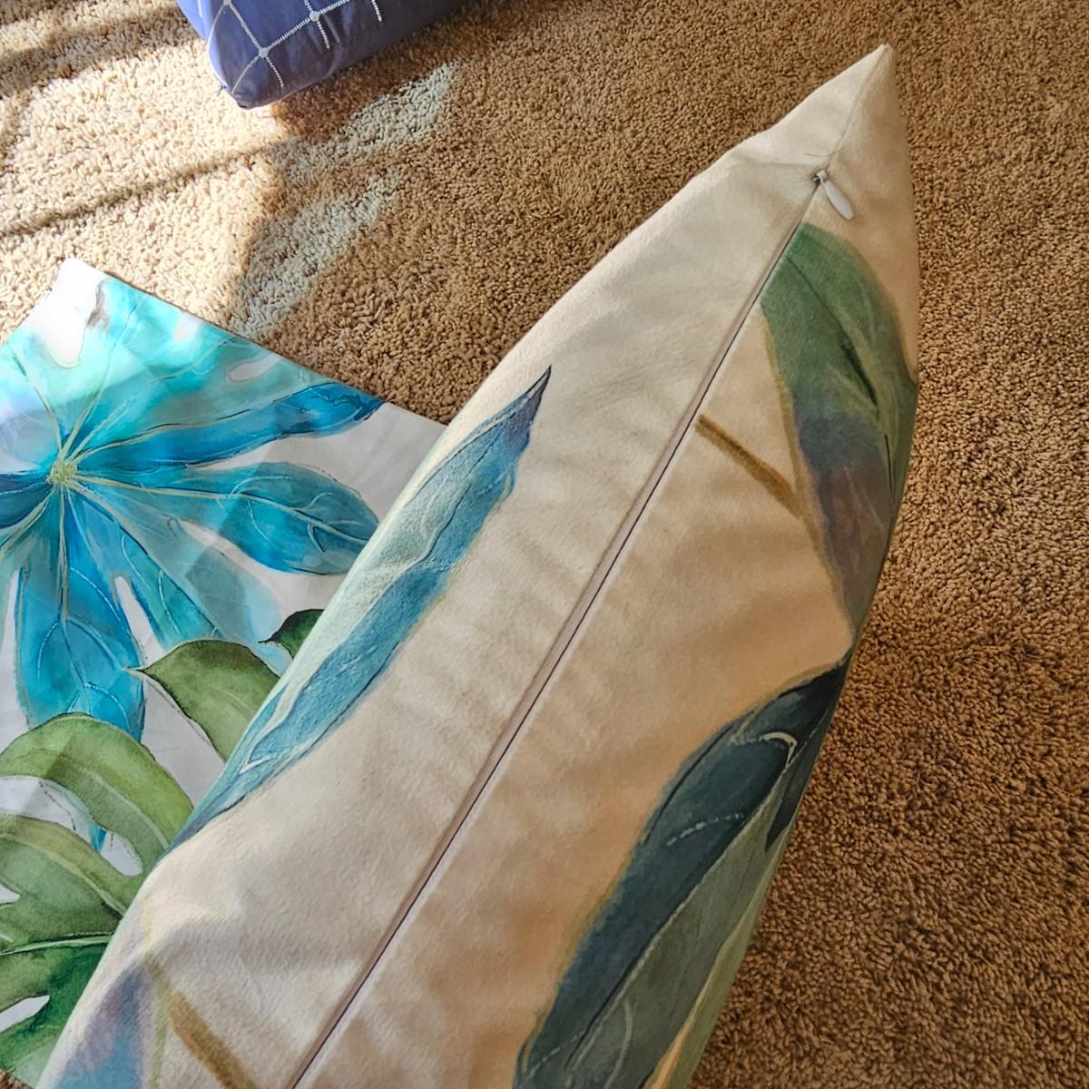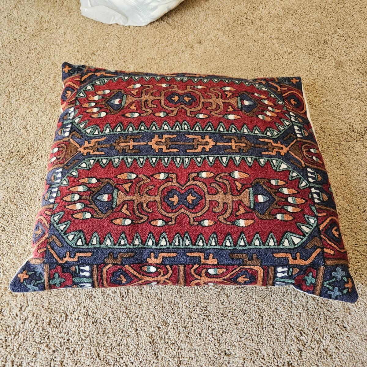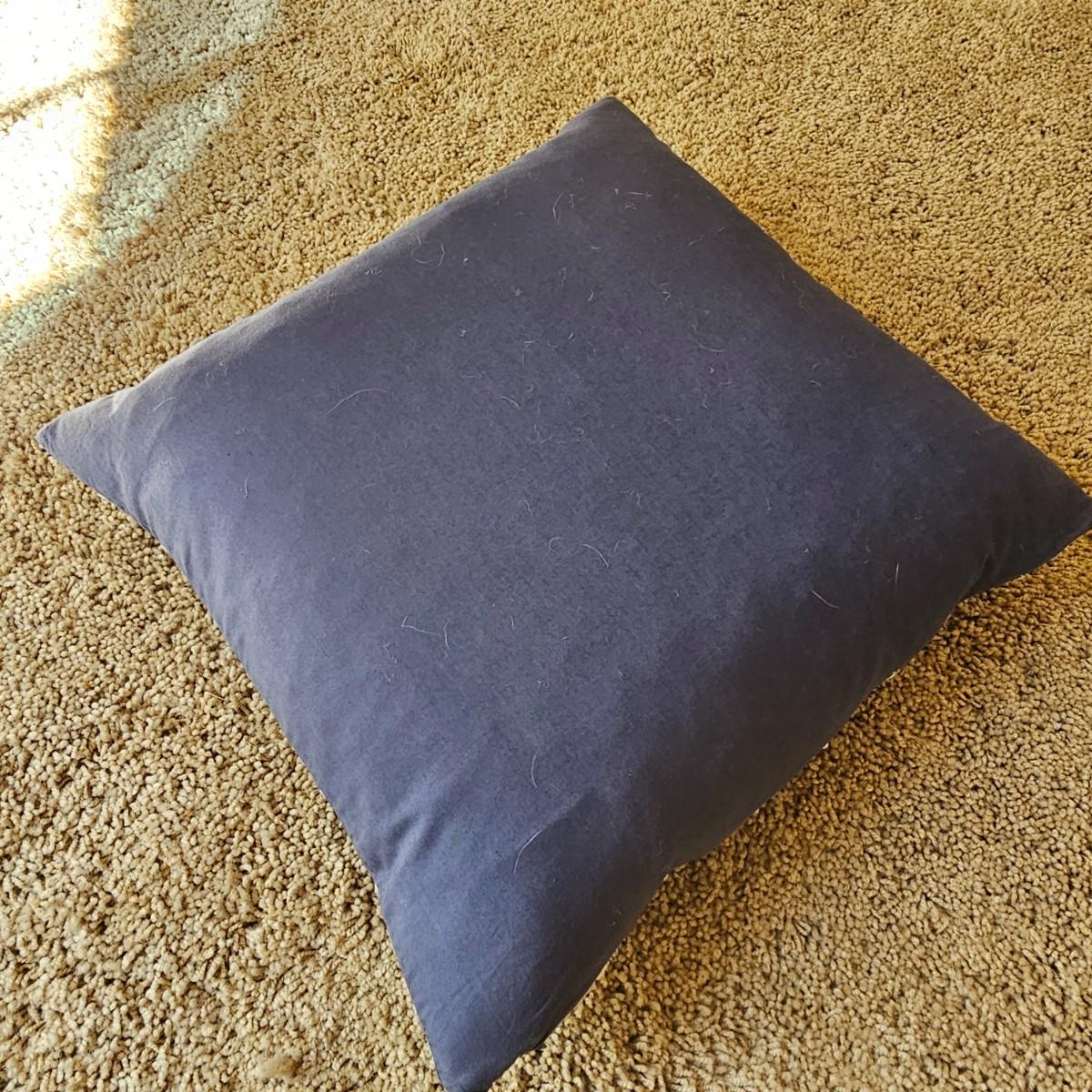 Seven large plump pillows to relax with and use for decor. Many of these are sham tops over pillows inside. Smallest blue with squares measures 14"x 14", largest pair of white and cross hatch are 28" x 28". There are some minor spots on the covers. See photos for details. Local pickup only.