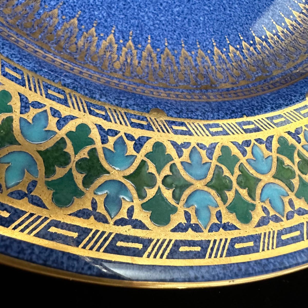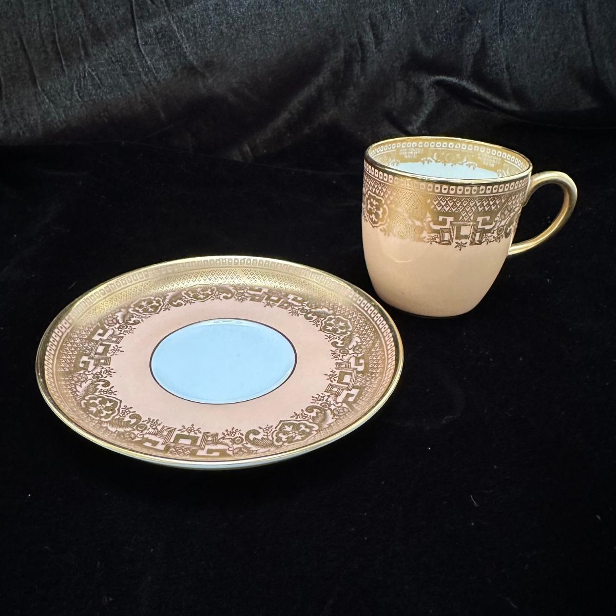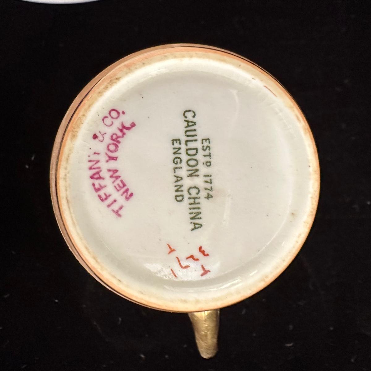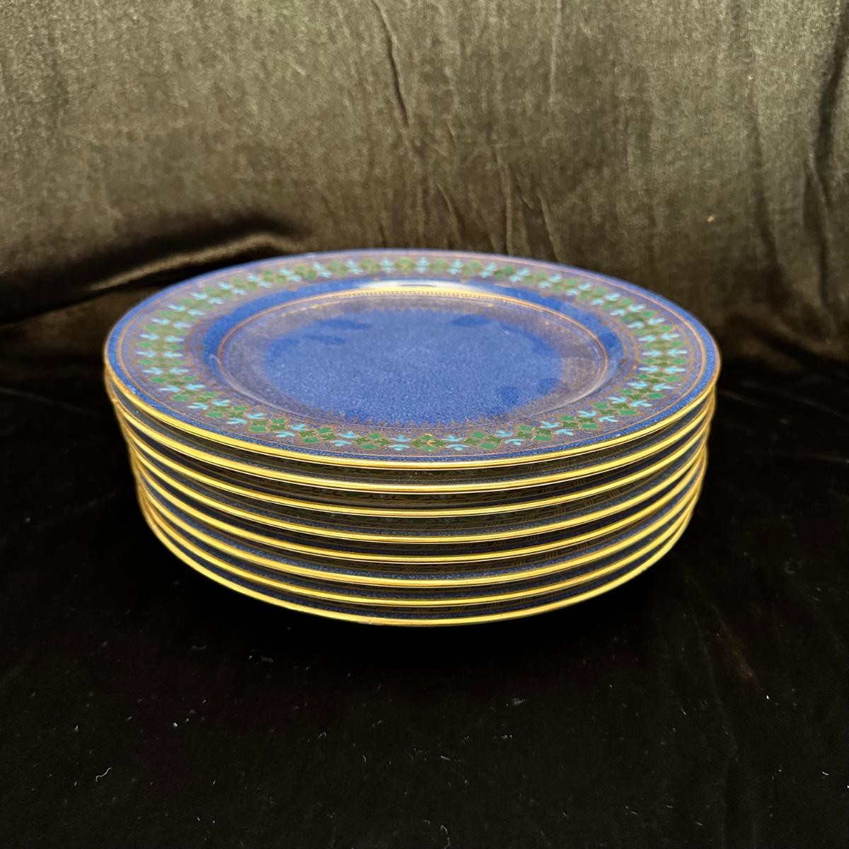 Tiffany white with what appears to be gold trim plates. Large plate measures 10.5” D and small plate measures 6” D. Blue and green plates with gold accent measures 10”D. Small cup and saucer sets. Cups measure 2.5” X 2.5”H and saucers are 4.5”D. Shipping available.