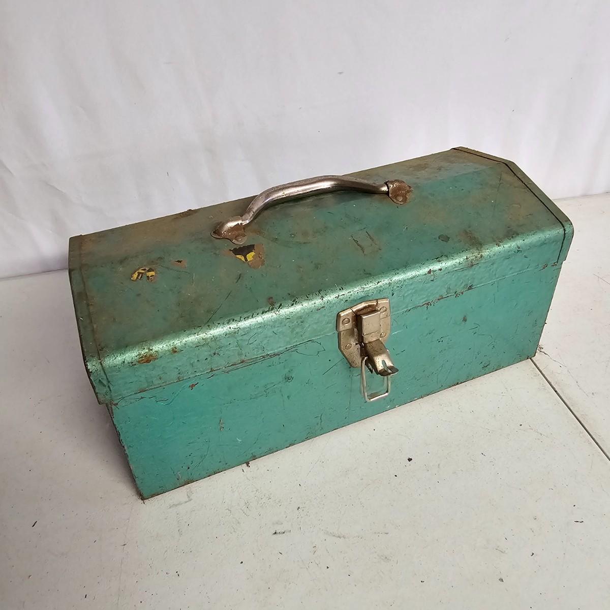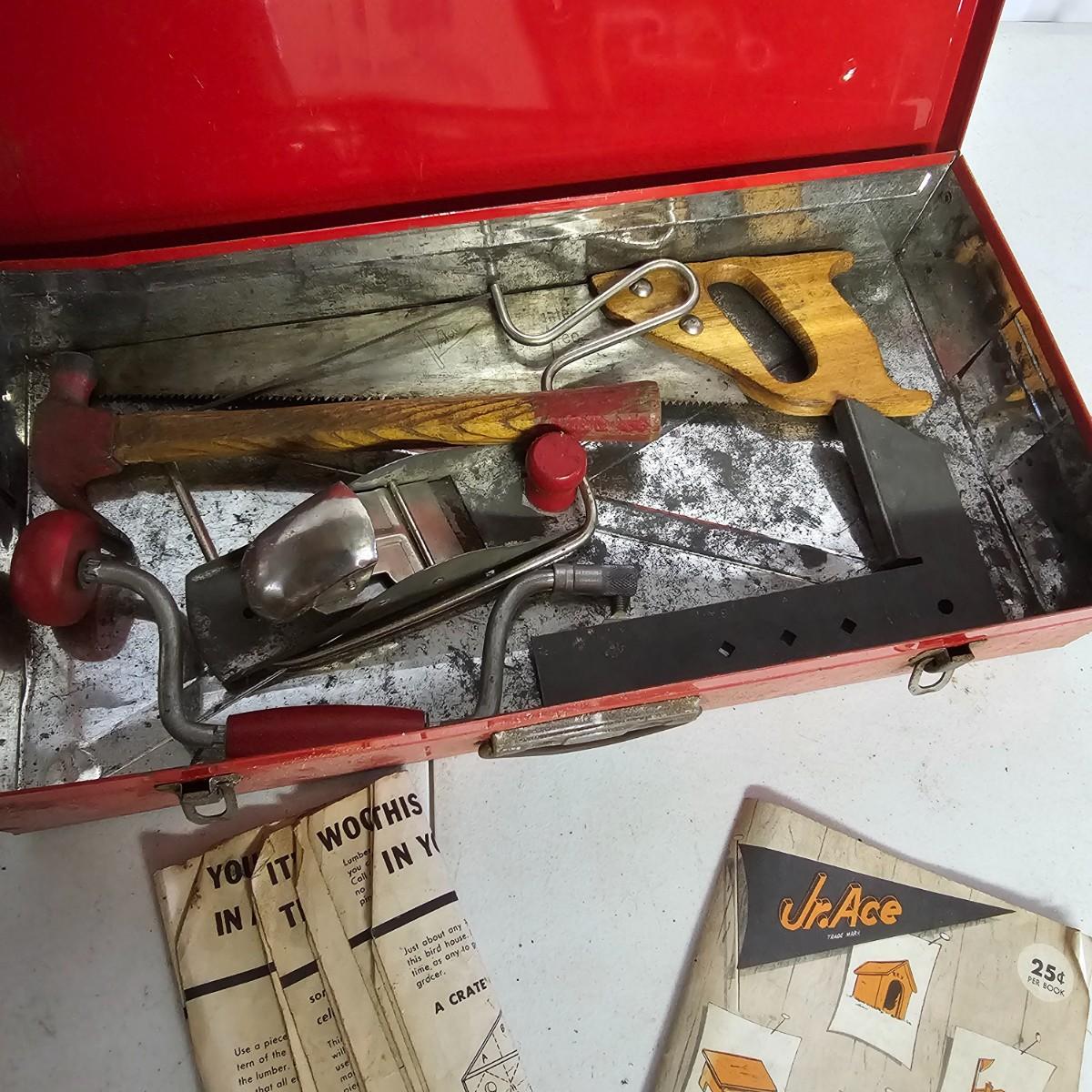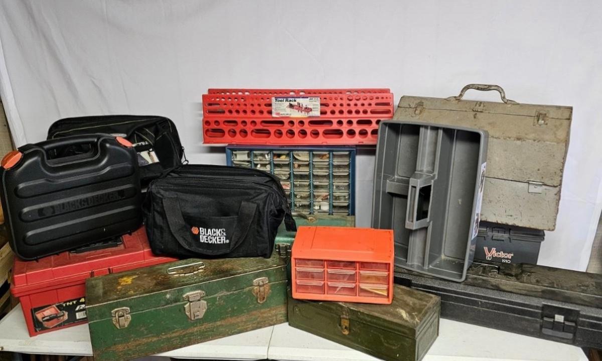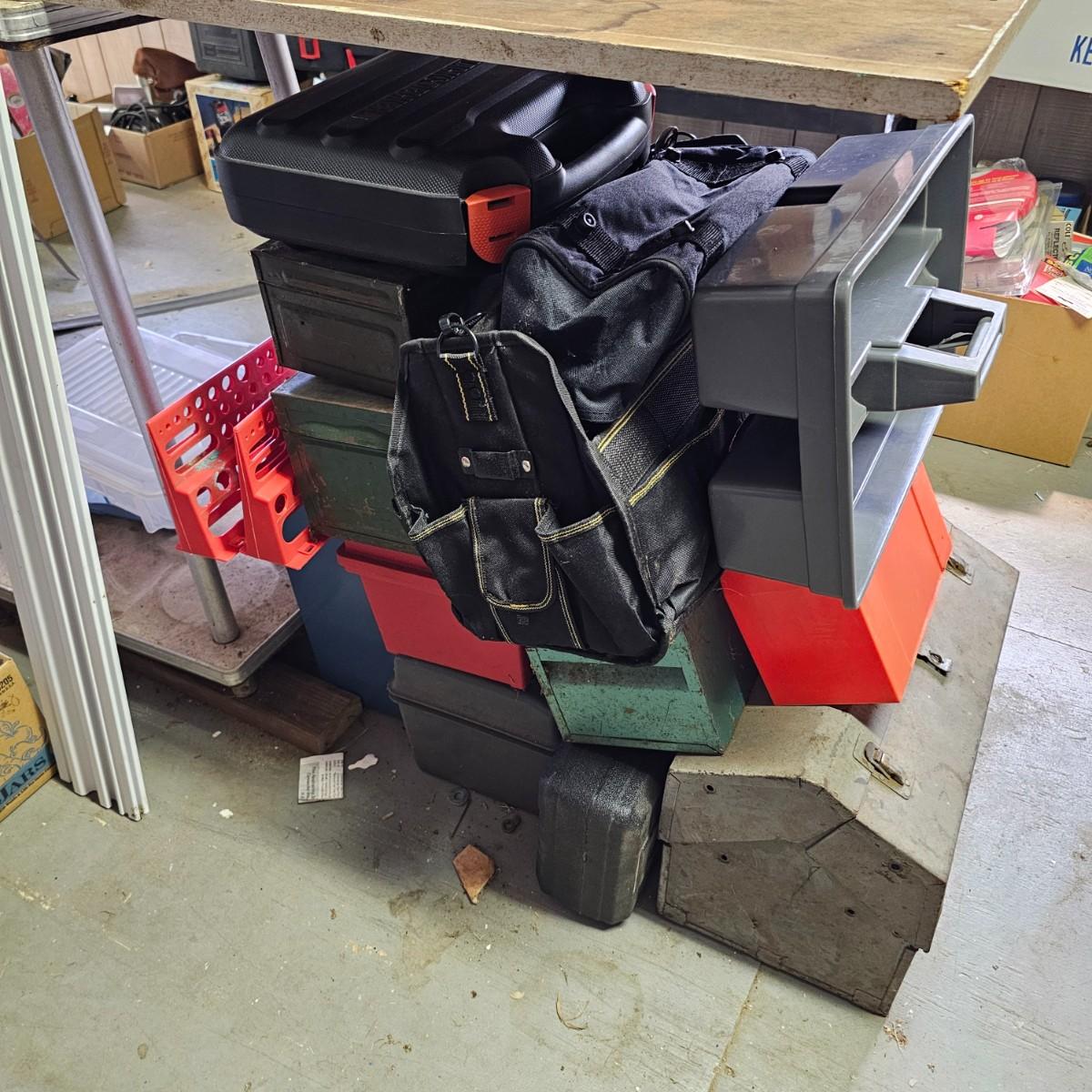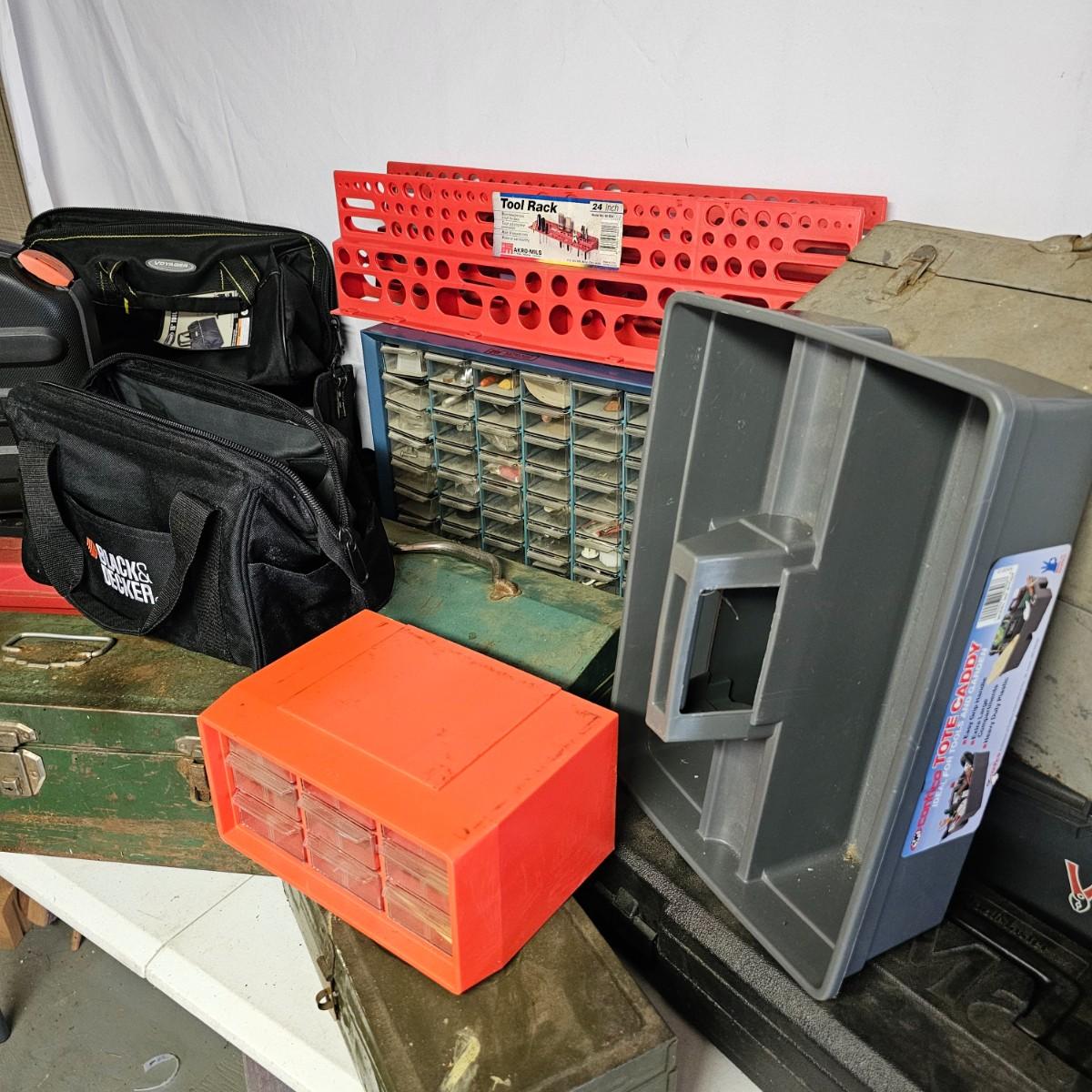 Over a dozen pieces here, metal, plastic, fabric items . Older metal style toolboxes, some have interior trays, others not. Tool caddies, fabric tool carry alls and more. Blue drawer units is full of miscellaneous hardware. Large gray hip roof box measures 18" x 11" x 14"H. Also a red metal chest with a young person's beginning tool set and plans. Rust and dirt on most items, but some bags look new. See photos for details. Local pickup only.