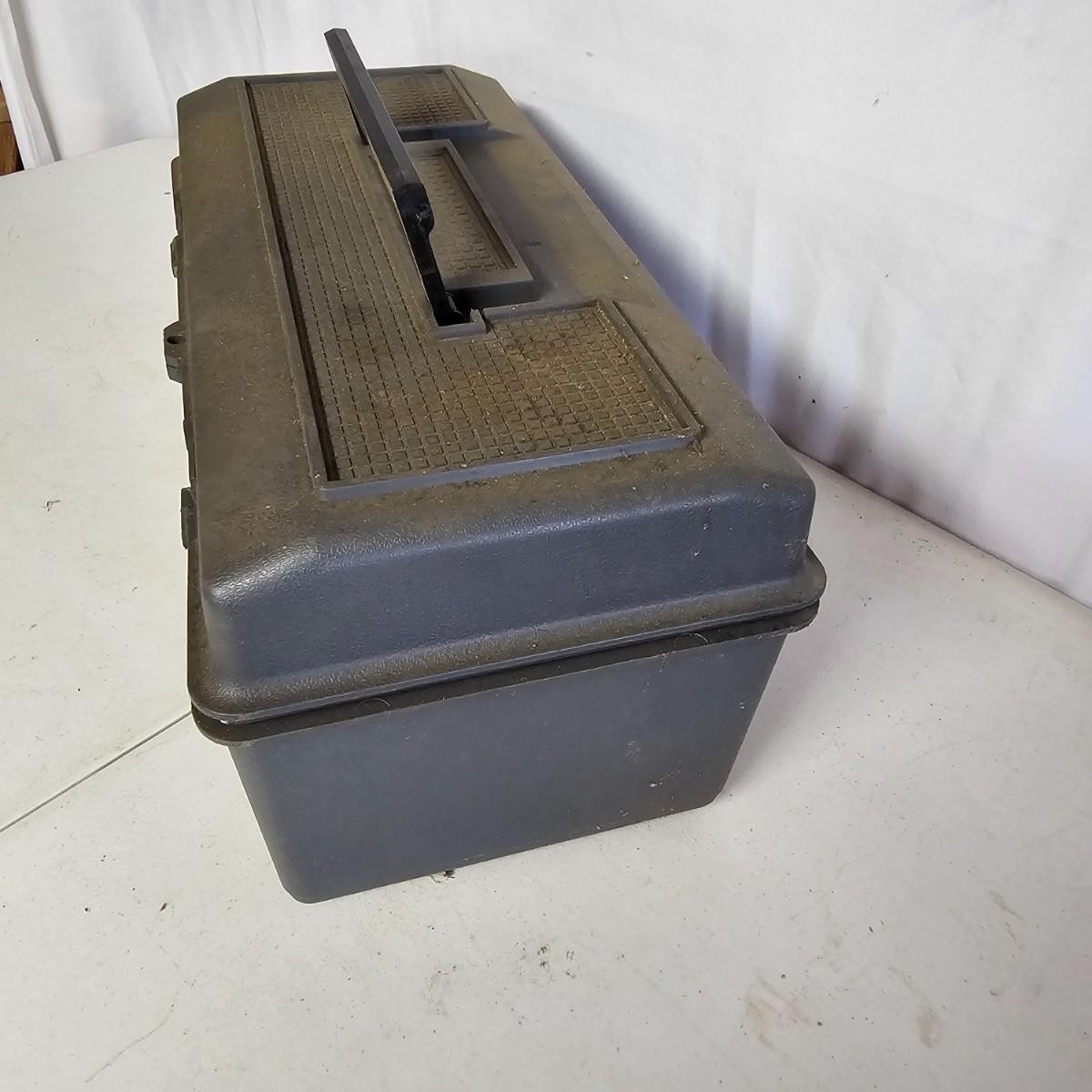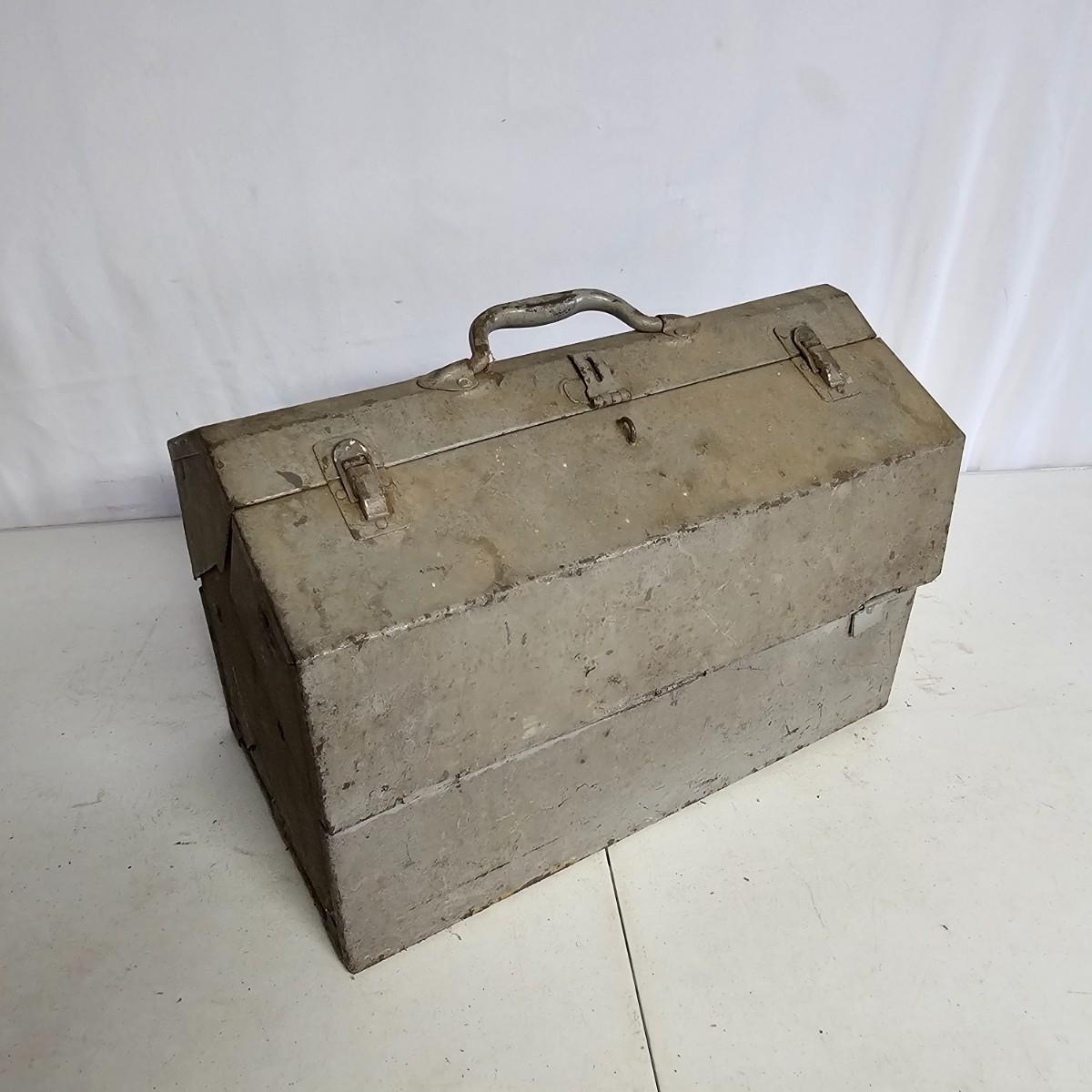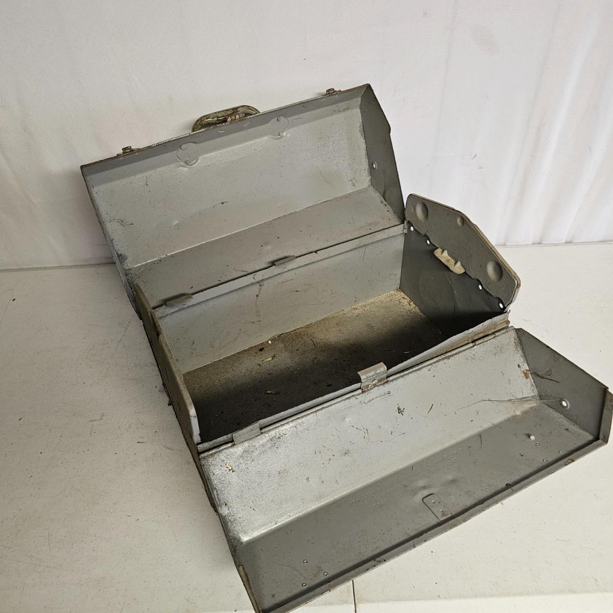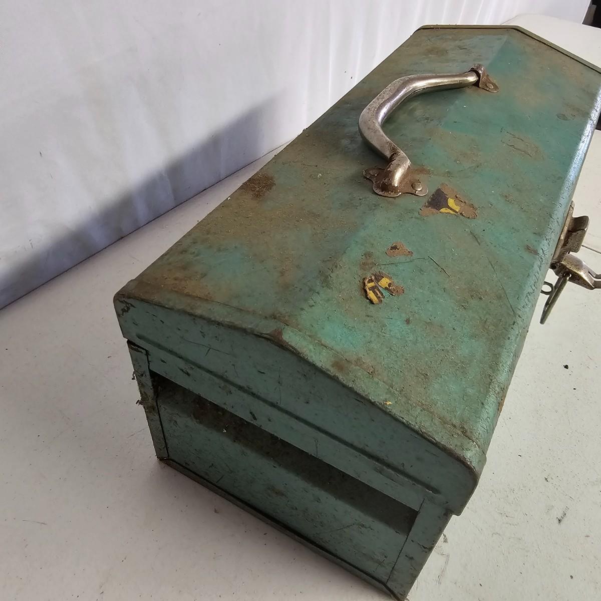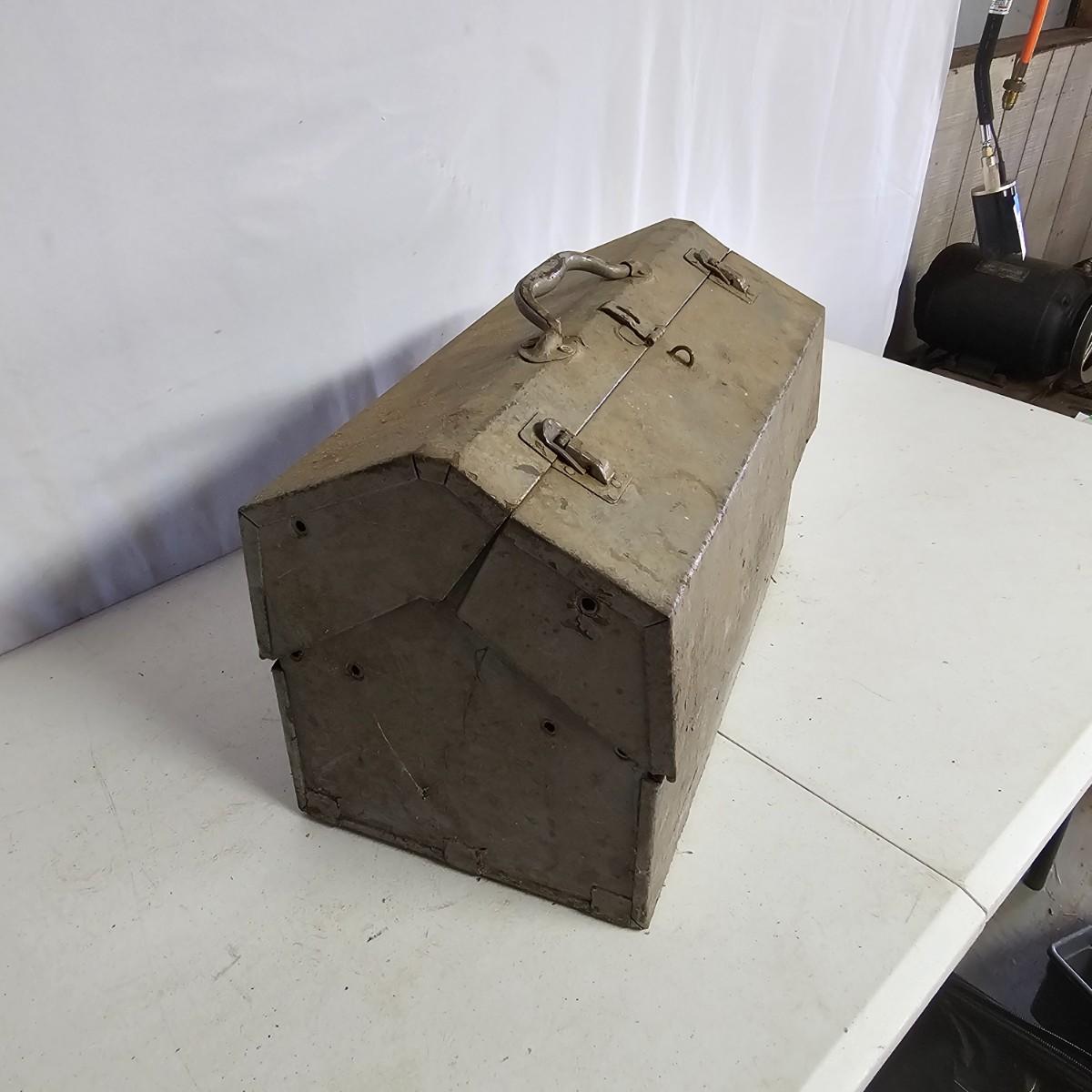 Over a dozen pieces here, metal, plastic, fabric items . Older metal style toolboxes, some have interior trays, others not. Tool caddies, fabric tool carry alls and more. Blue drawer units is full of miscellaneous hardware. Large gray hip roof box measures 18" x 11" x 14"H. Also a red metal chest with a young person's beginning tool set and plans. Rust and dirt on most items, but some bags look new. See photos for details. Local pickup only.