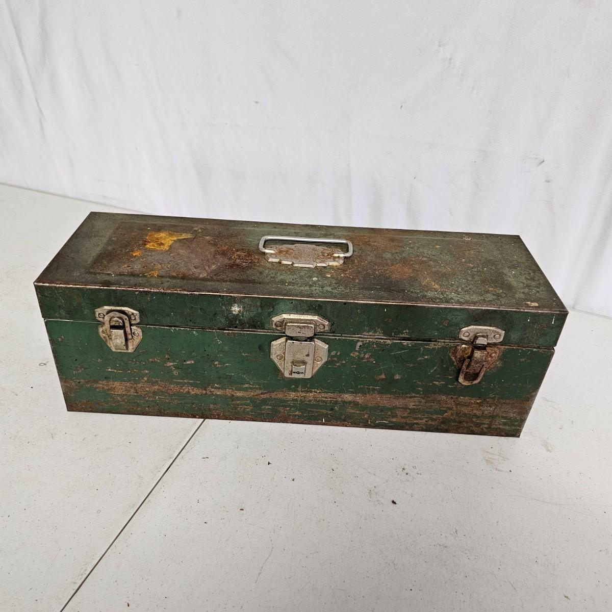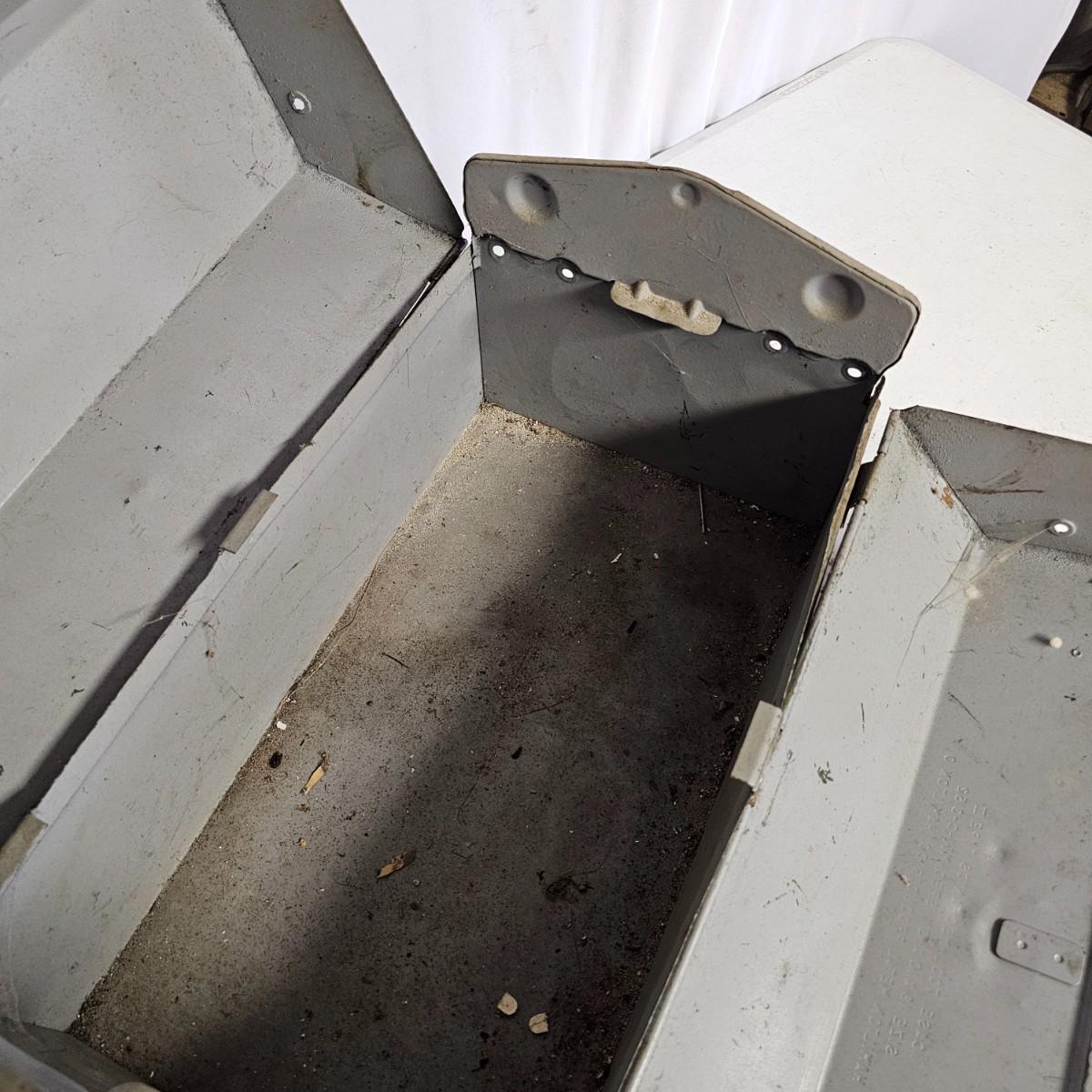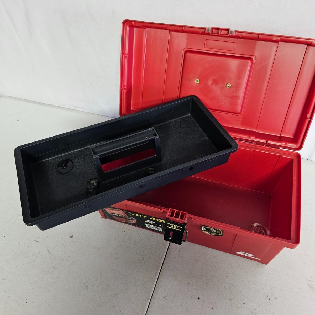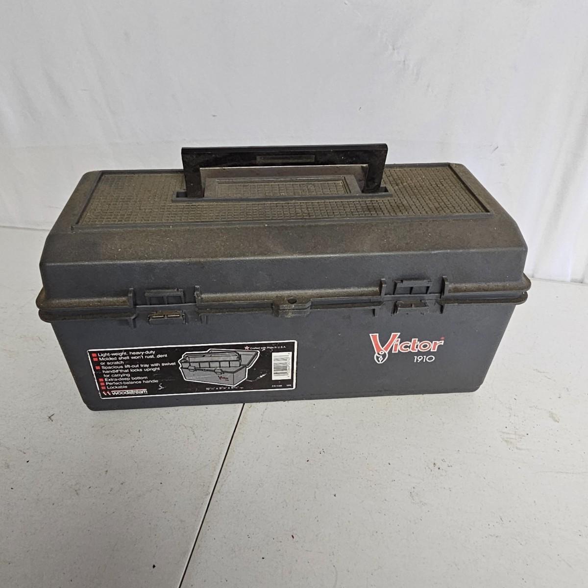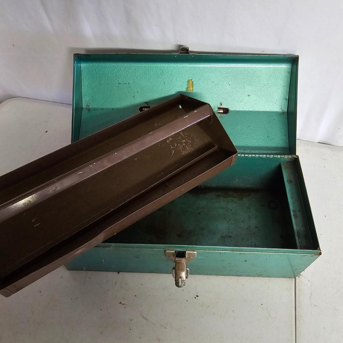 Over a dozen pieces here, metal, plastic, fabric items . Older metal style toolboxes, some have interior trays, others not. Tool caddies, fabric tool carry alls and more. Blue drawer units is full of miscellaneous hardware. Large gray hip roof box measures 18" x 11" x 14"H. Also a red metal chest with a young person's beginning tool set and plans. Rust and dirt on most items, but some bags look new. See photos for details. Local pickup only.