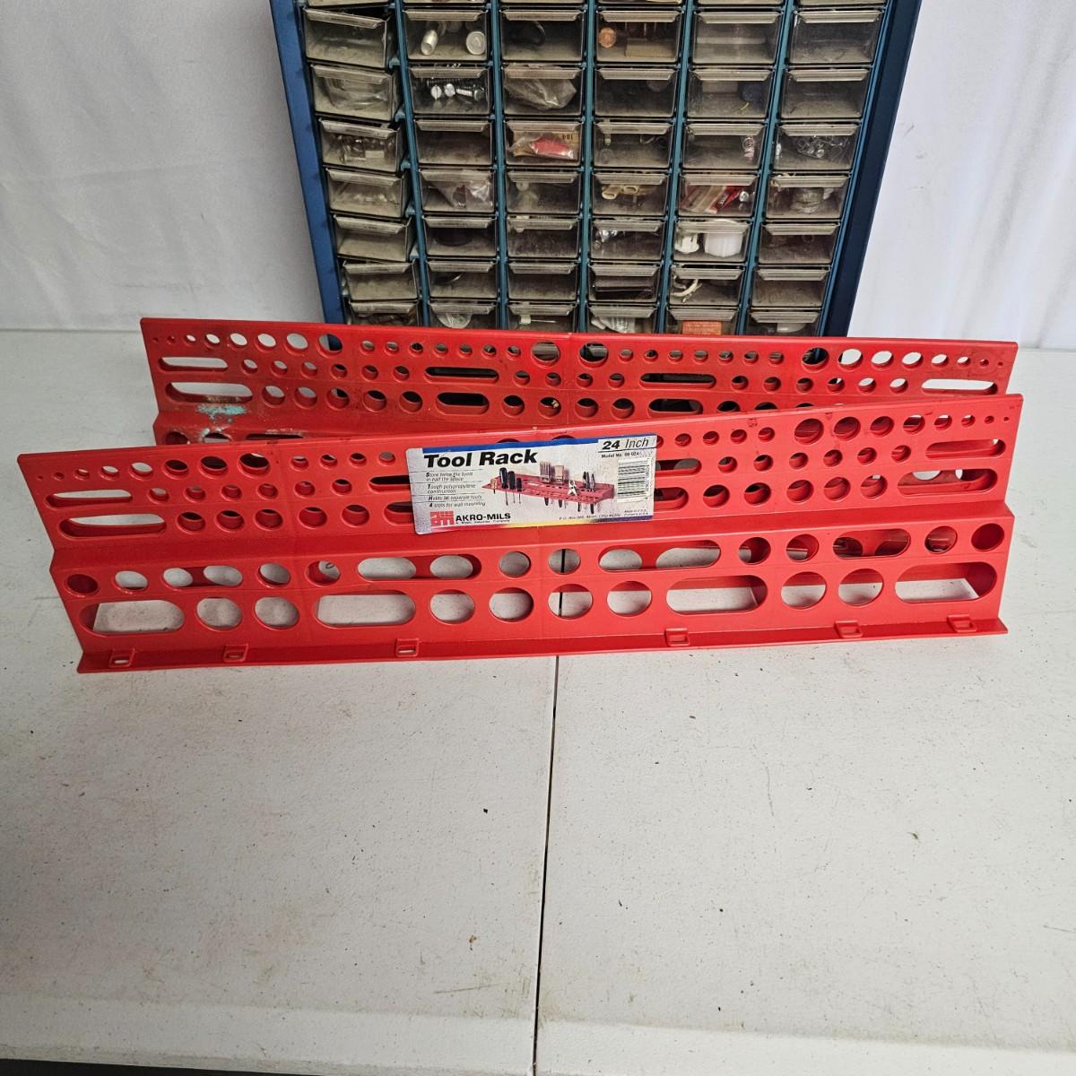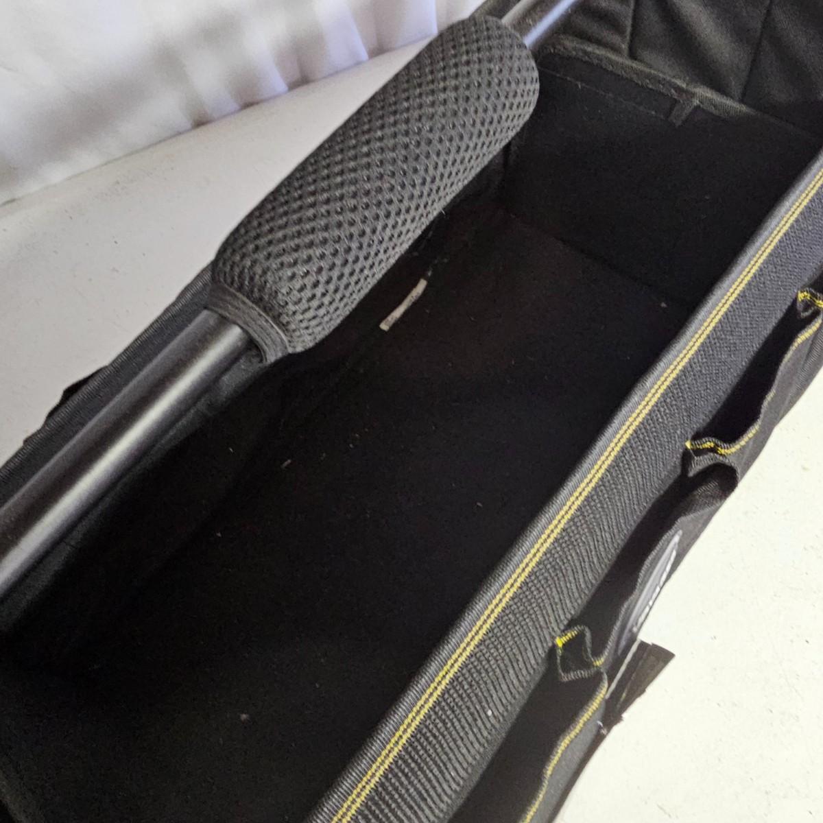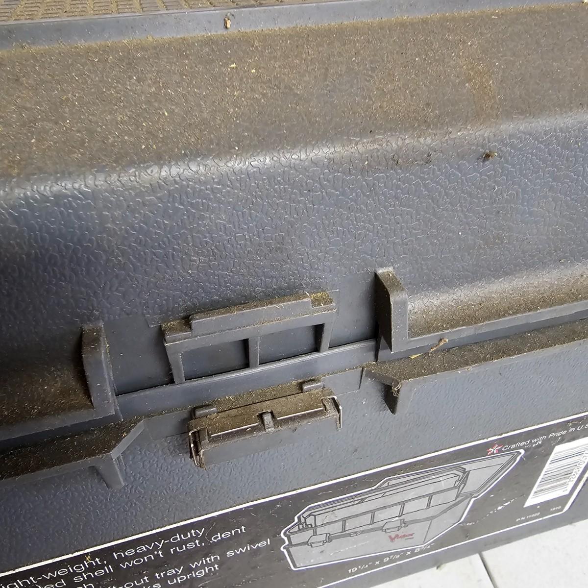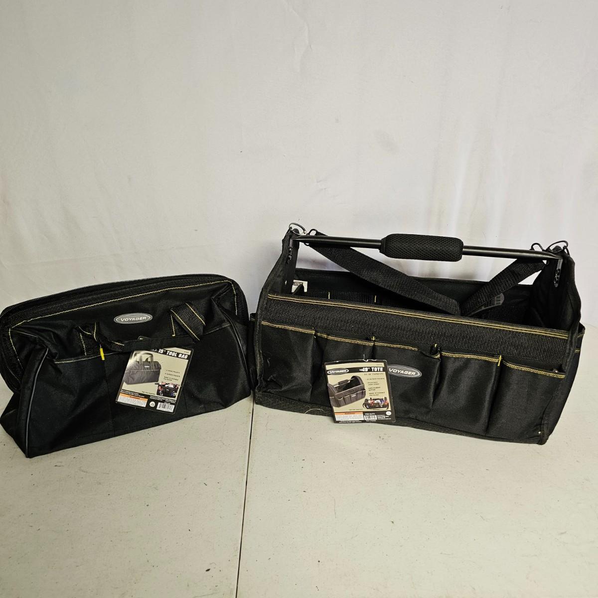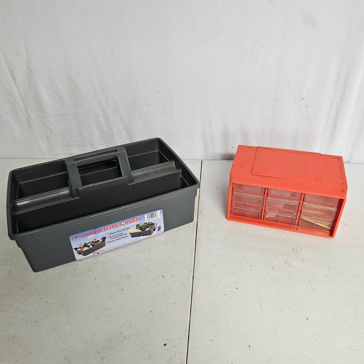 Over a dozen pieces here, metal, plastic, fabric items . Older metal style toolboxes, some have interior trays, others not. Tool caddies, fabric tool carry alls and more. Blue drawer units is full of miscellaneous hardware. Large gray hip roof box measures 18" x 11" x 14"H. Also a red metal chest with a young person's beginning tool set and plans. Rust and dirt on most items, but some bags look new. See photos for details. Local pickup only.