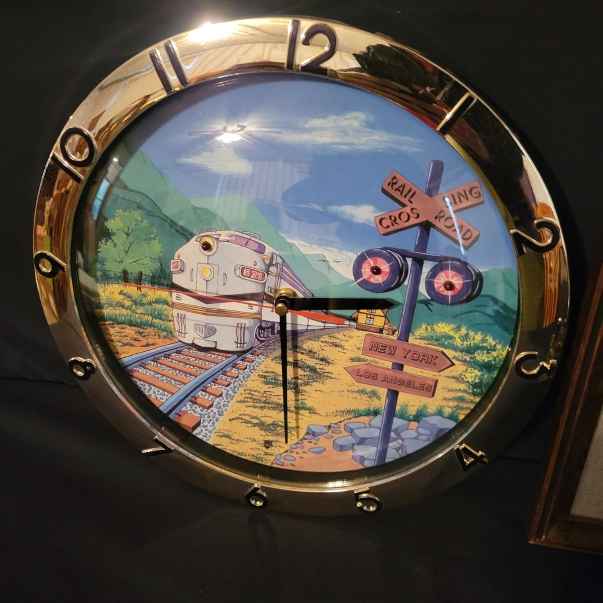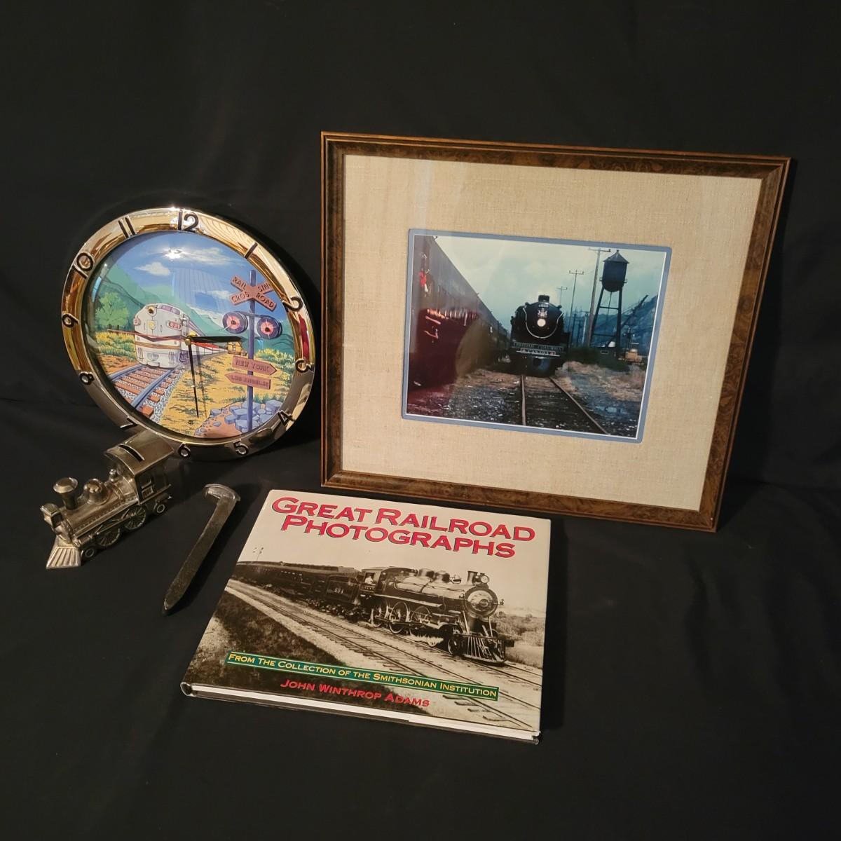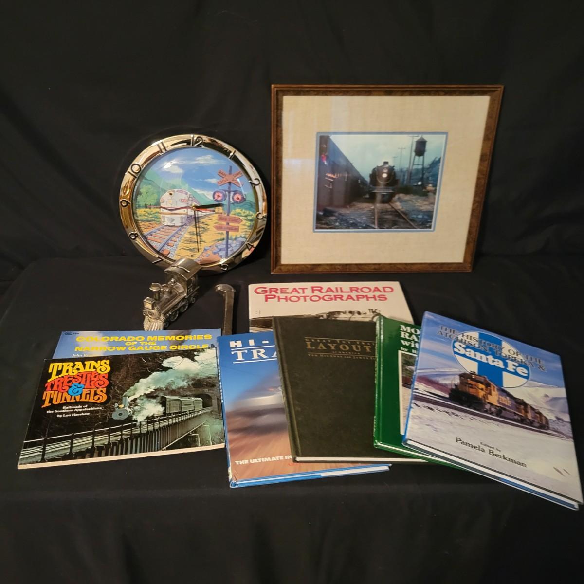 An assortment of train books and decor items. Included are seven books on a variety of train subjects, a steel rail spike, a metal locomotive bank, a train clock and a framed train print. The clock will need new batteries. The framed print has a double mat and wooden frame with a dark stain and measures approximately 17" x 15"H. Shipping available. Shipping can be costly. We suggest contacting our preferred local shipping provider, Postage Express, with dimensions and getting an estimate before bidding: (828) 670-5501 or postageexpress@yahoo.com.