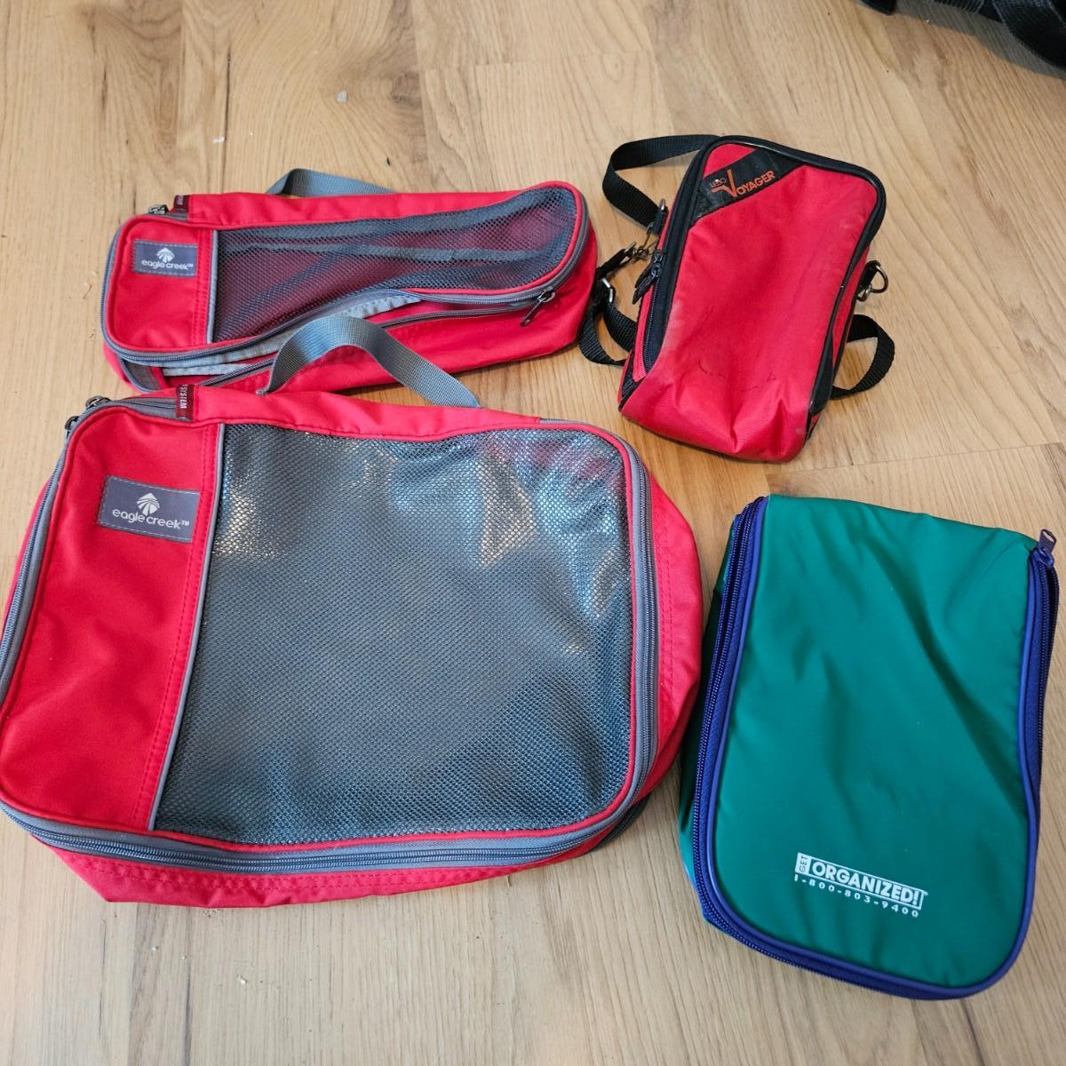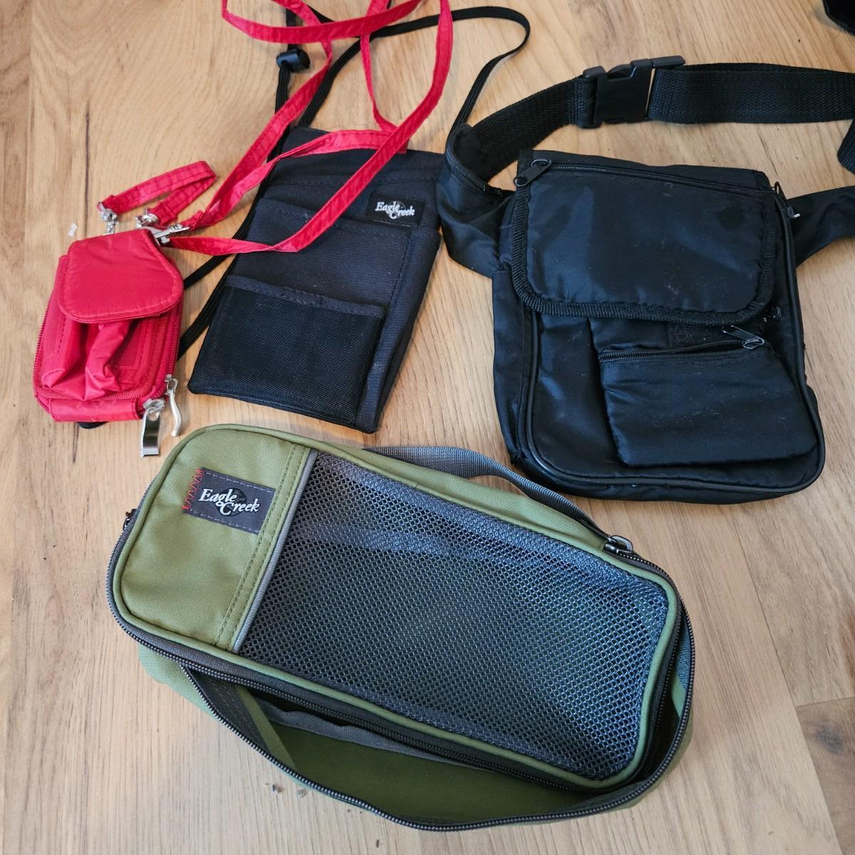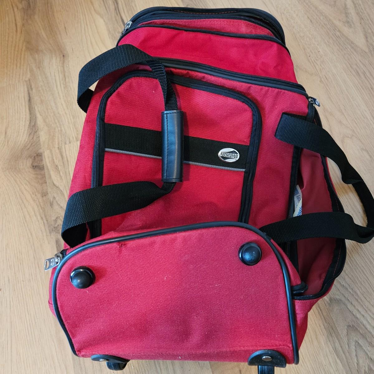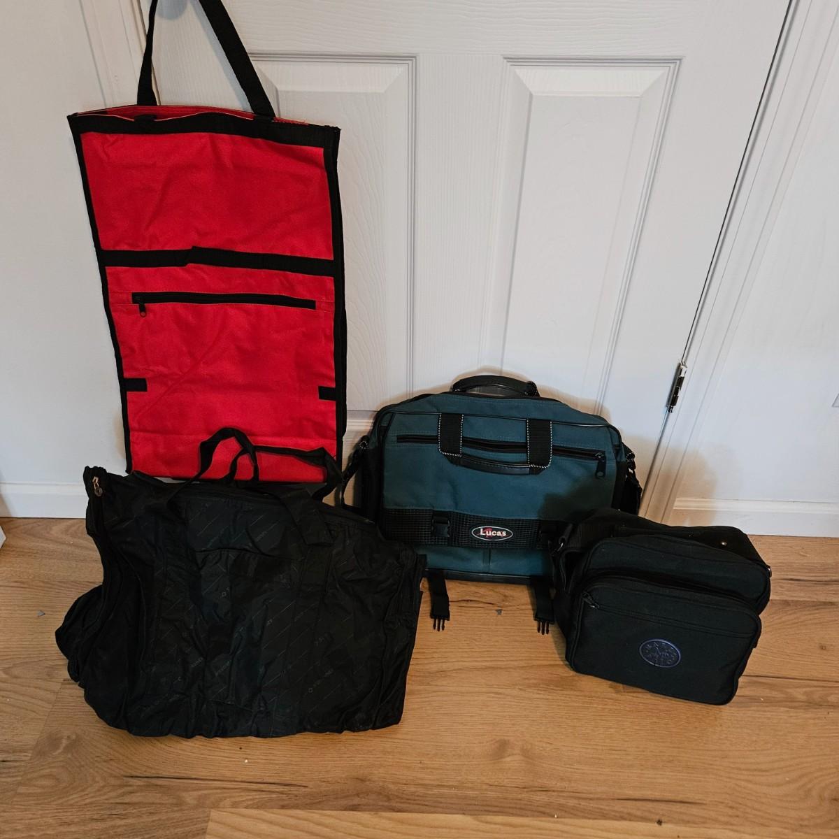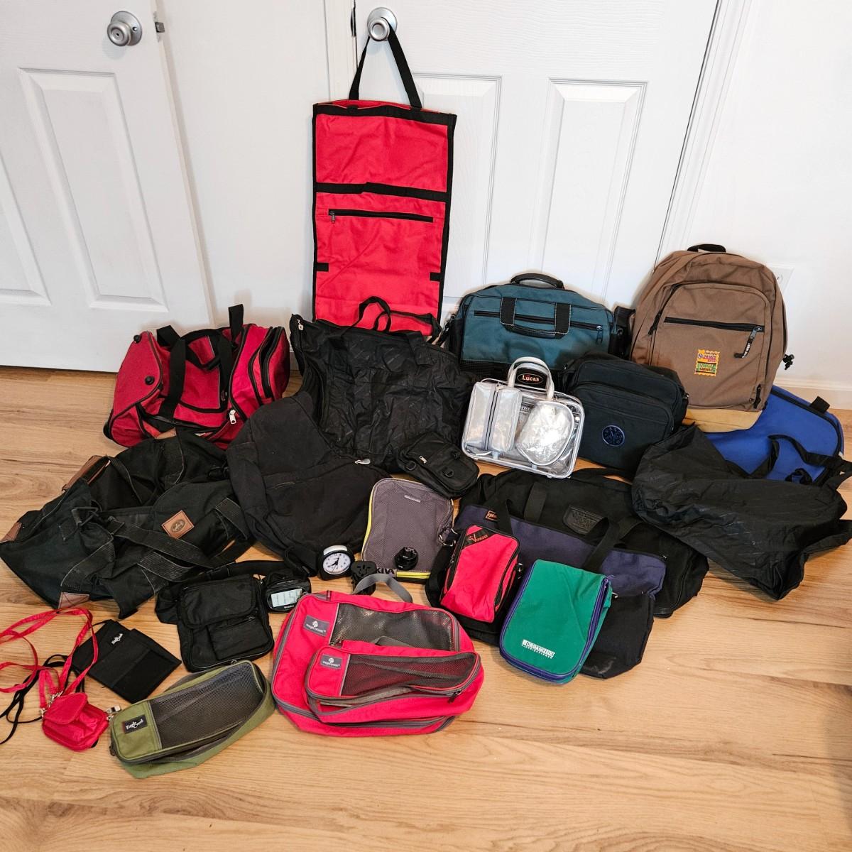 A large assortment of travel bags and accessories that includes travel clocks and outlets, and travel bags. Manufacturers include Samsonite, Marco Polo, American Tourister, and many more. Bag sizes range from small accessory bags to gym bags. Local pickup only