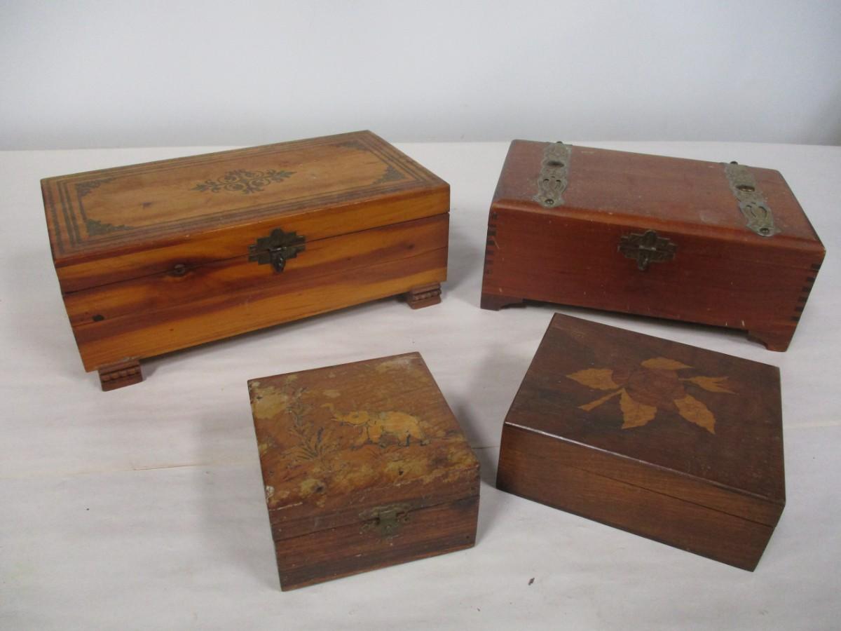 Assortment of Wood Trinket Boxes Some Inlay or Hand Painted Designs