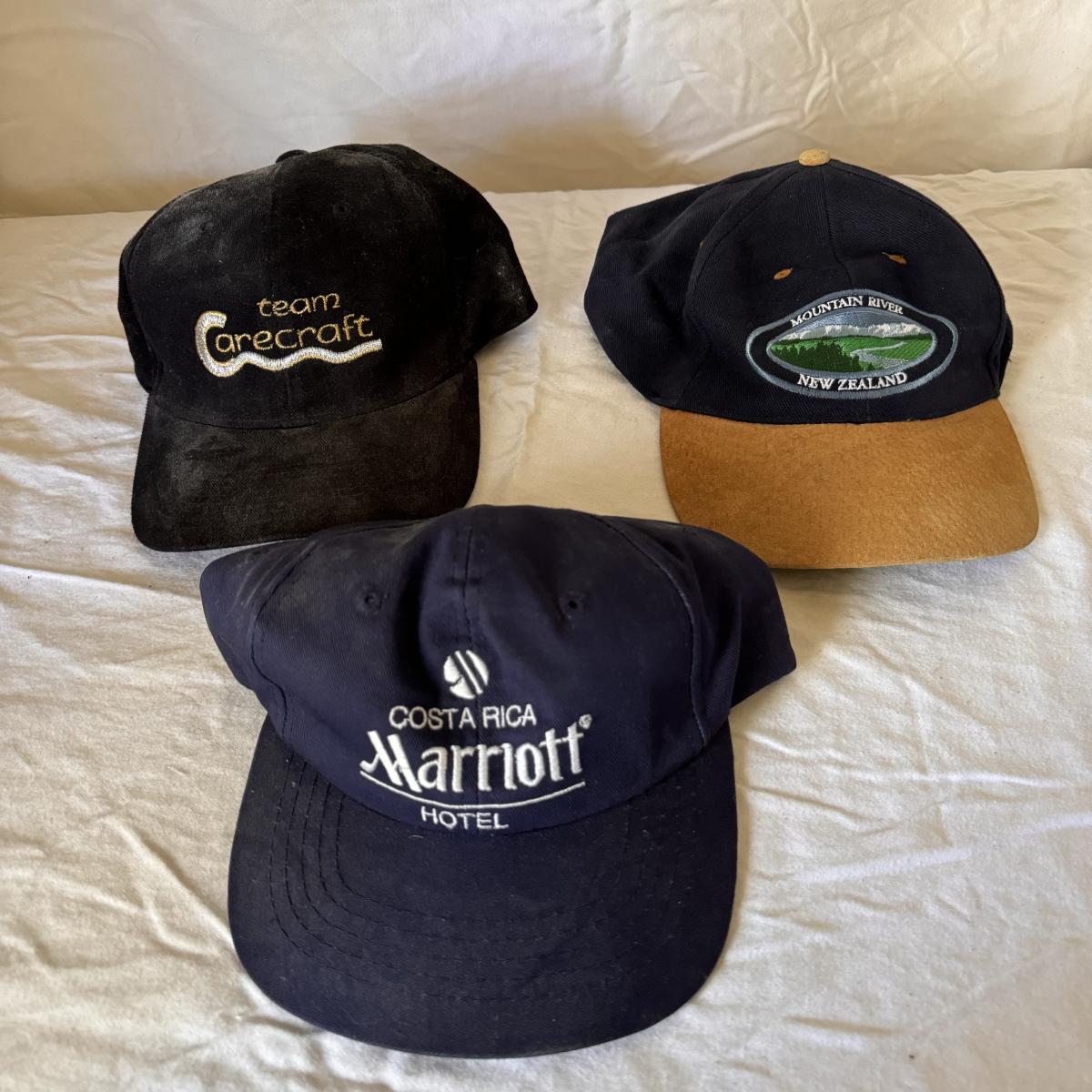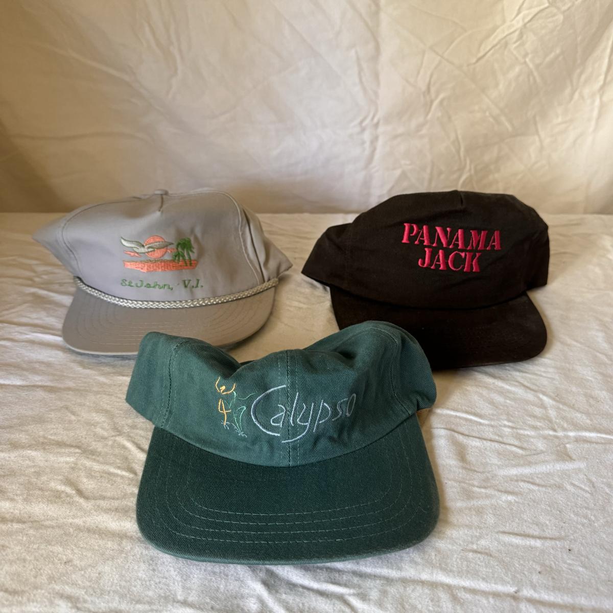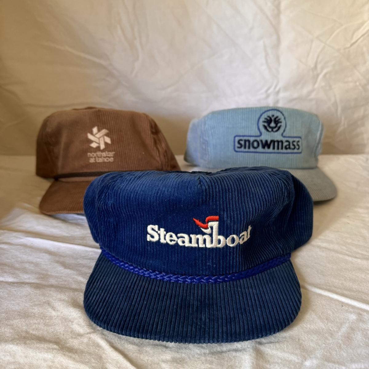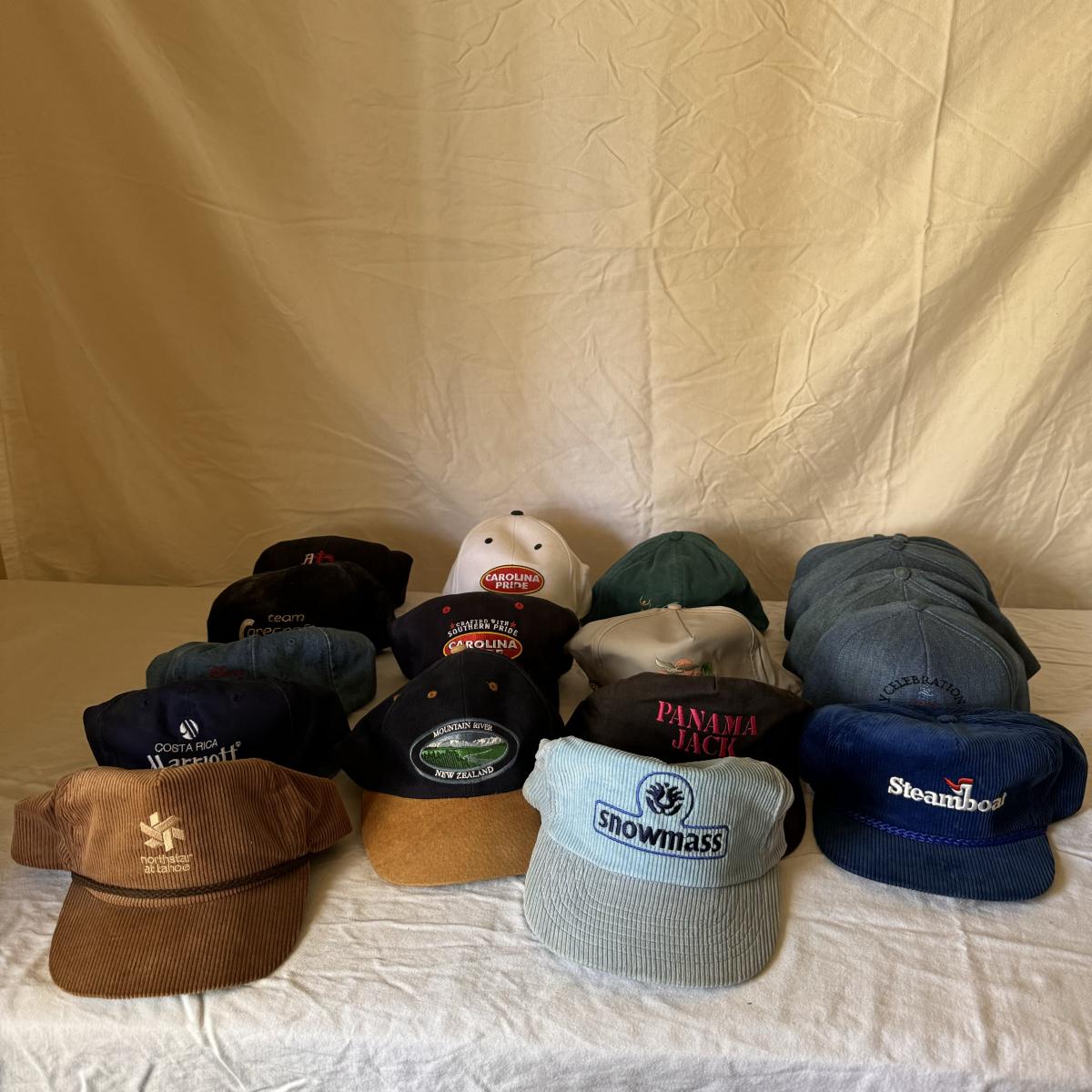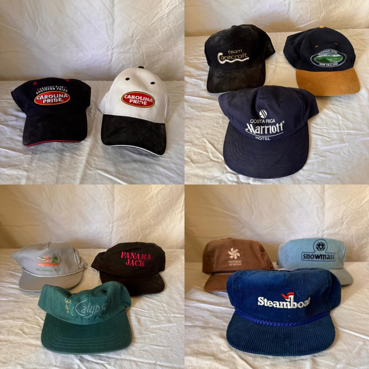 Lot includes seventeen trucker hats in various designs. You’ll find three corduroy hats that read Steamboat, Snowmass, and Northstar at Tahoe, one Calypso hat, one Panama Jack hat, one Marriot hat, two Carolina Pride hats, six hats that read Celebration of a Century, and more. One of the Carolina Pride hats has a stain on the front - see picture included. Hats are adjustable, one size fits all. Shipping available.