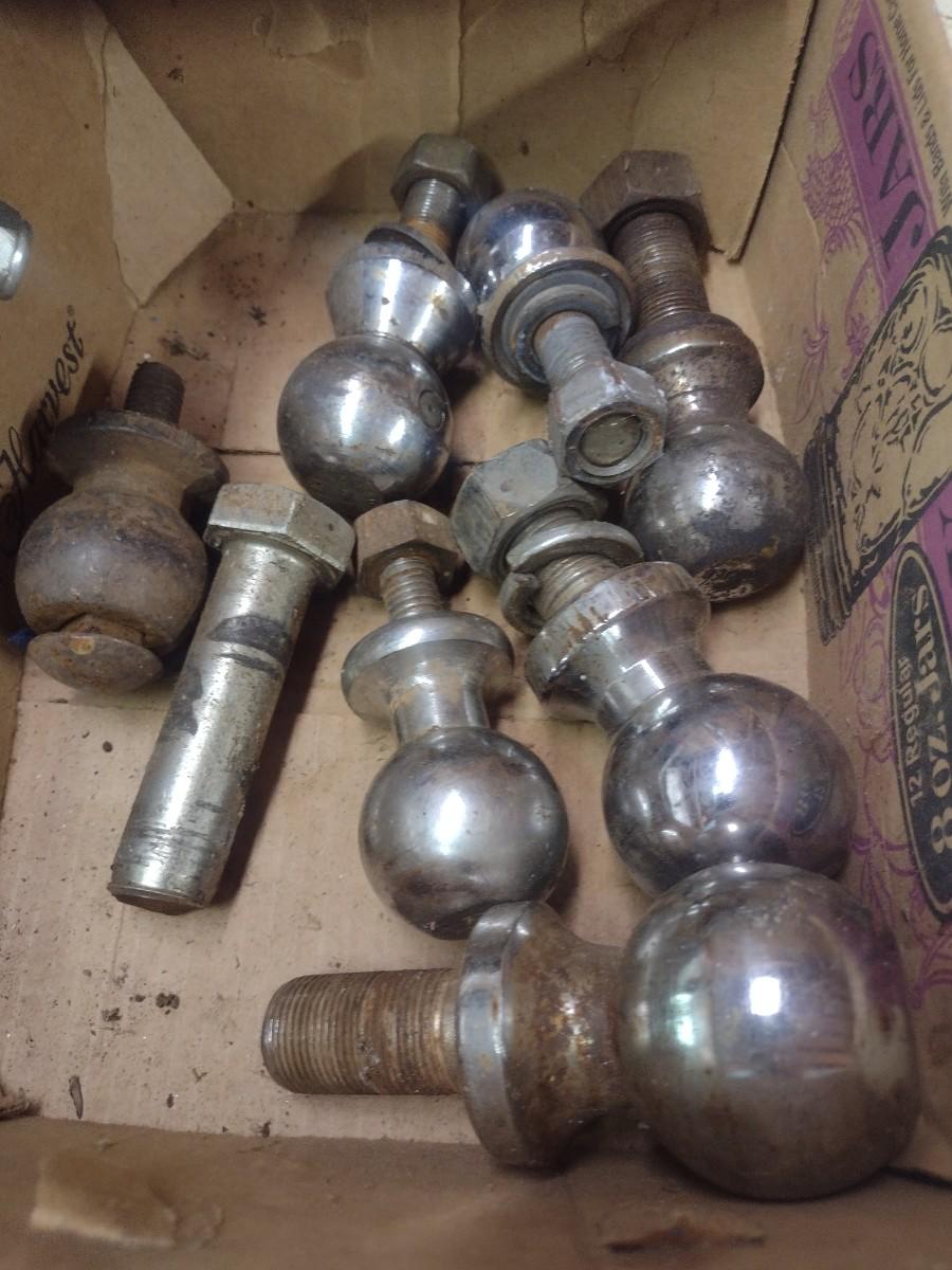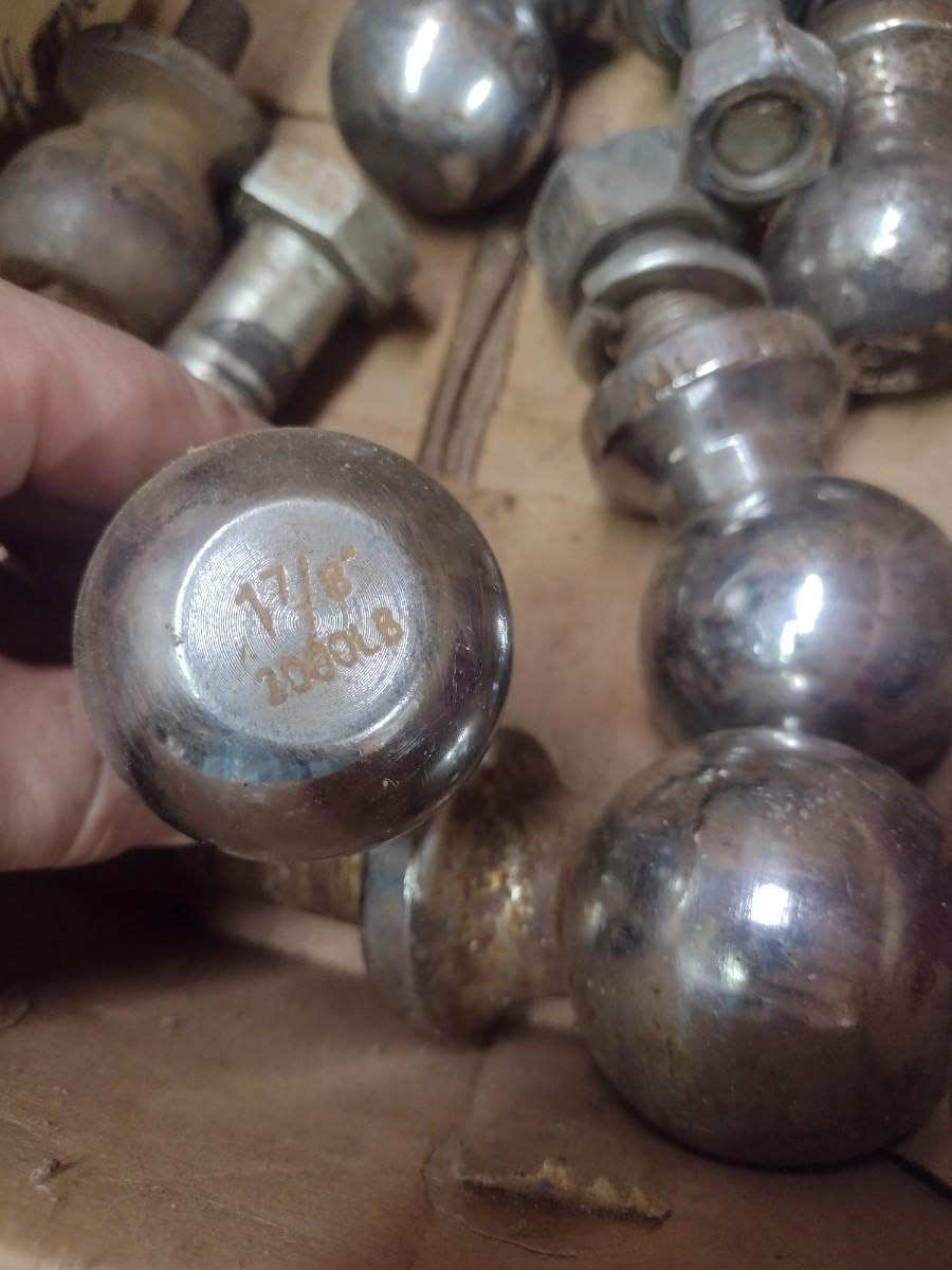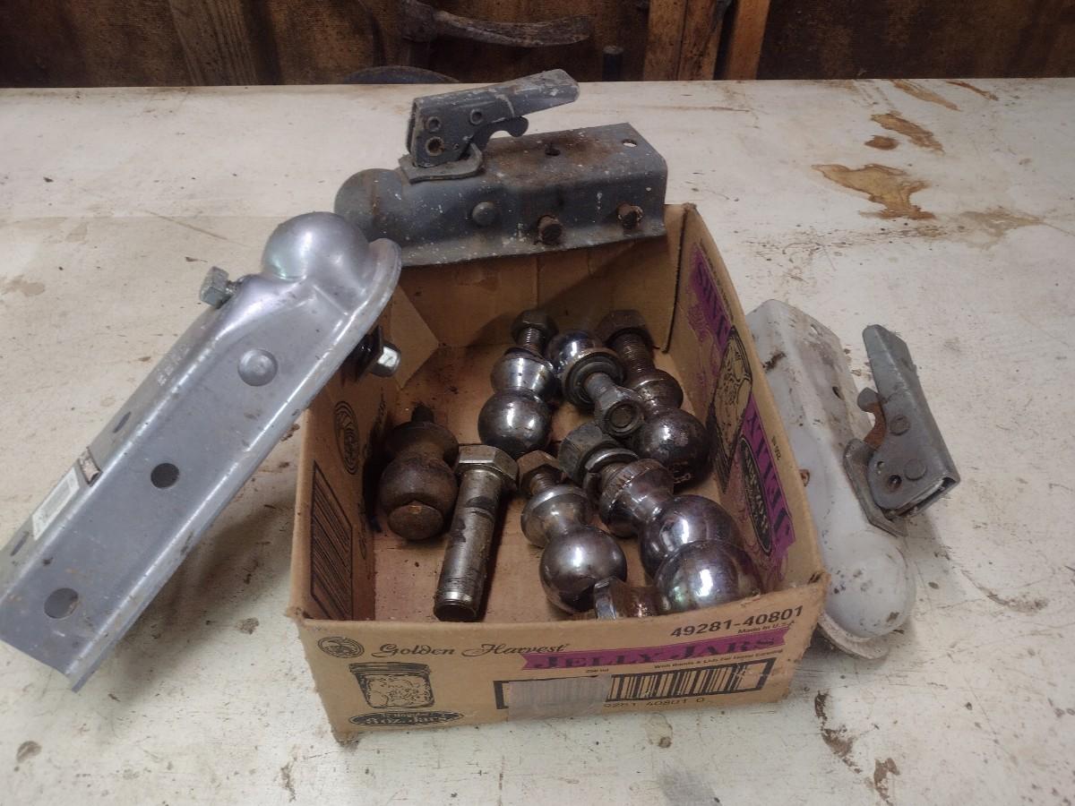 Assortment of Various Sized Trailer Ball Hitches and Hitch Attachments
