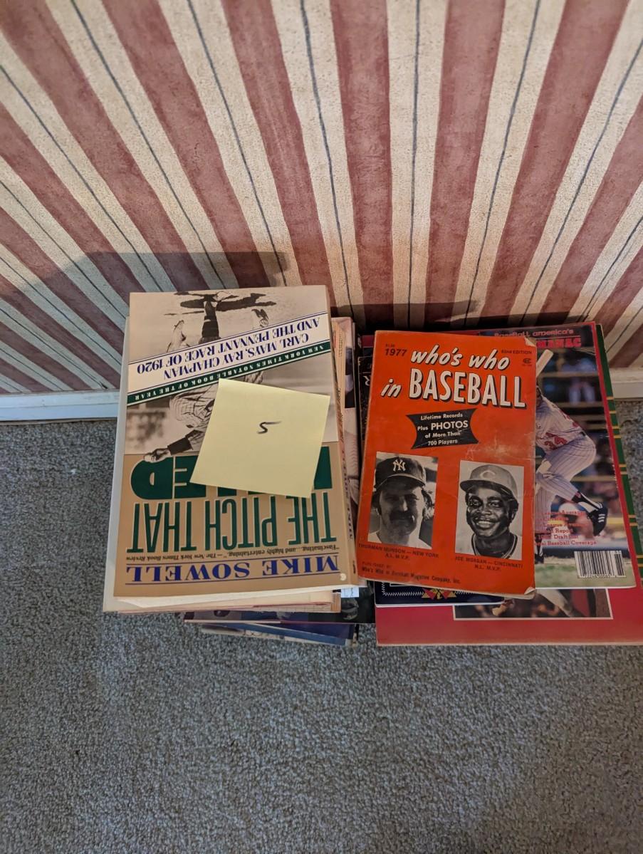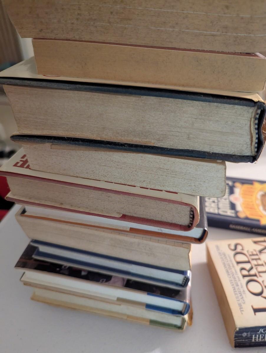 Books have been stored down stairs and have foxing - - Books are down stairs there is a sliding door to go out at the back of the house and go up some stairs to the driveway