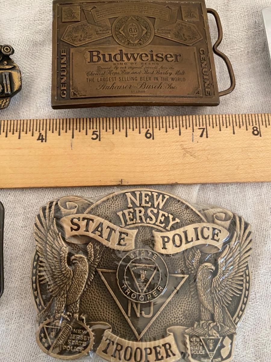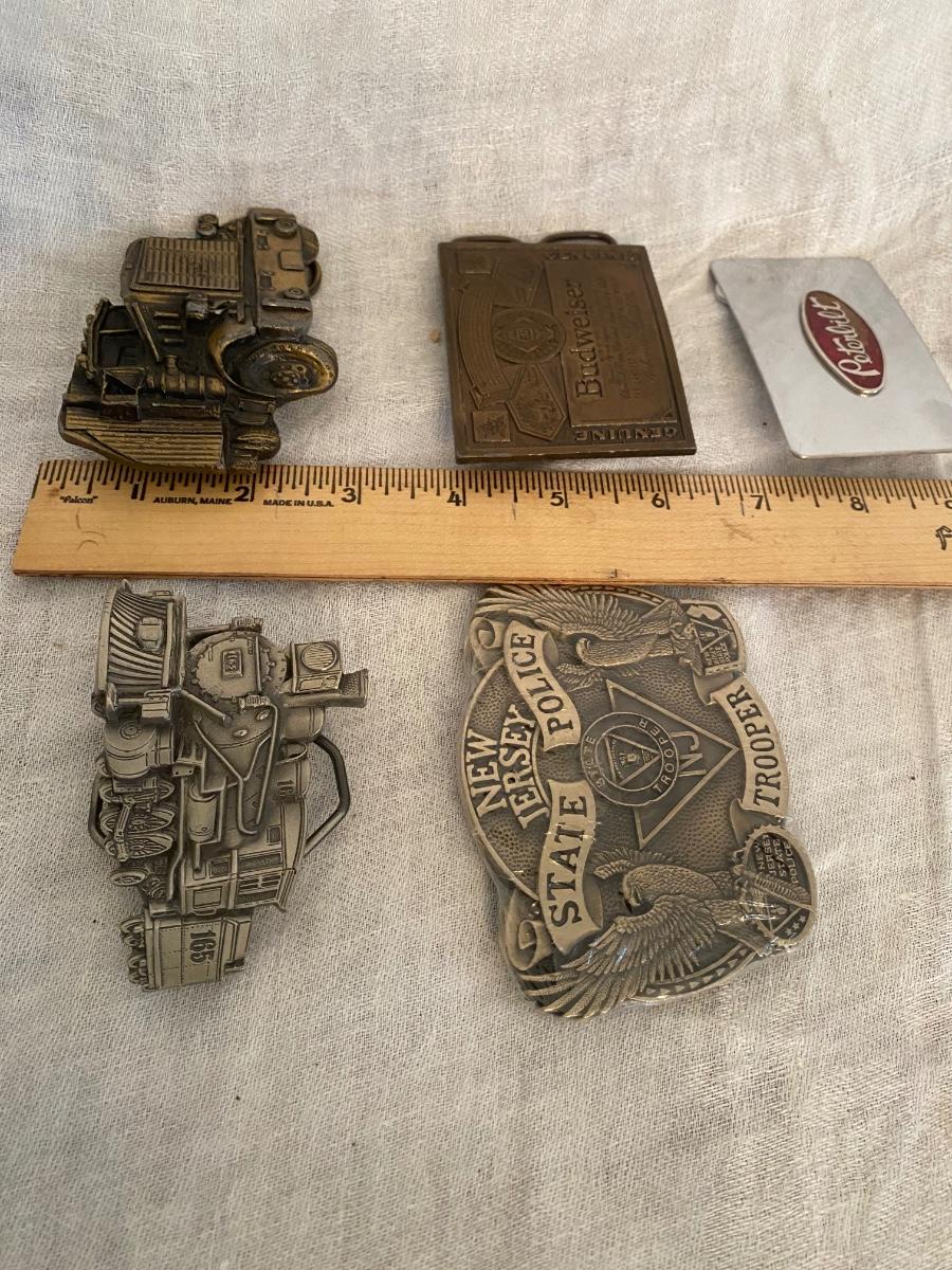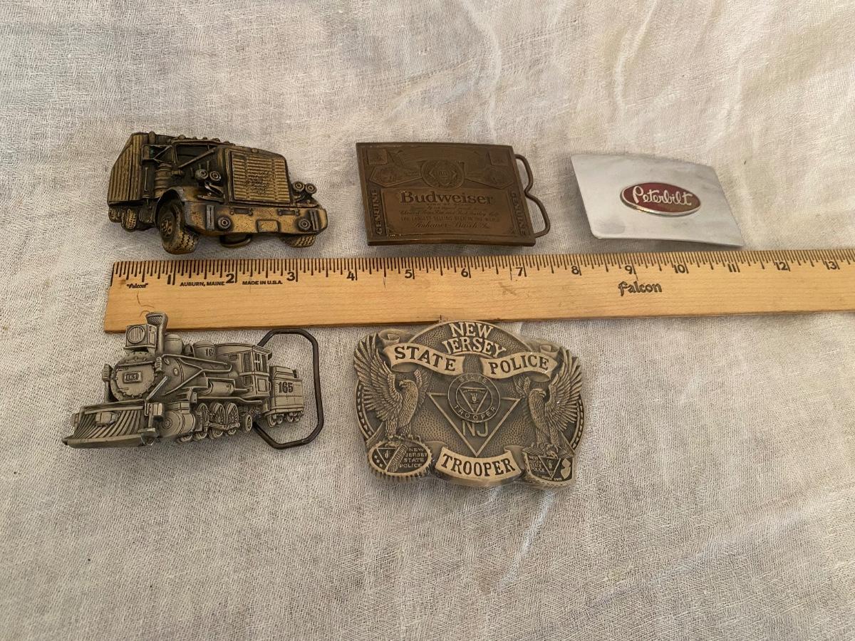 5 different vintage belt buckles. Budweiser A-168, Sealed NJ State Trooper, Peterbilt, Truck and train. Covers many different interests!
