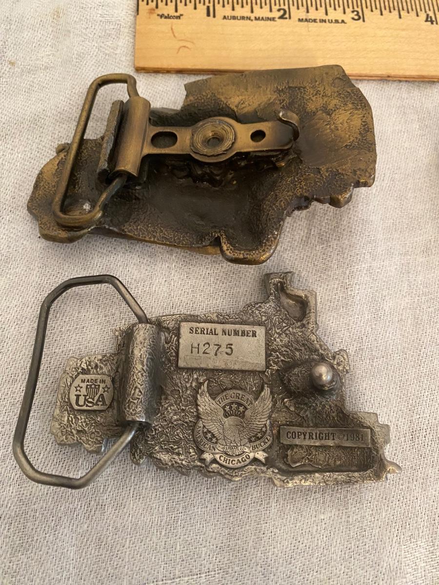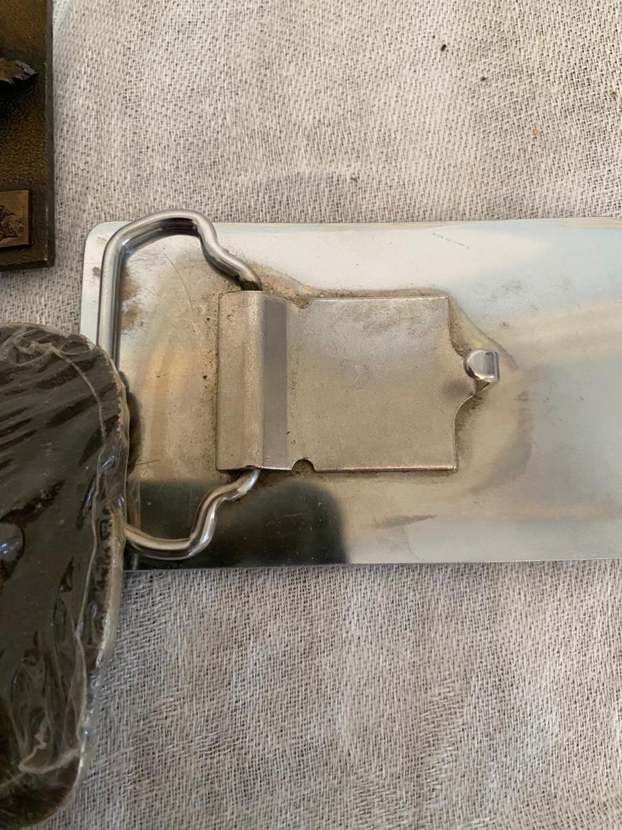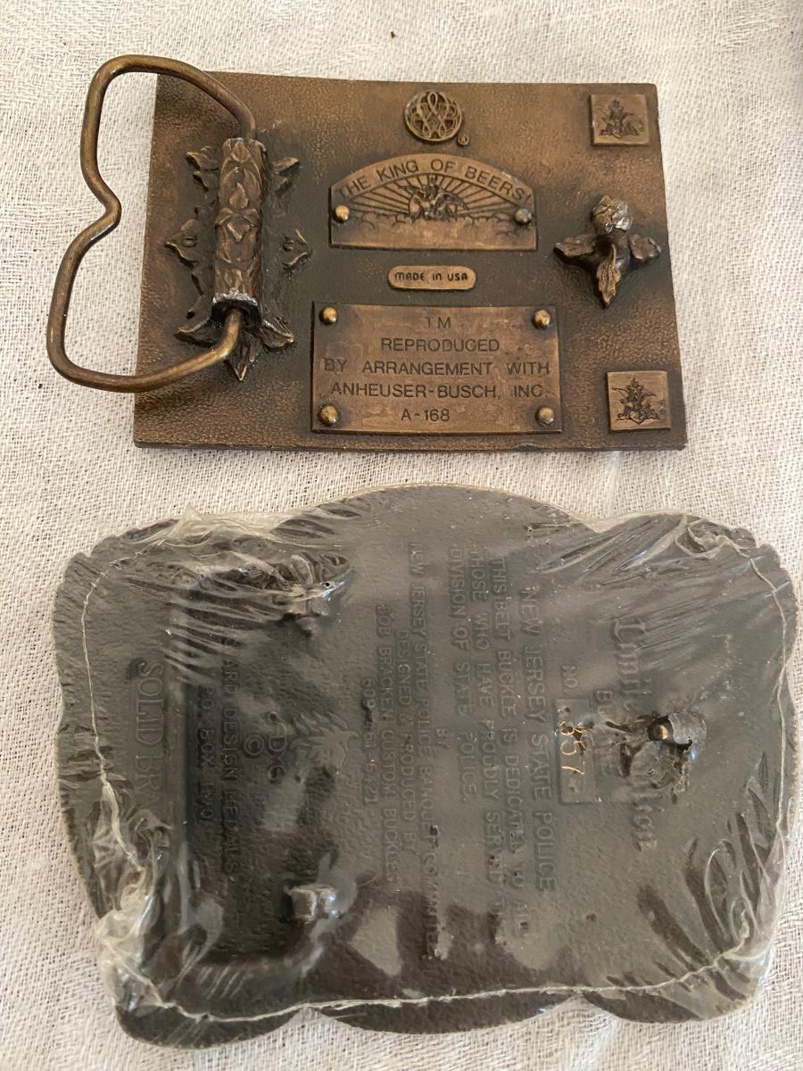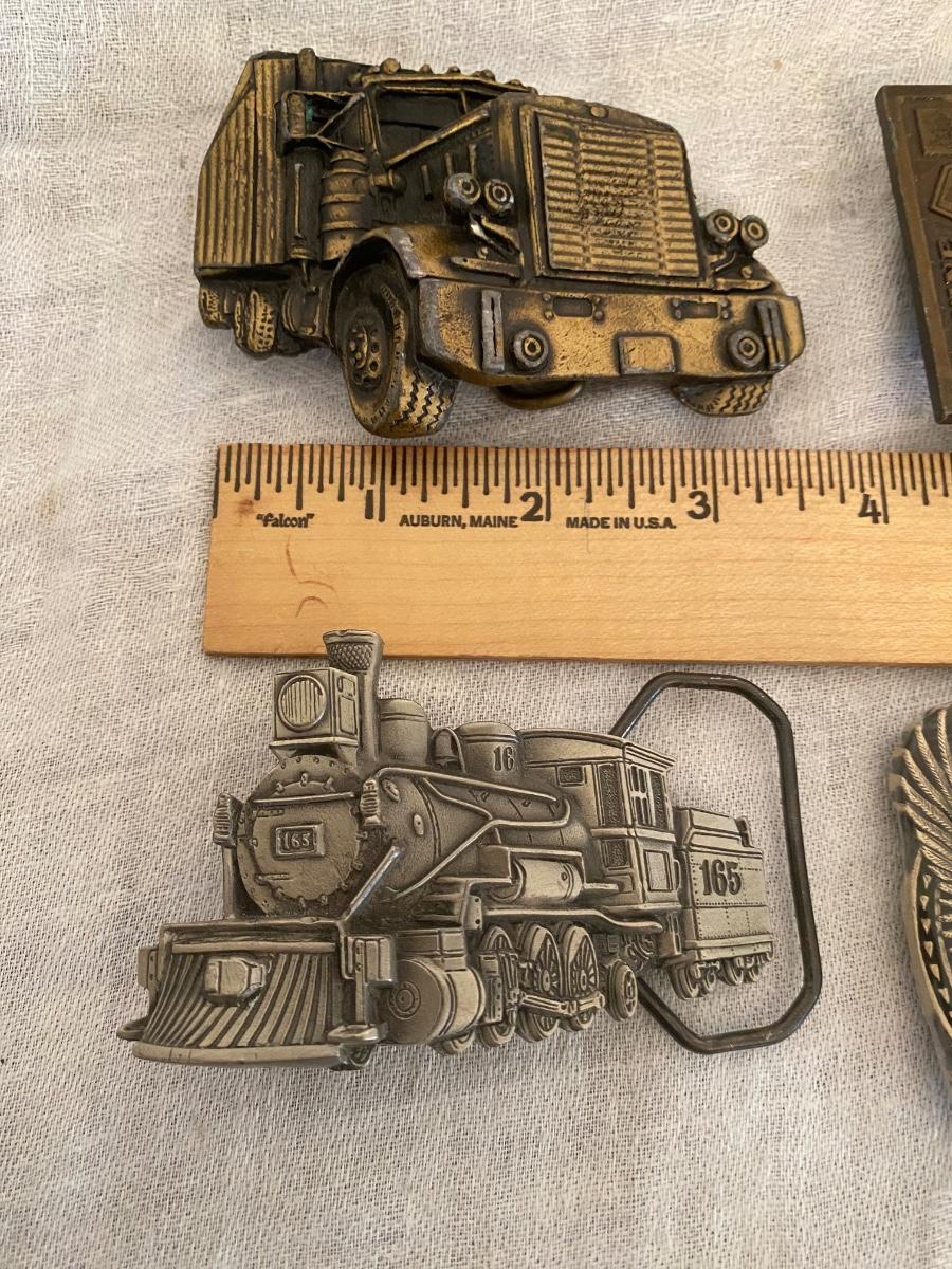 5 different vintage belt buckles. Budweiser A-168, Sealed NJ State Trooper, Peterbilt, Truck and train. Covers many different interests!
