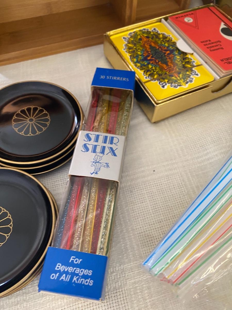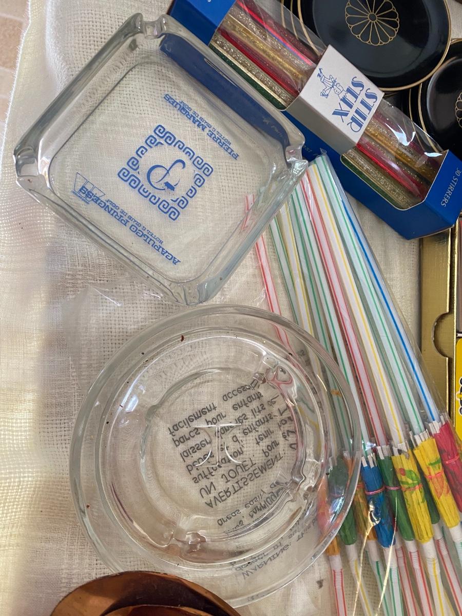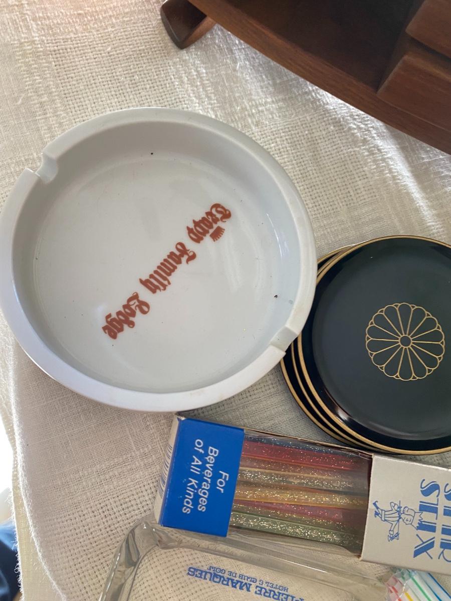 Includes Vintage Club, ice buckets, coasters, vintage ashtrays, playing cards anymore. In kitchen in big box under island.