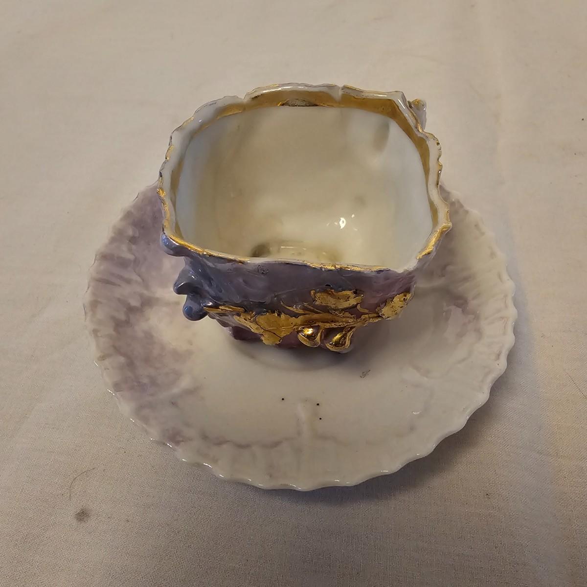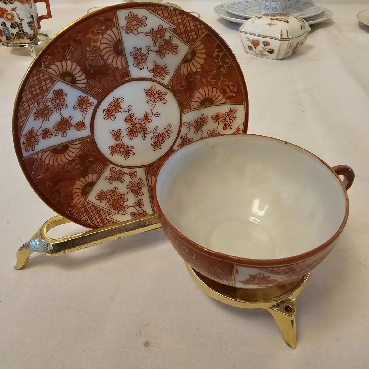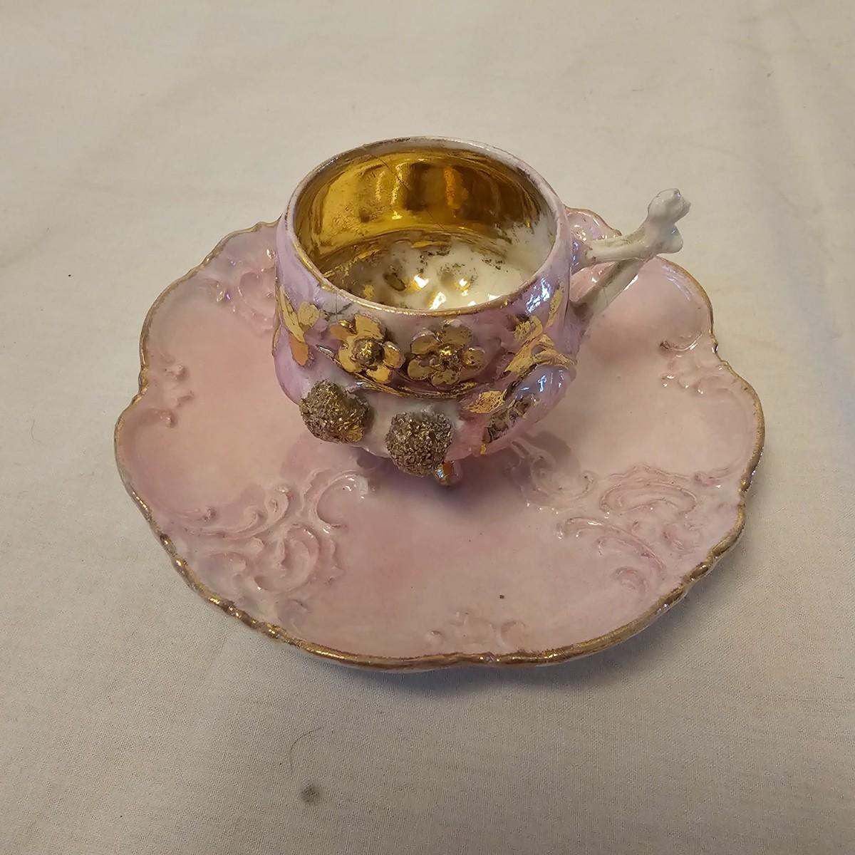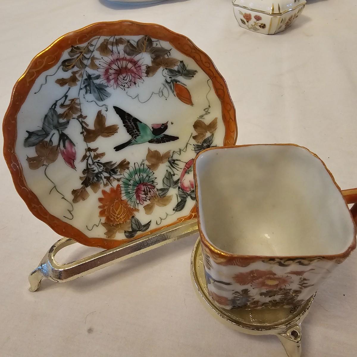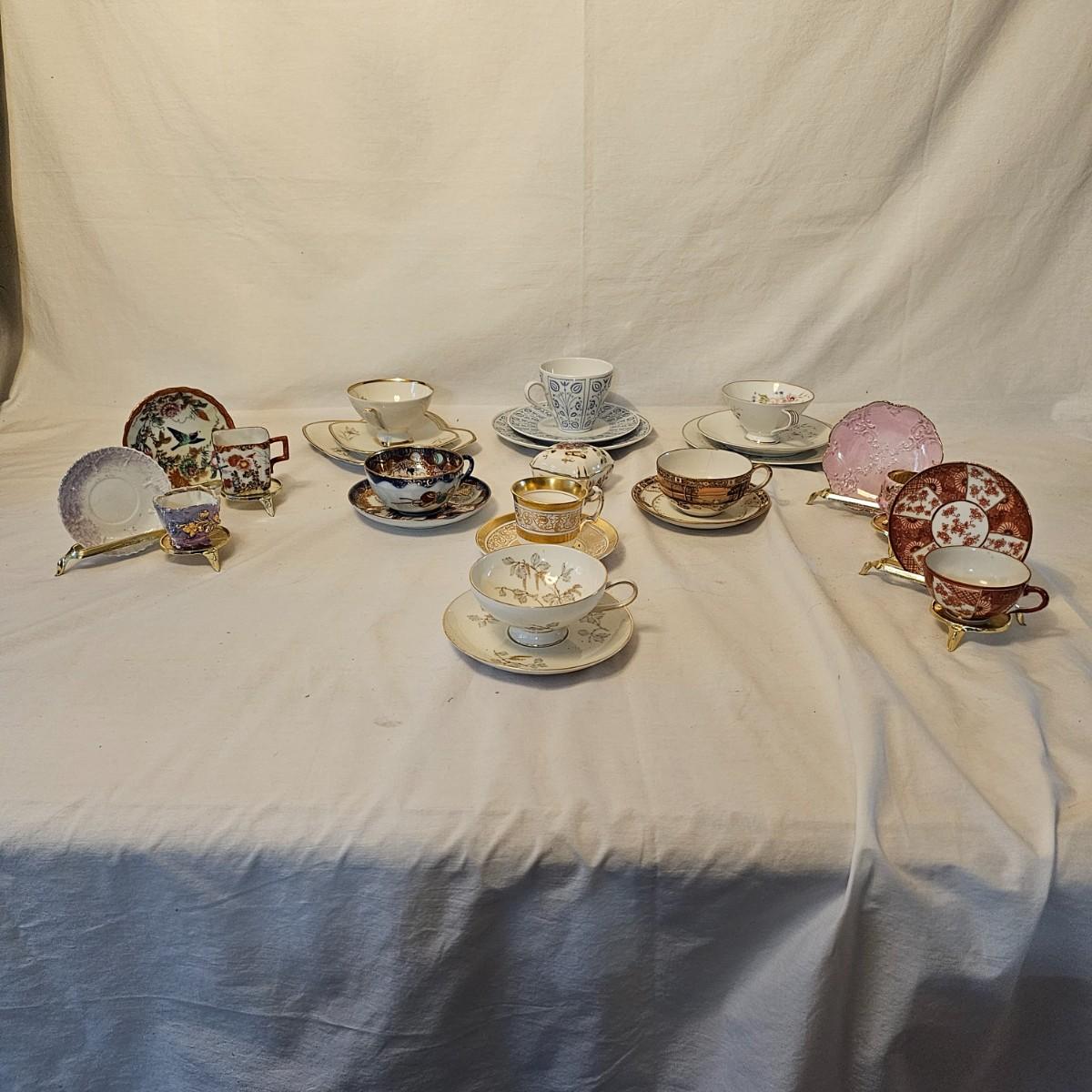 Eleven delightful combos of cup & saucers. Most items hand painted, many from Bavaria and England. Saucer diameters range from 3.5" to 7.5". Small petite cups and handles in numerous patterns and colors. Some slight cracks and other blemishes visible upon close look. Also includes four display stands for cups and saucers. See photos for details. Shipping available.
