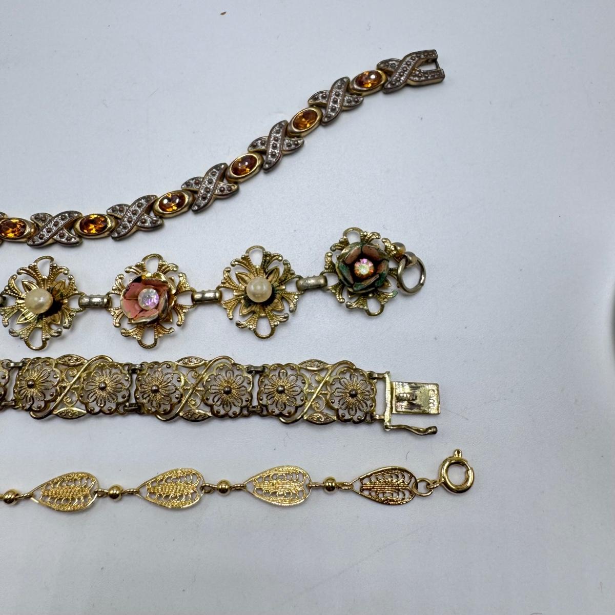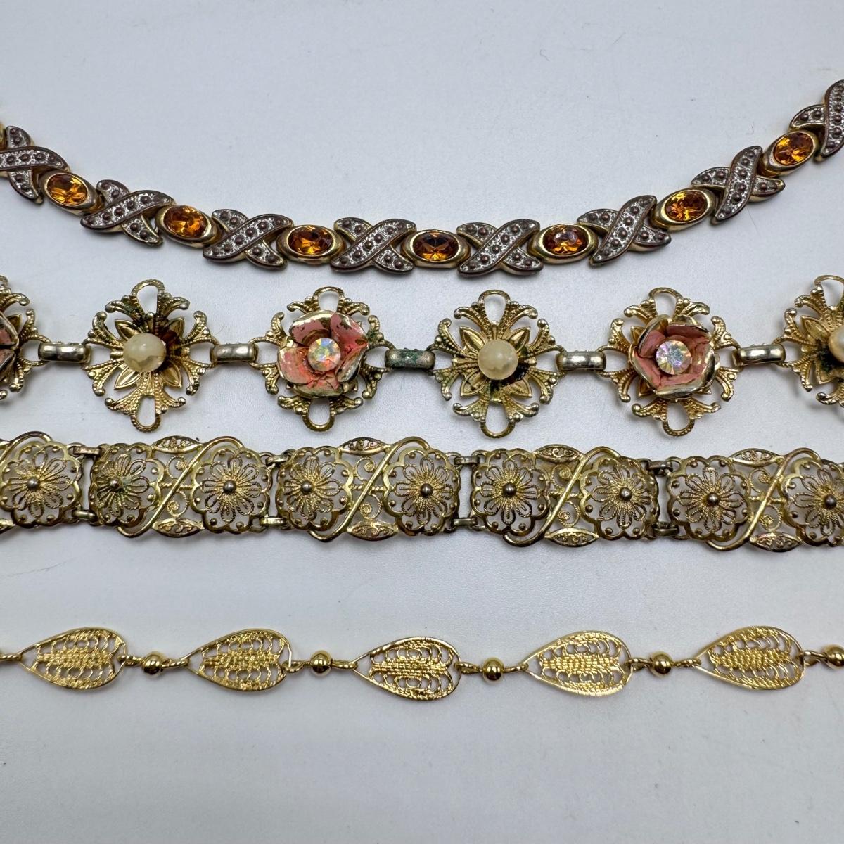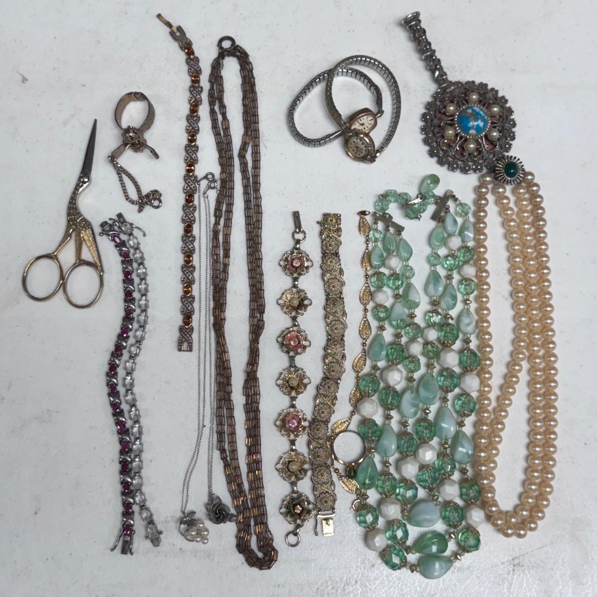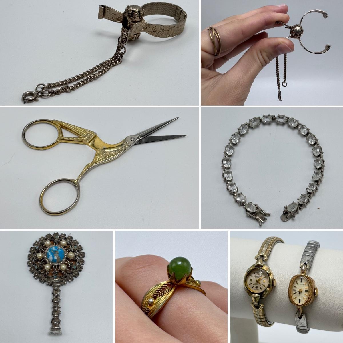This lot includes five necklaces, two stretchy watches from Stratford and Timex, vintage glove clip for purse, one ring, and more. You’ll also find two bracelets marked sterling “925”, four additional bracelets, stork embroidery scissors engraved with “Victoria,” and a pocket purse mirror. The longest necklace is the one resembling chain links - it measures 50” long when unclasped. All sales are final. No returns or refunds. Please bid accordingly. Shipping available.