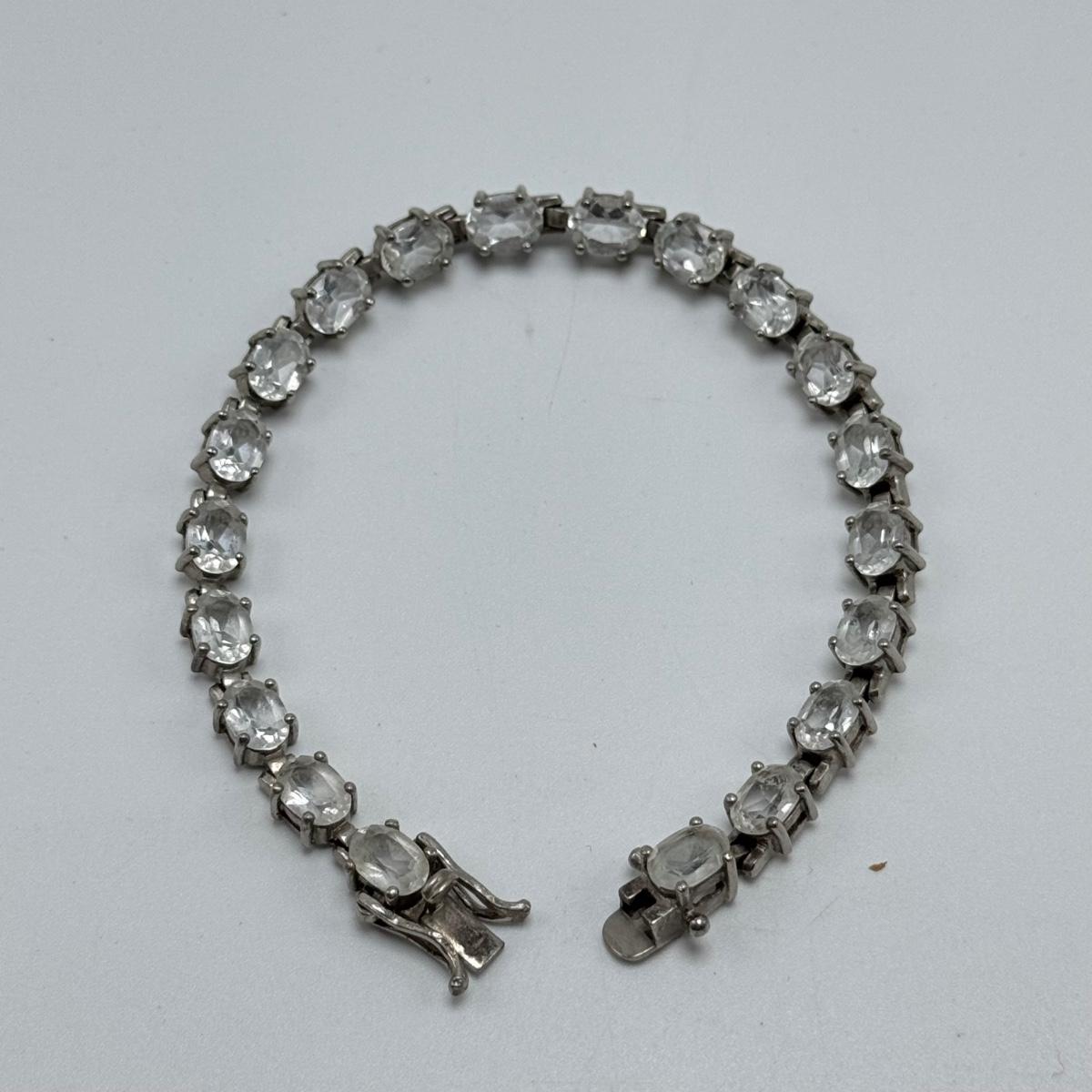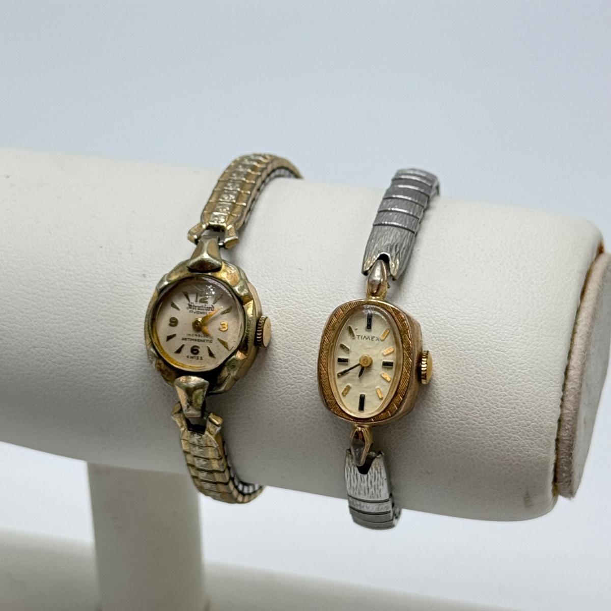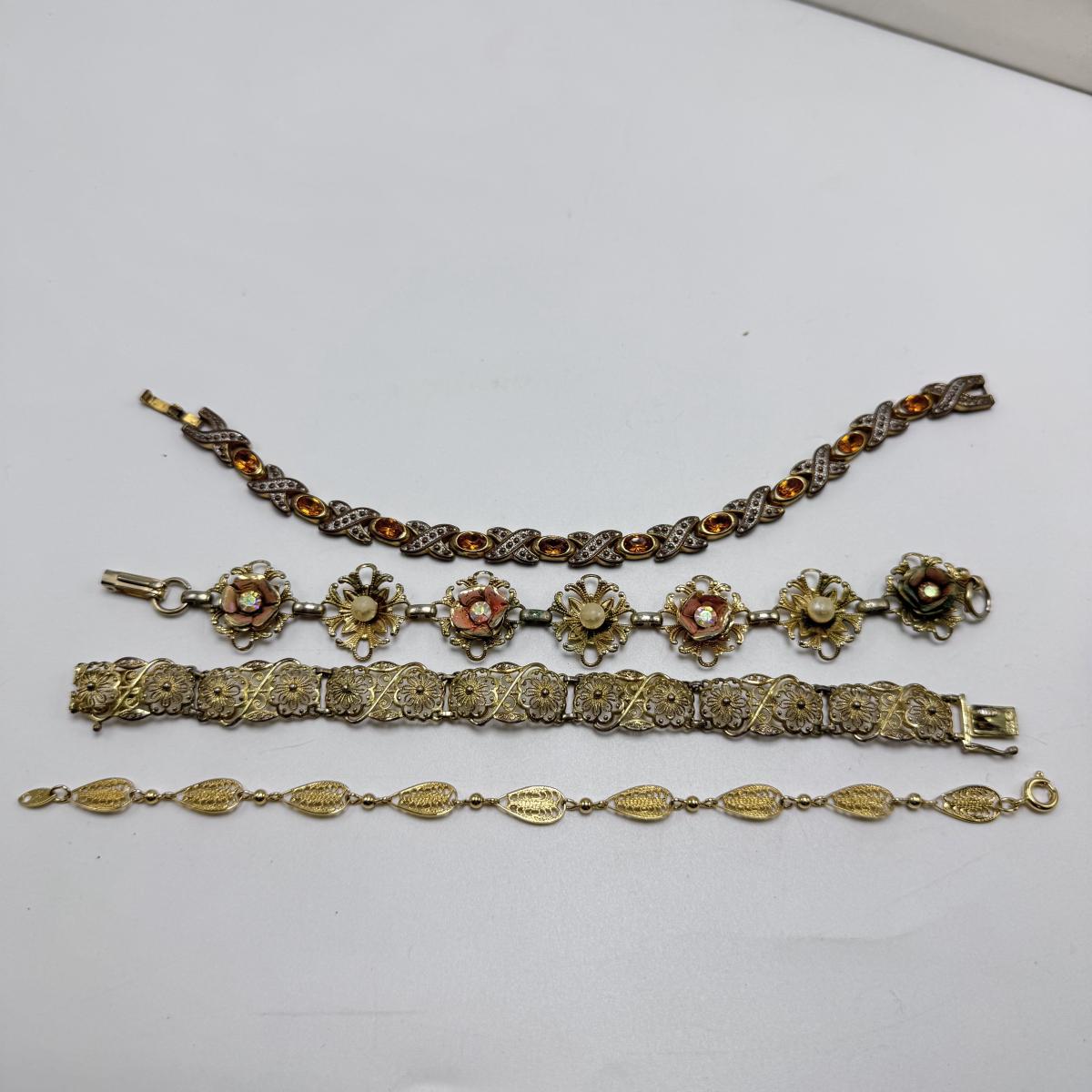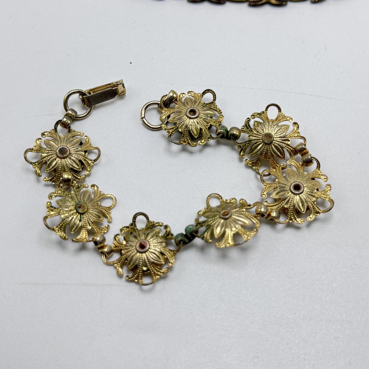 This lot includes five necklaces, two stretchy watches from Stratford and Timex, vintage glove clip for purse, one ring, and more. You’ll also find two bracelets marked sterling “925”, four additional bracelets, stork embroidery scissors engraved with “Victoria,” and a pocket purse mirror. The longest necklace is the one resembling chain links - it measures 50” long when unclasped. All sales are final. No returns or refunds. Please bid accordingly. Shipping available.