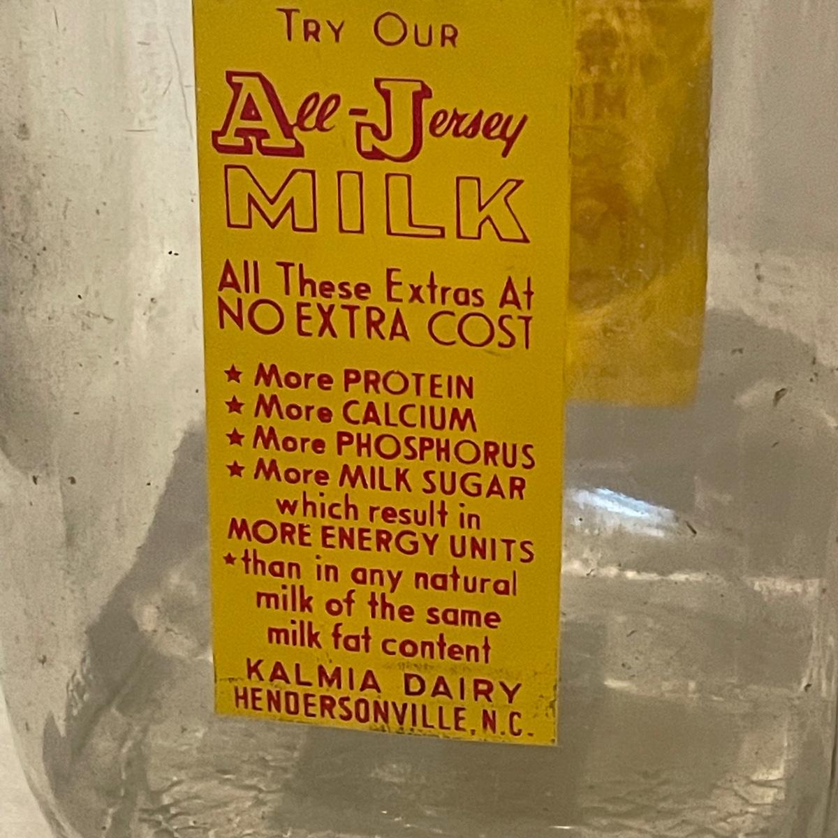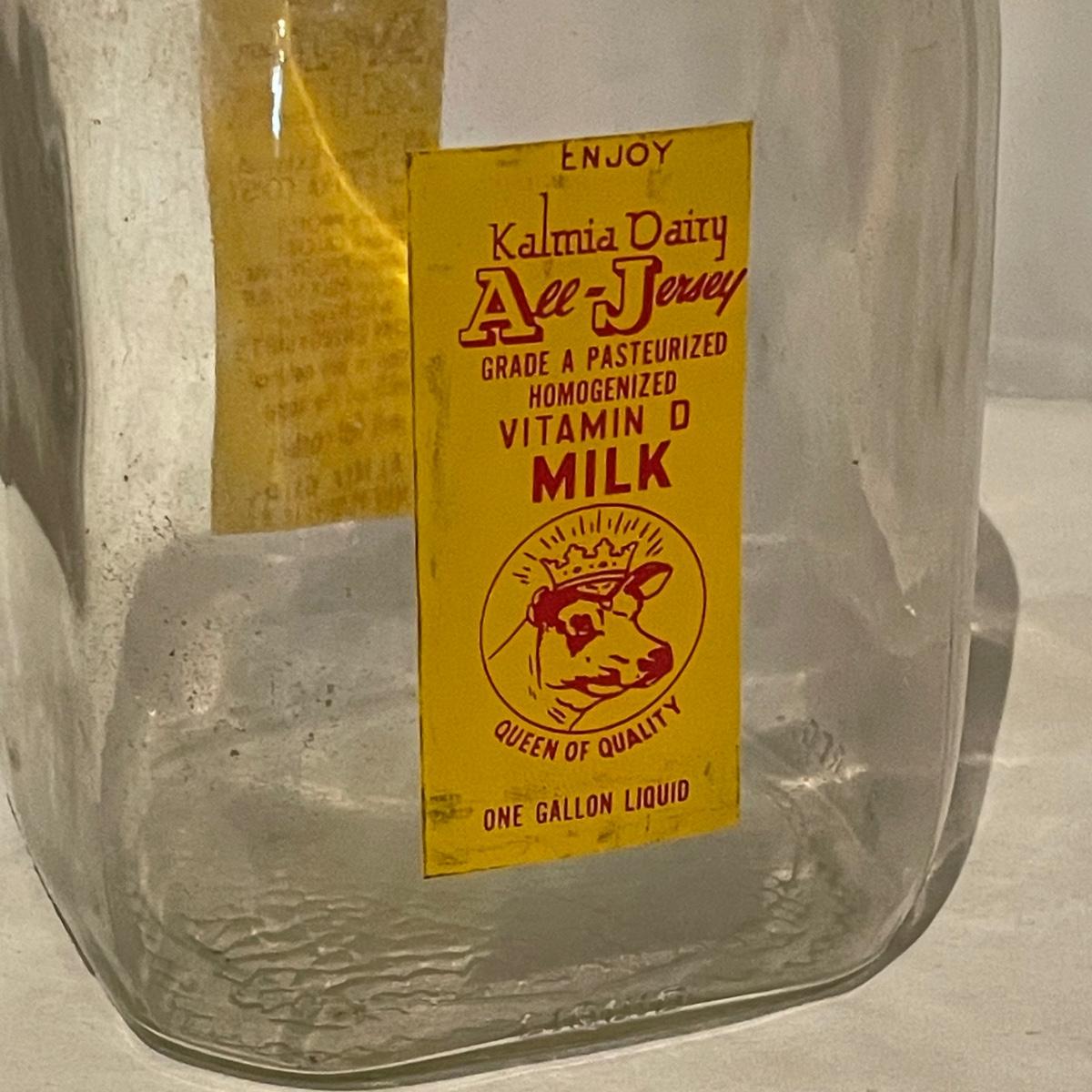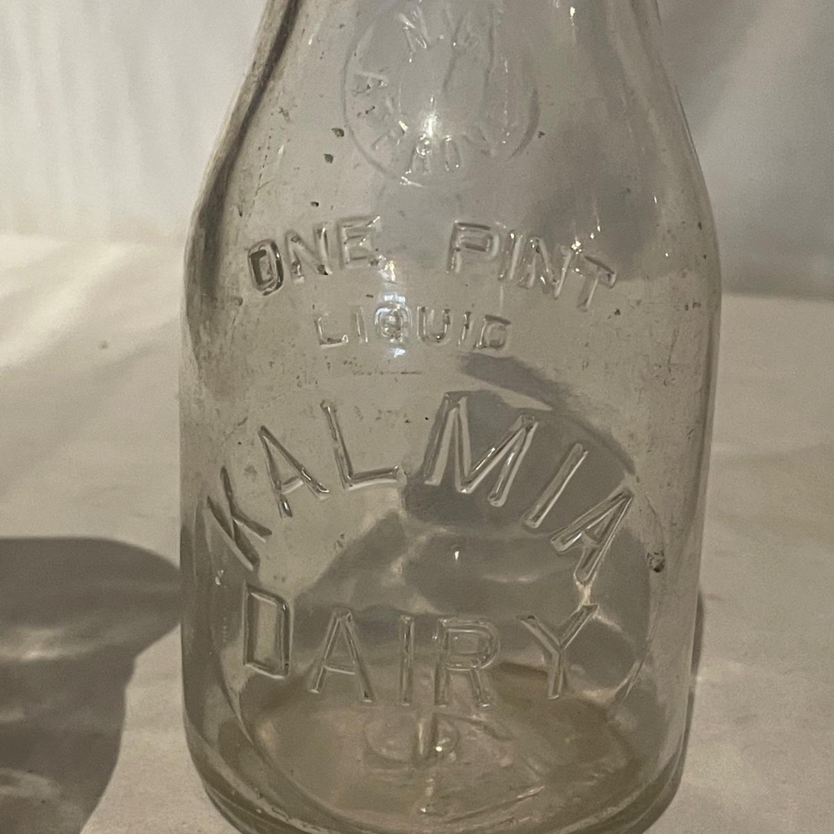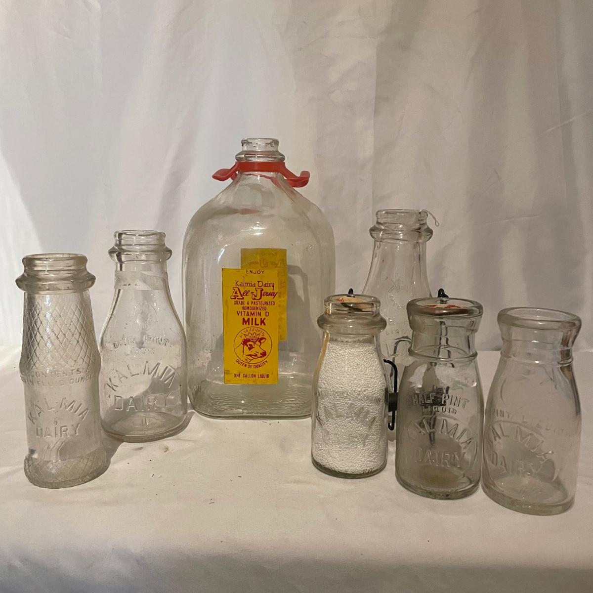 All these bottles were from local Kalmia Dairy that range in size from one gallon to half pint and also includes a more modern metal wire bottle holder.