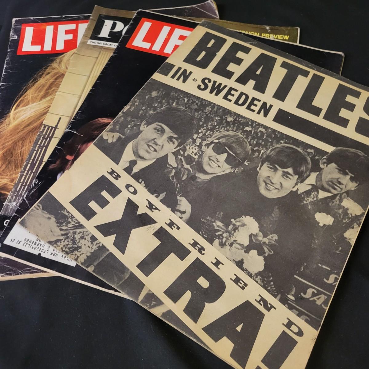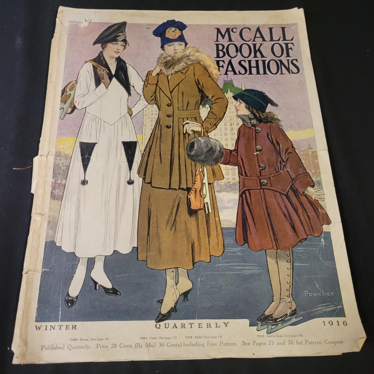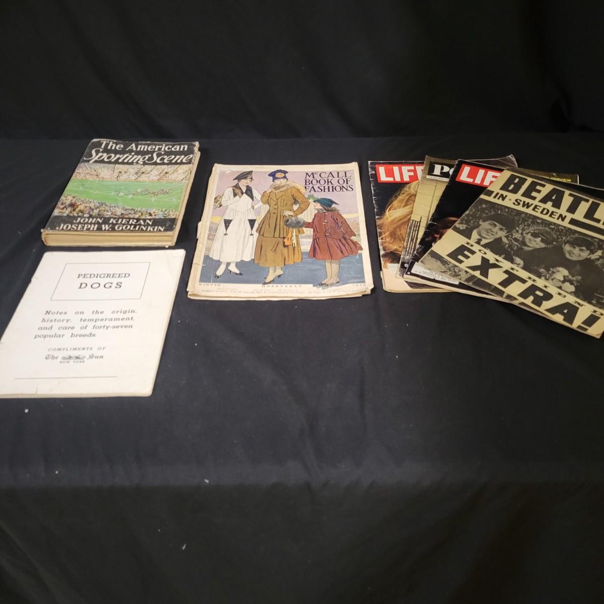An assortment of 6 vintage life magazines and more dating from the 60s and an antique McCall Book of Fashions from 1916. All are in good condition with some damage from use and age. Also included is a book on dog breeds and a book of The American Sporting Scene published in 1946. Shipping available
