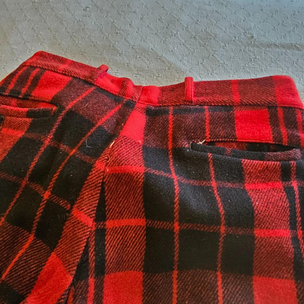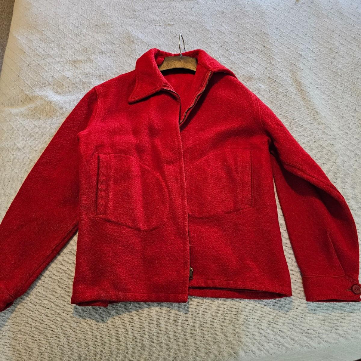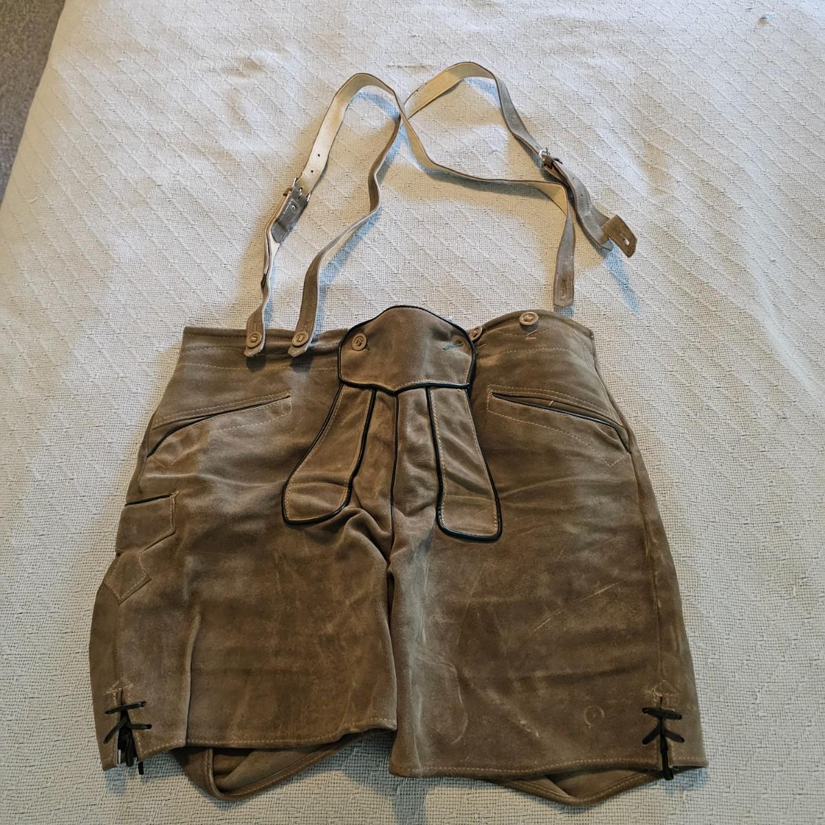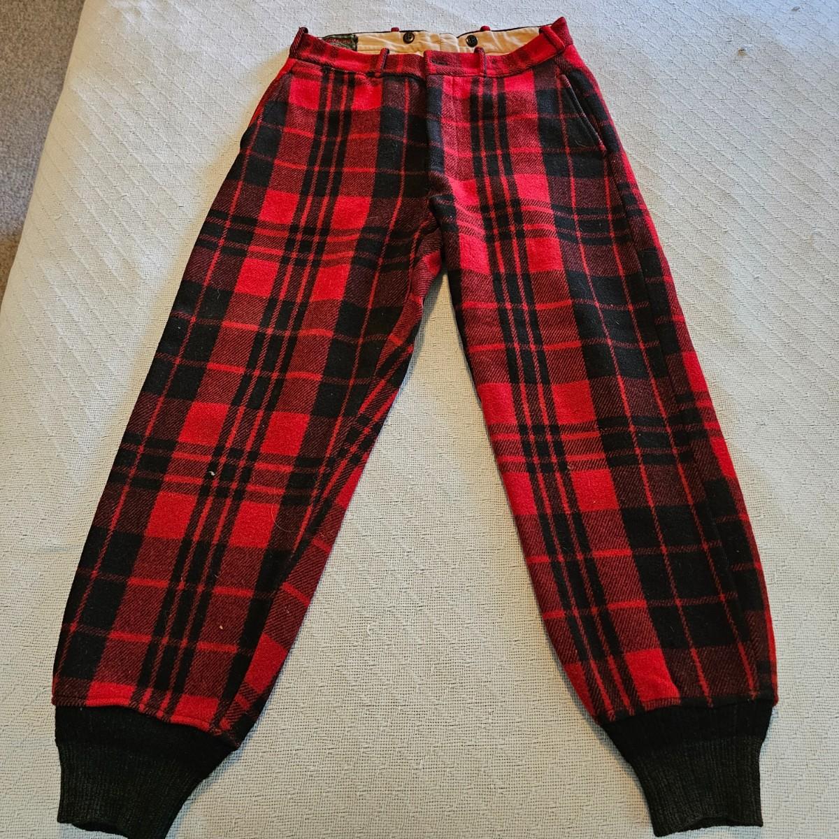 Awesome items for the cold weather and more. Two coats, a pair of wool ski pants and also a pair of leather lederhosen. Red coat is probably wool, has zip up front and pockets, Woodfield by Drybak. The black coat is from Argentina; it has a four-button front and satin piping at collar and cuffs. Enclosed tag indicates it is dyed broad tail processed lambskin. By S. Brody fine furs. Red checked pants are from Chippewa Woolen Mills in Wisconsin, have ribbed openings at legs and button up front with inside attachments for suspenders. Final item is a pair of genuine Austrian leather lederhosen with leather piping on pockets and placket button up front. Cones with suspenders. No sizes were marked on items, but jackets appear to be size Medium. See photos for details. Local pickup only.