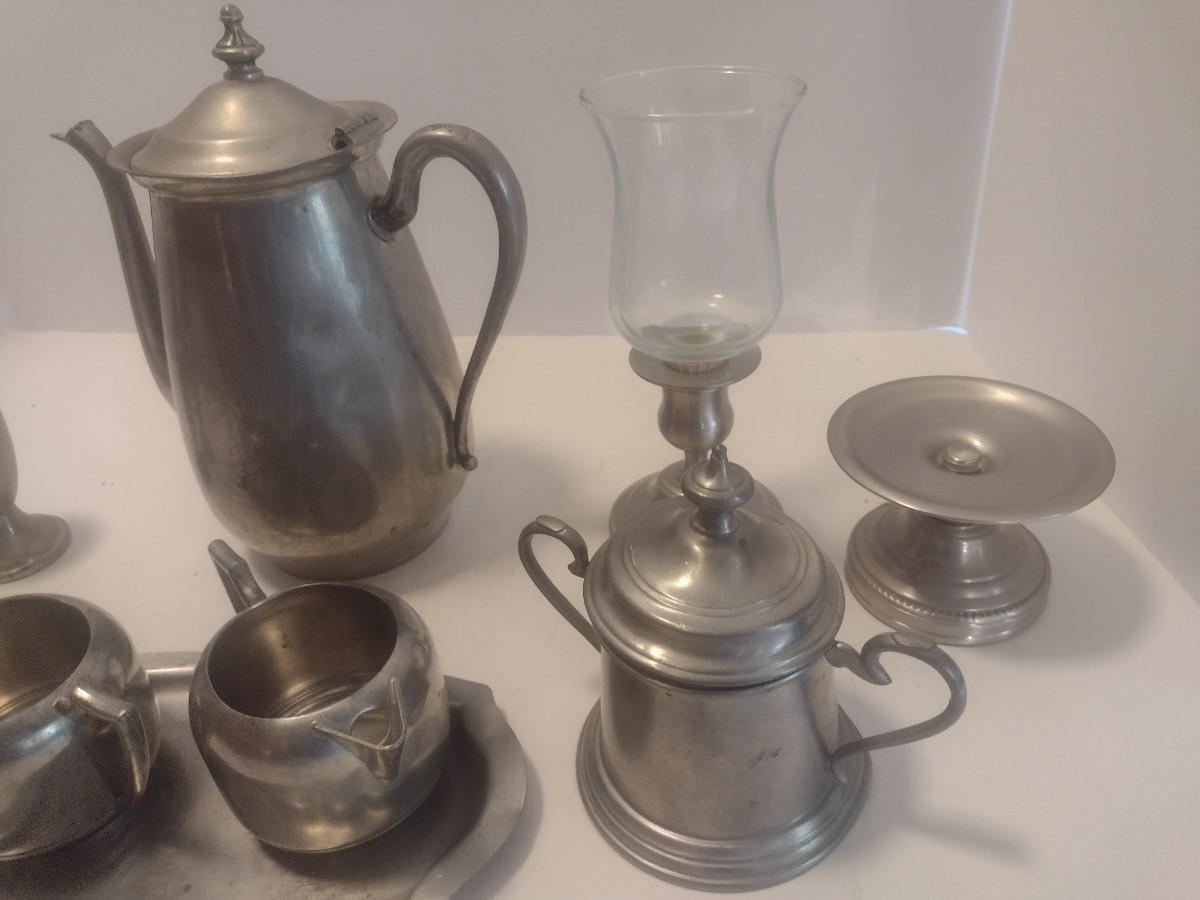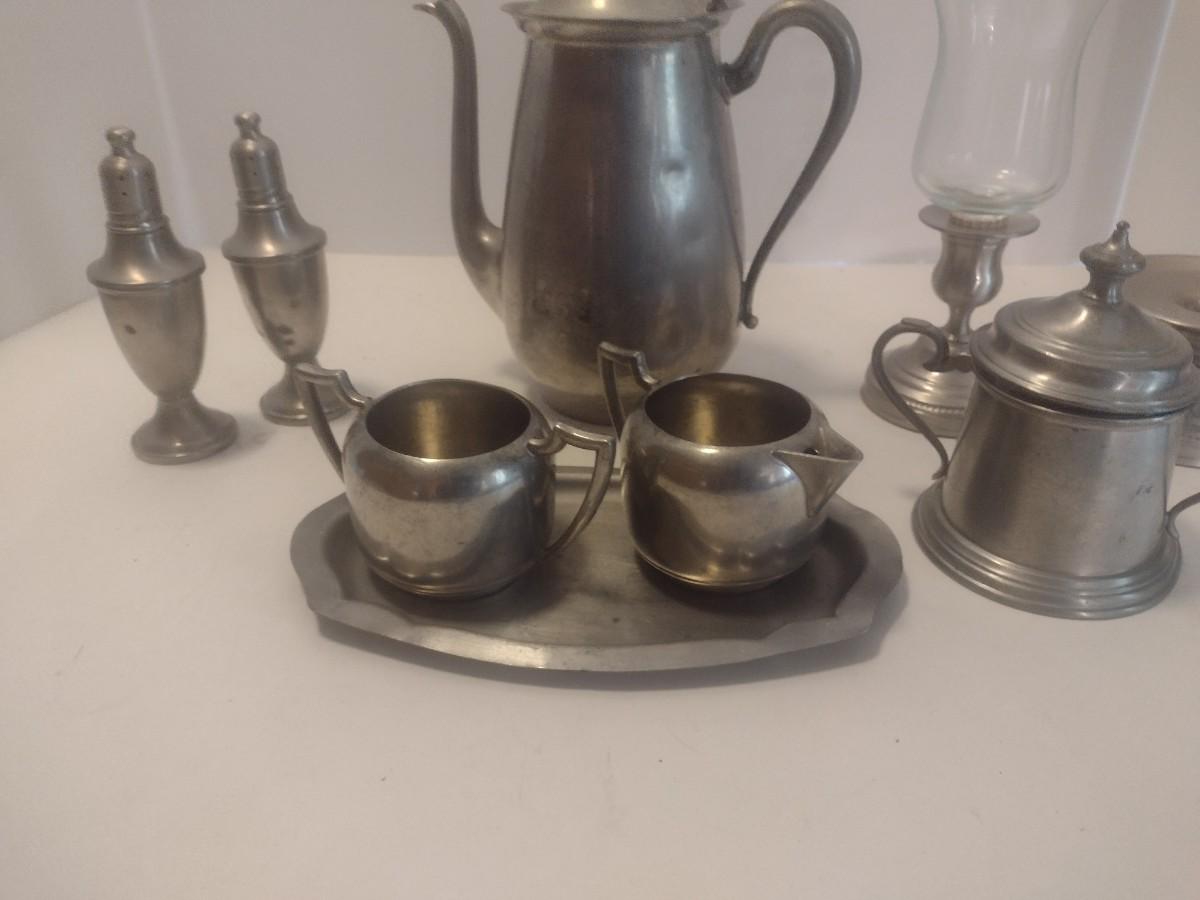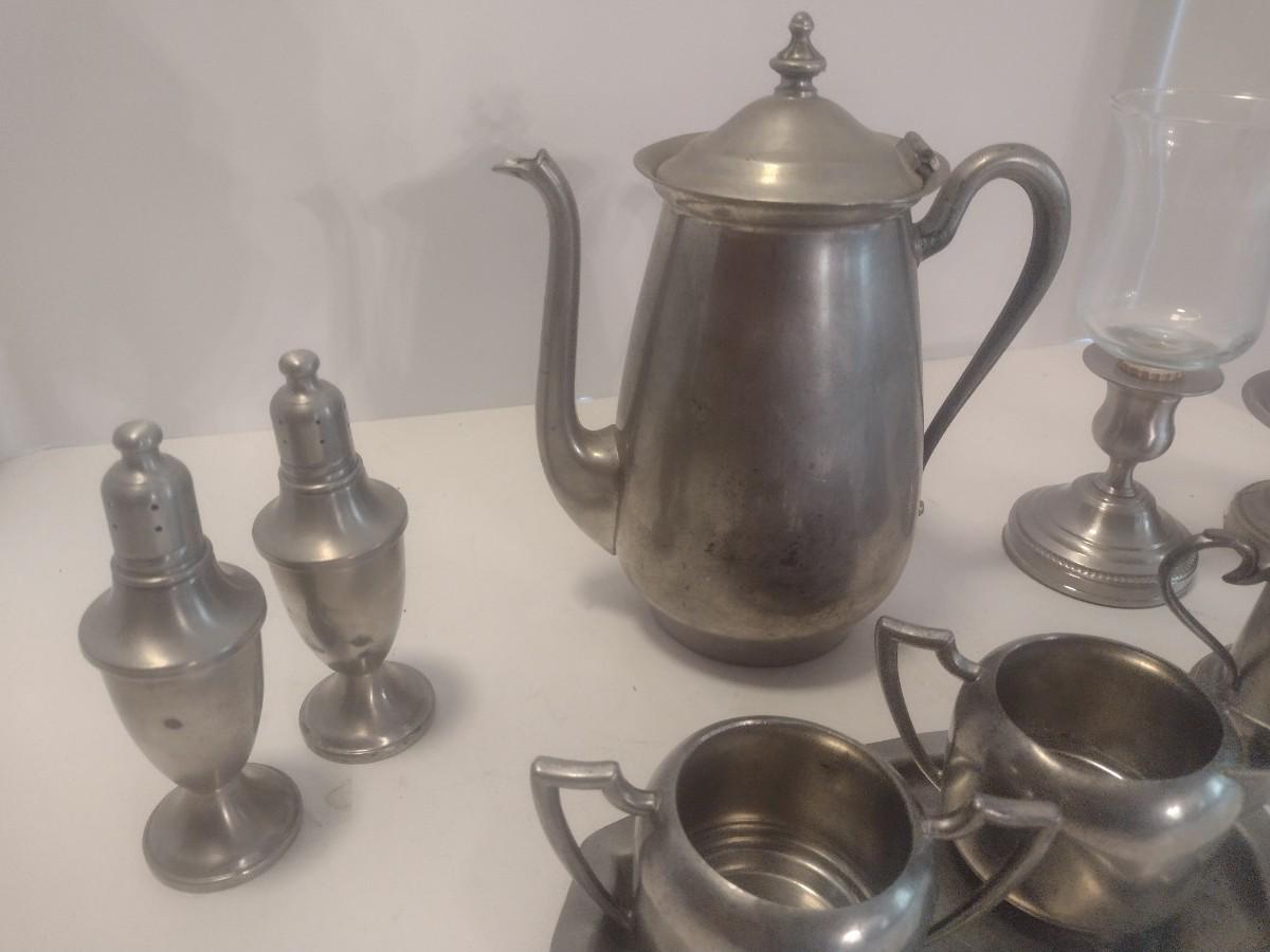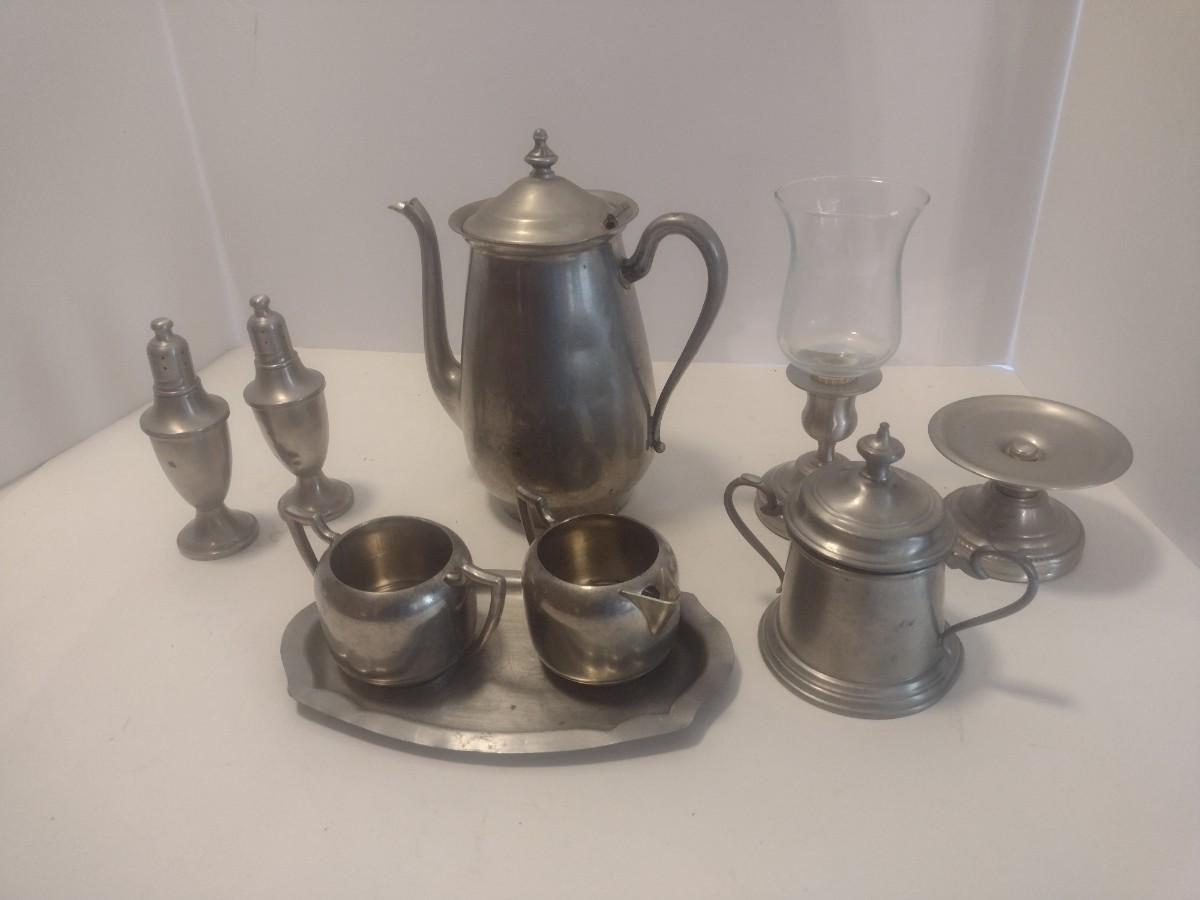 Assortment of Vintage Pewter Serve Ware Includes Tea Urn, Salt and Pepper Shaker, Creamer and Sugar Cups and Other