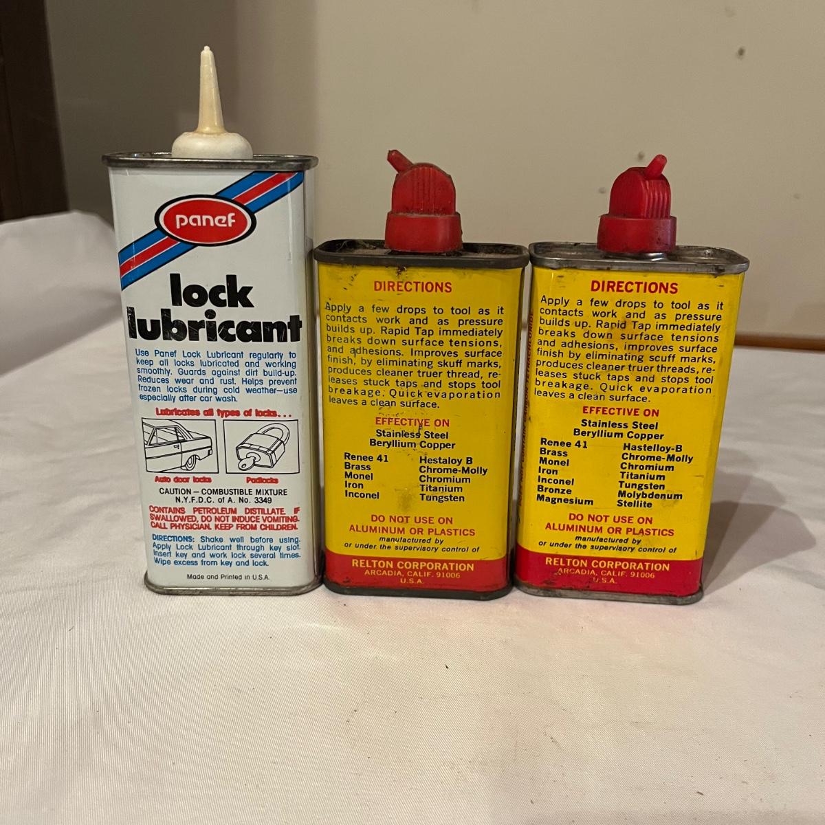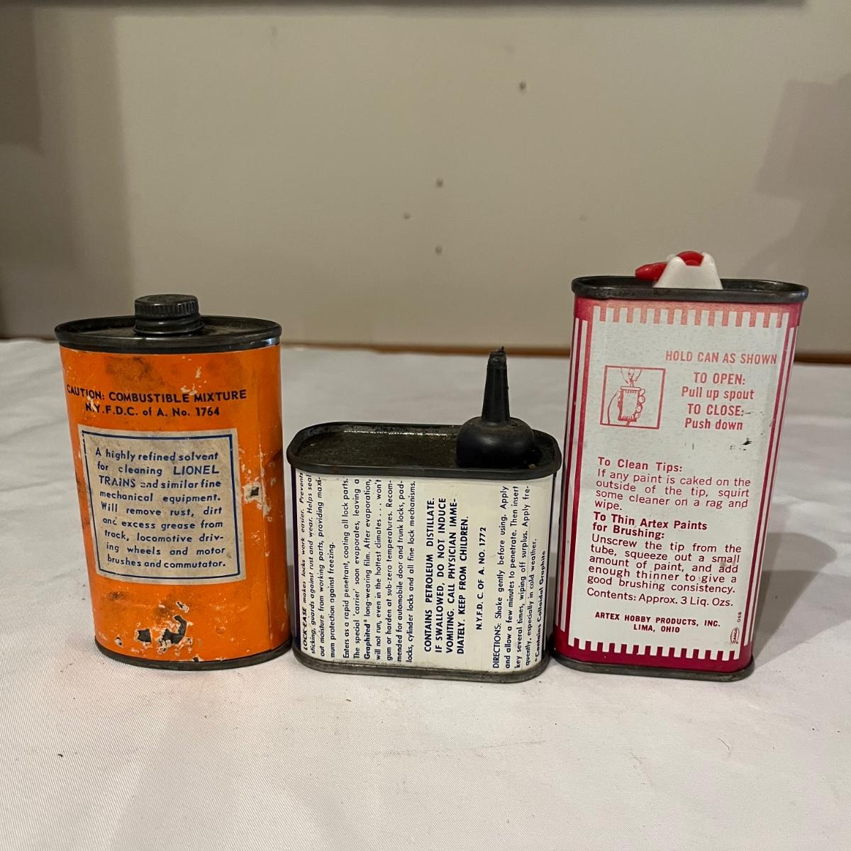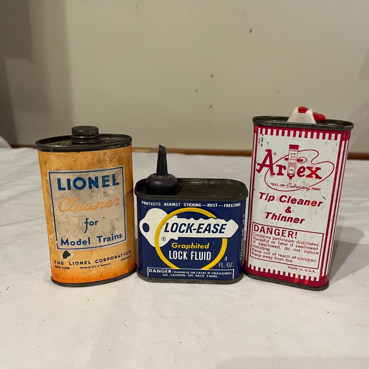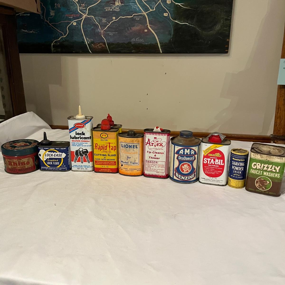 Lot includes Artex tip cleaner tin, Sta-Bil tin, Lock-Ease tin, A-M-R Benzine tin, two Rapid Tap cutting fluid tins, Grizzly faucet washers tin, Panef lock lubricant tin, Lionel cleaner tin, Panef Lock lubricant tin and a Remington shaving stick container.