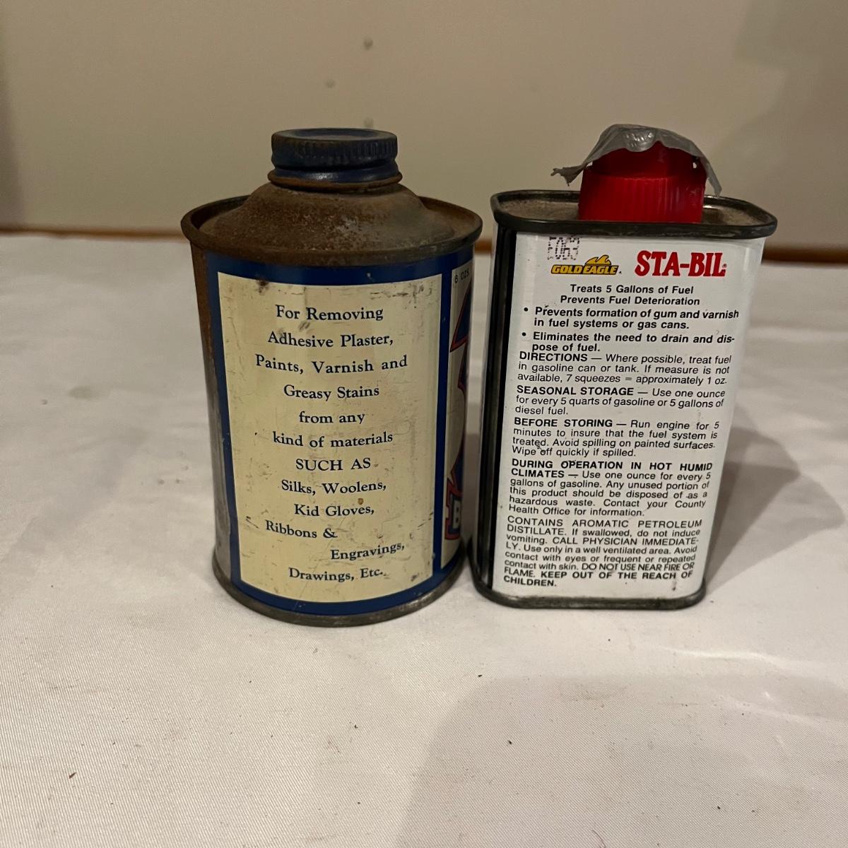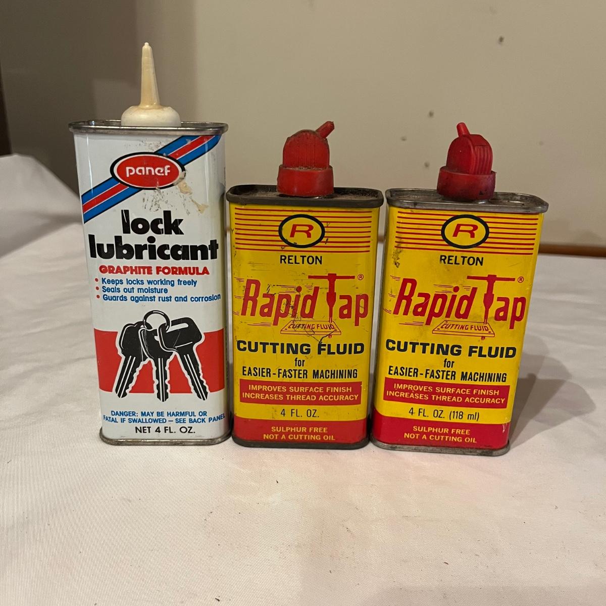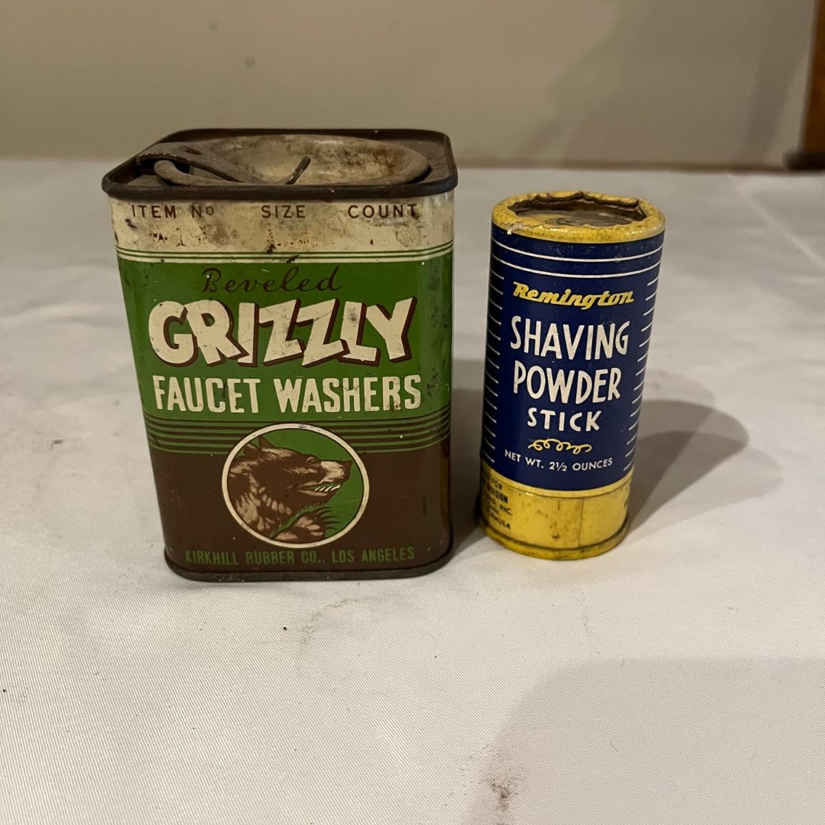 Lot includes Artex tip cleaner tin, Sta-Bil tin, Lock-Ease tin, A-M-R Benzine tin, two Rapid Tap cutting fluid tins, Grizzly faucet washers tin, Panef lock lubricant tin, Lionel cleaner tin, Panef Lock lubricant tin and a Remington shaving stick container.